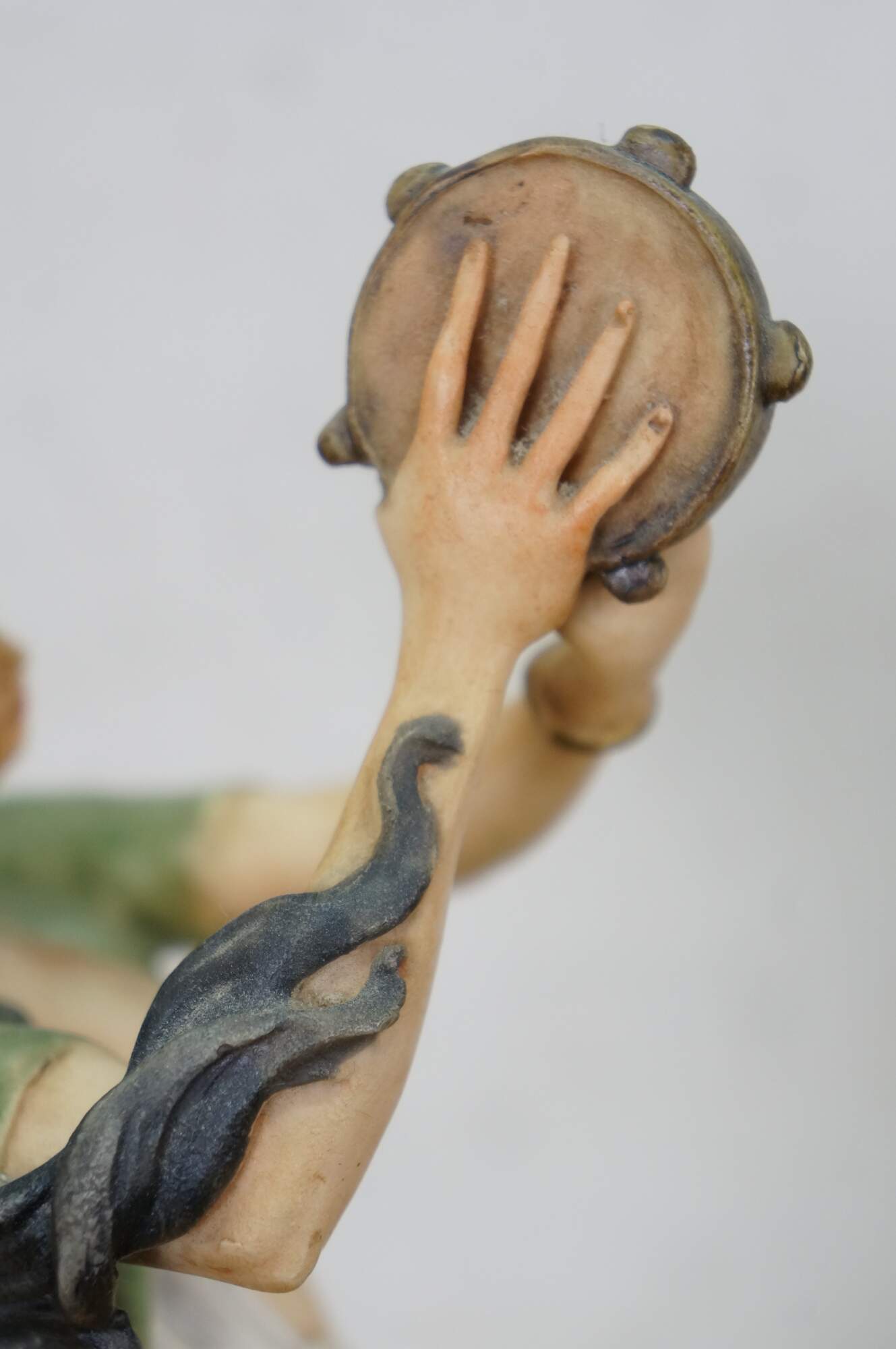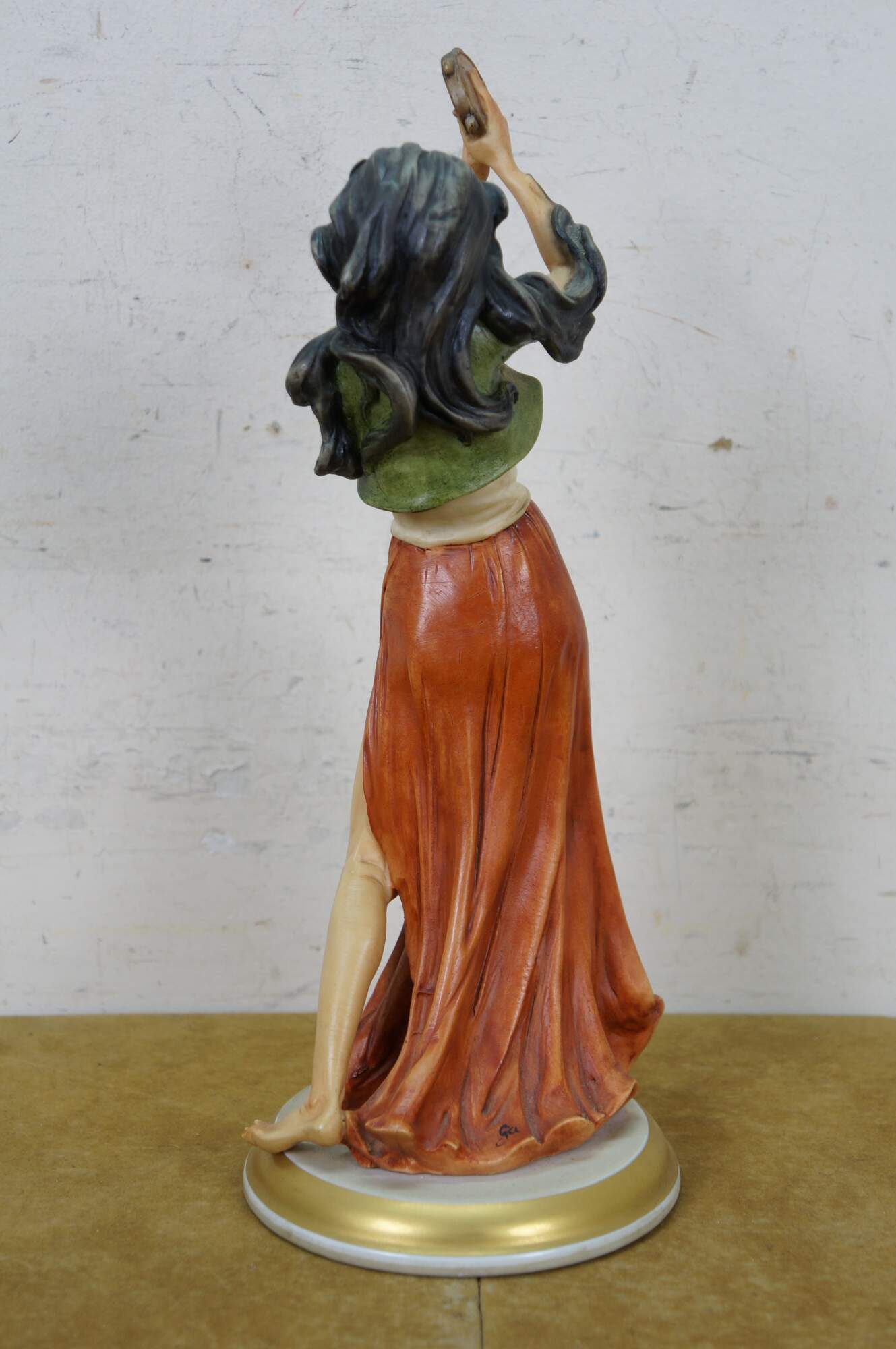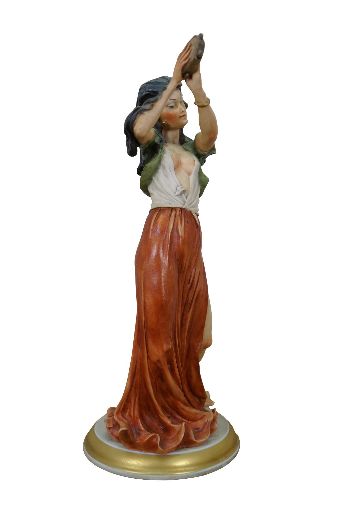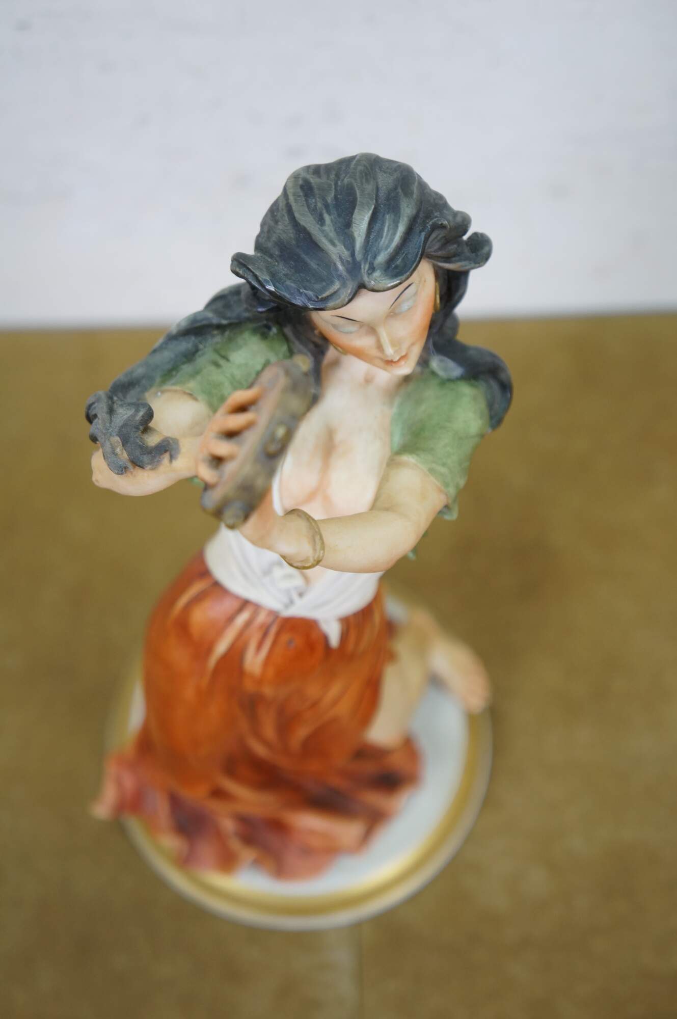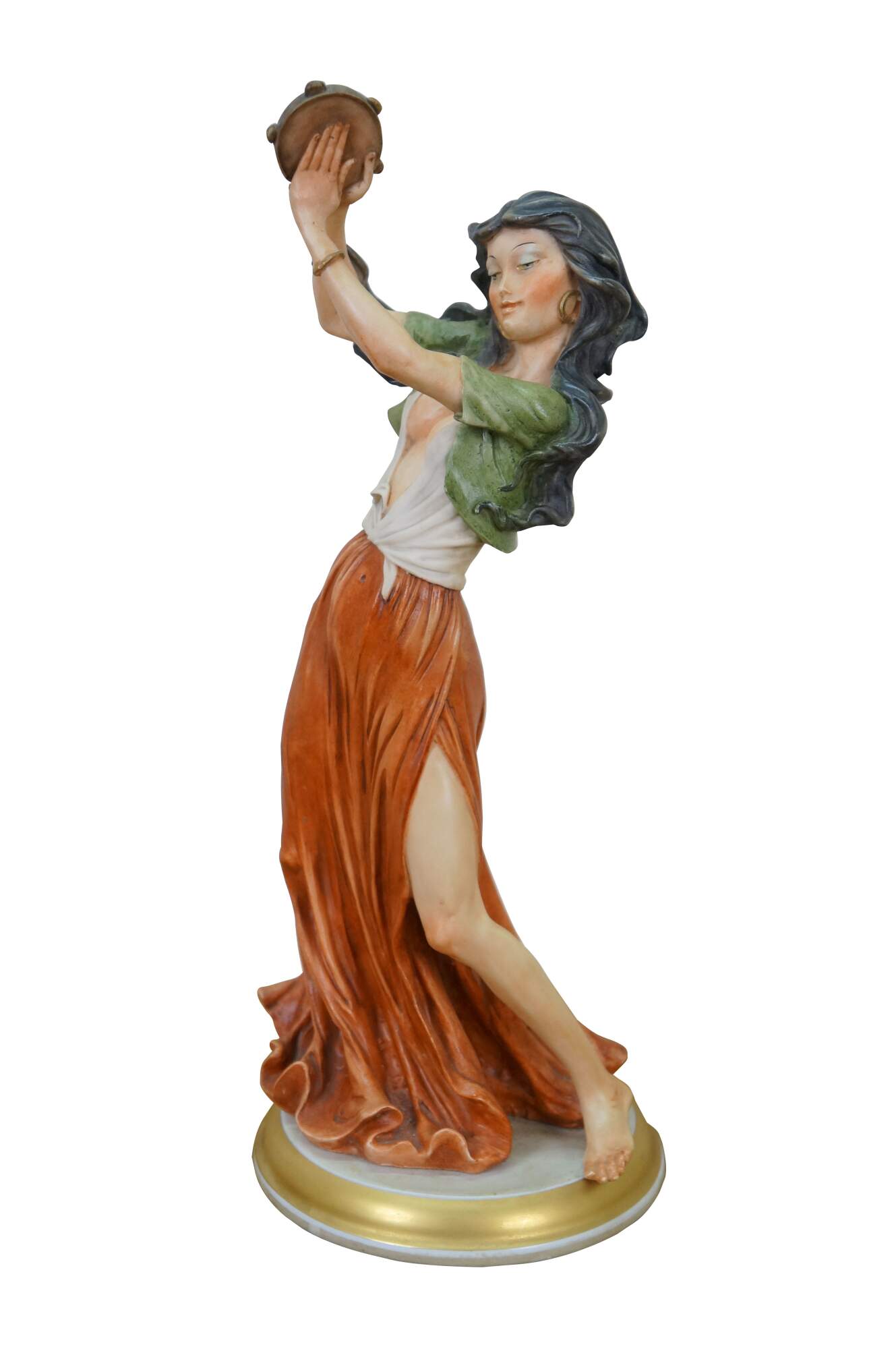 Vintage 20th-century Italian Capodimonte Gypsy Dancer figurine designed by Giuseppe Armani (b. 1935 - d. 2006). Depicts a woman with dark hair, green jacket, open shirt, and red skirt, dancing and playing a tambourine on a white and gold base. Skirt marked with initials GA and capodimonte crown-N mark. Crown-N mark also on base.