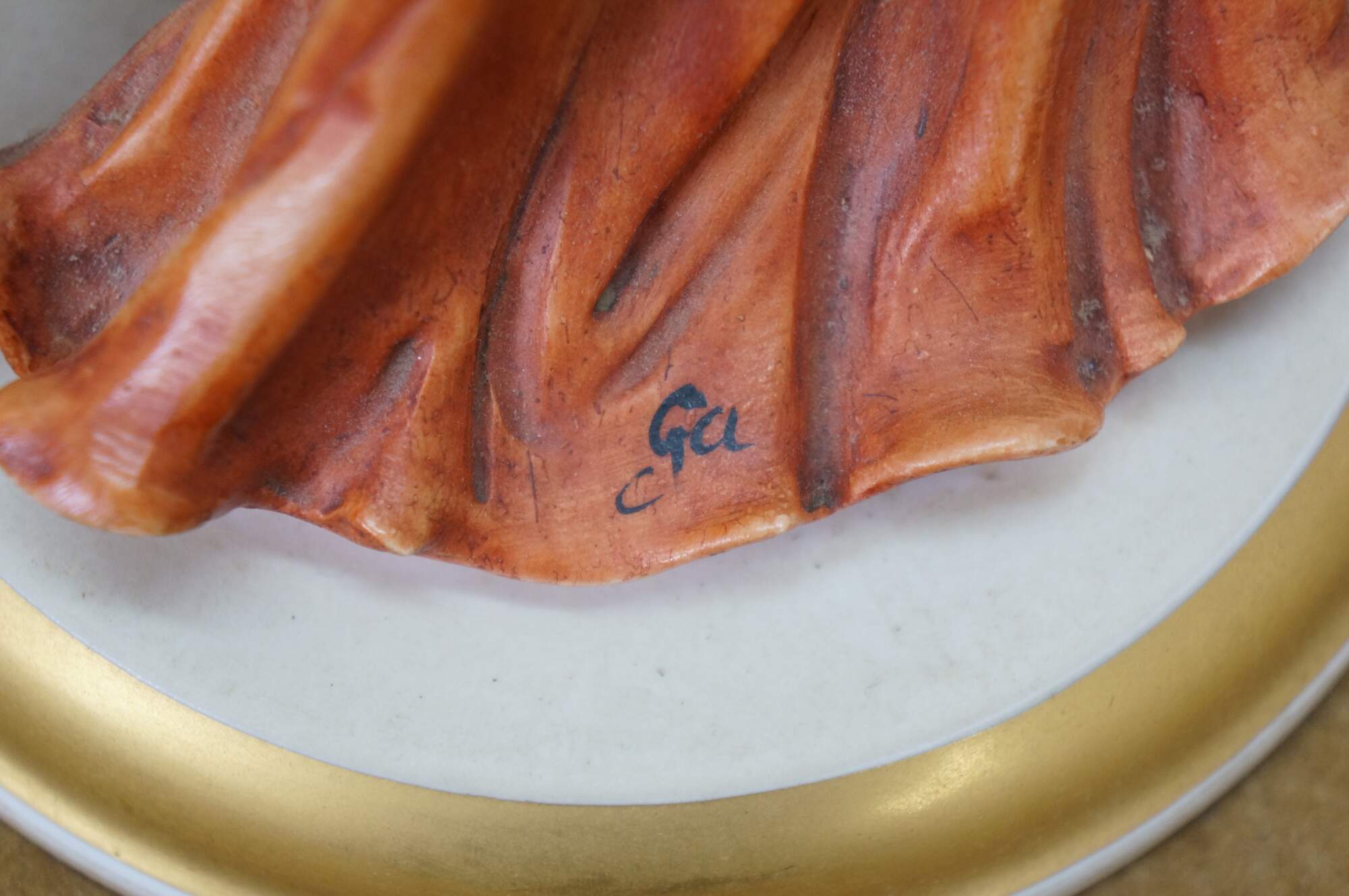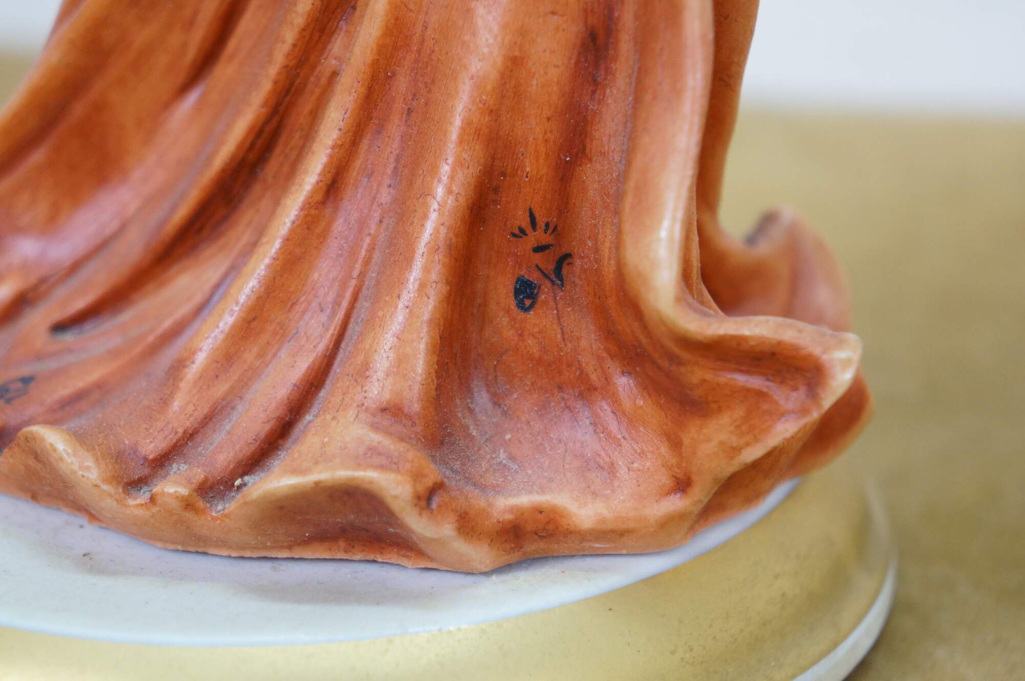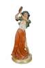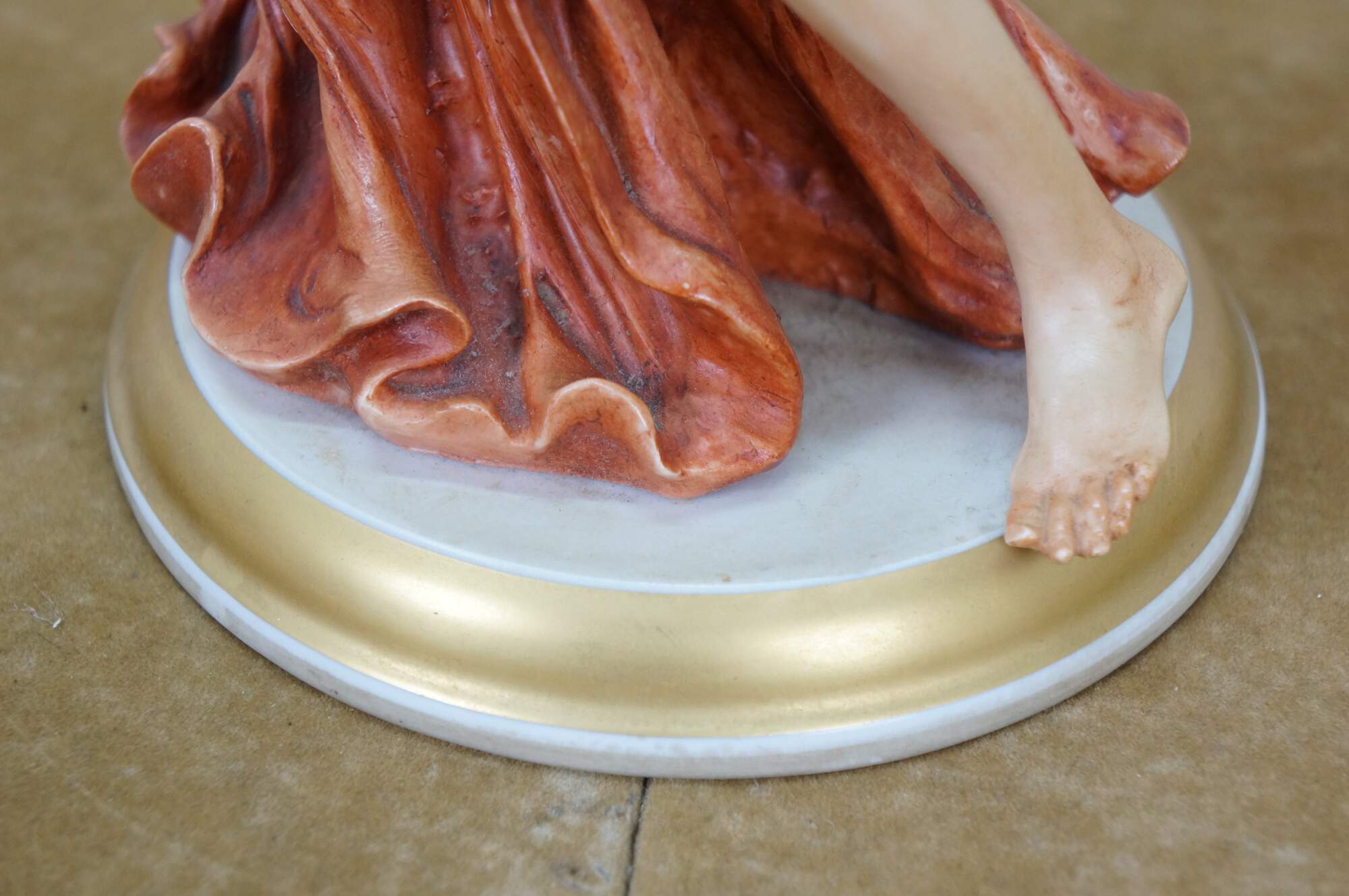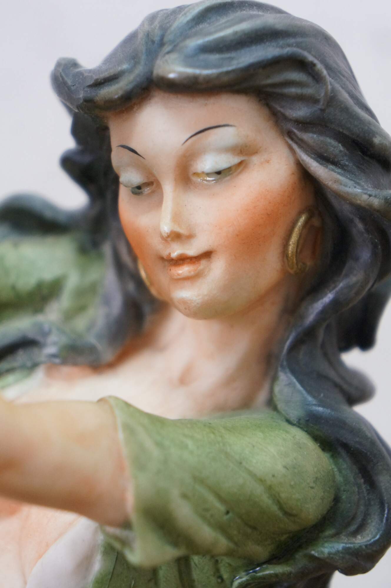 Vintage 20th-century Italian Capodimonte Gypsy Dancer figurine designed by Giuseppe Armani (b. 1935 - d. 2006). Depicts a woman with dark hair, green jacket, open shirt, and red skirt, dancing and playing a tambourine on a white and gold base. Skirt marked with initials GA and capodimonte crown-N mark. Crown-N mark also on base.