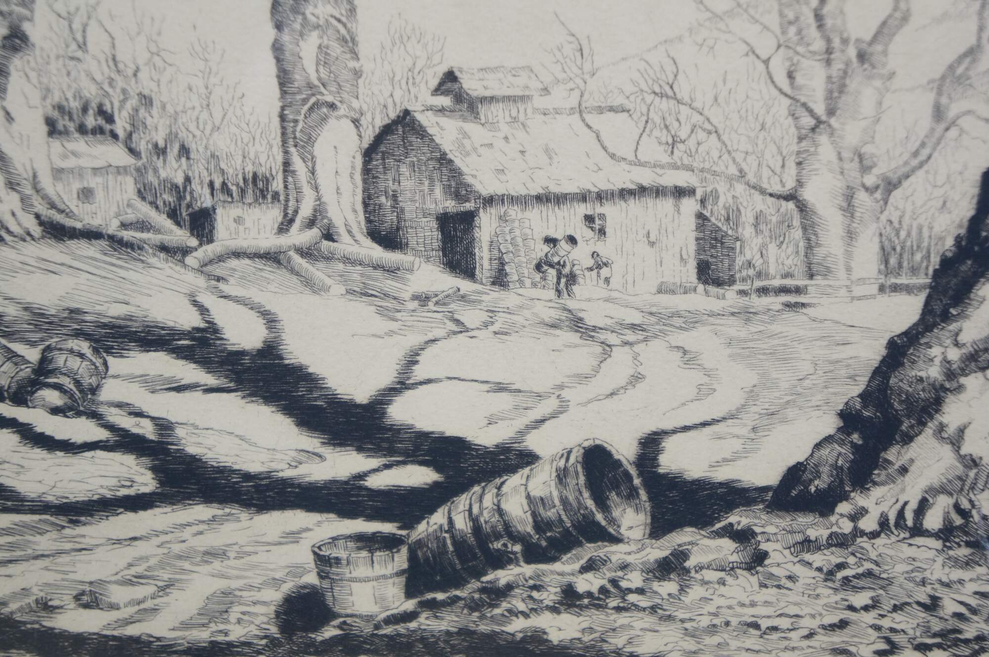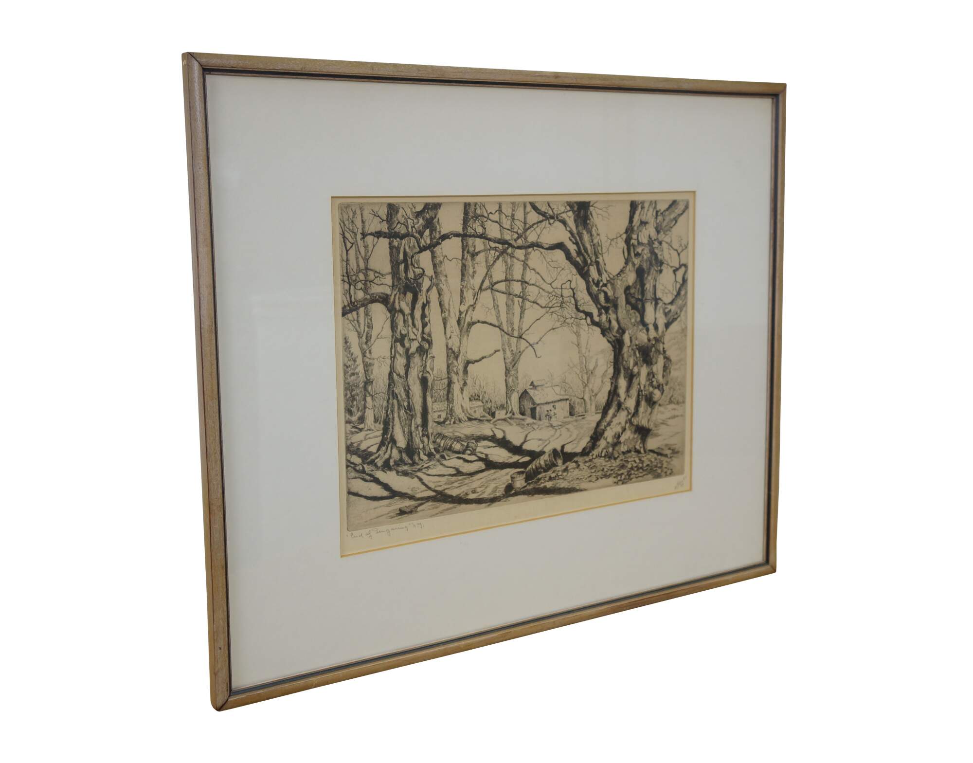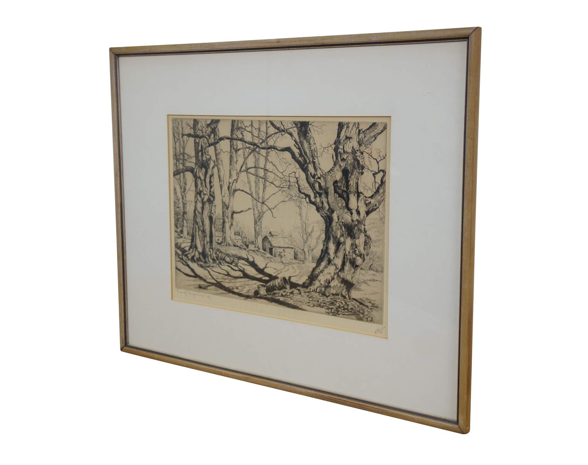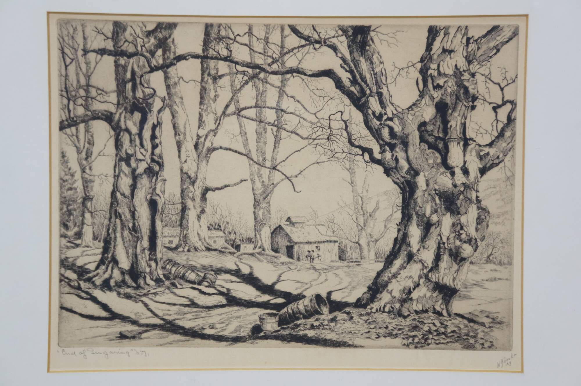 Antique 1930's limited edition black and white etching titled "End of Sugaring" by Walter Ronald Locke. Depicts a forest landscape with stacks of buckets laying beside sugar maple trees, with figures approaching a barn in the distance. Pencil titled, signed, and dated '39, lower edge. Published by Associated American Artists. Wood frame with black detail; white mat; original label on back.