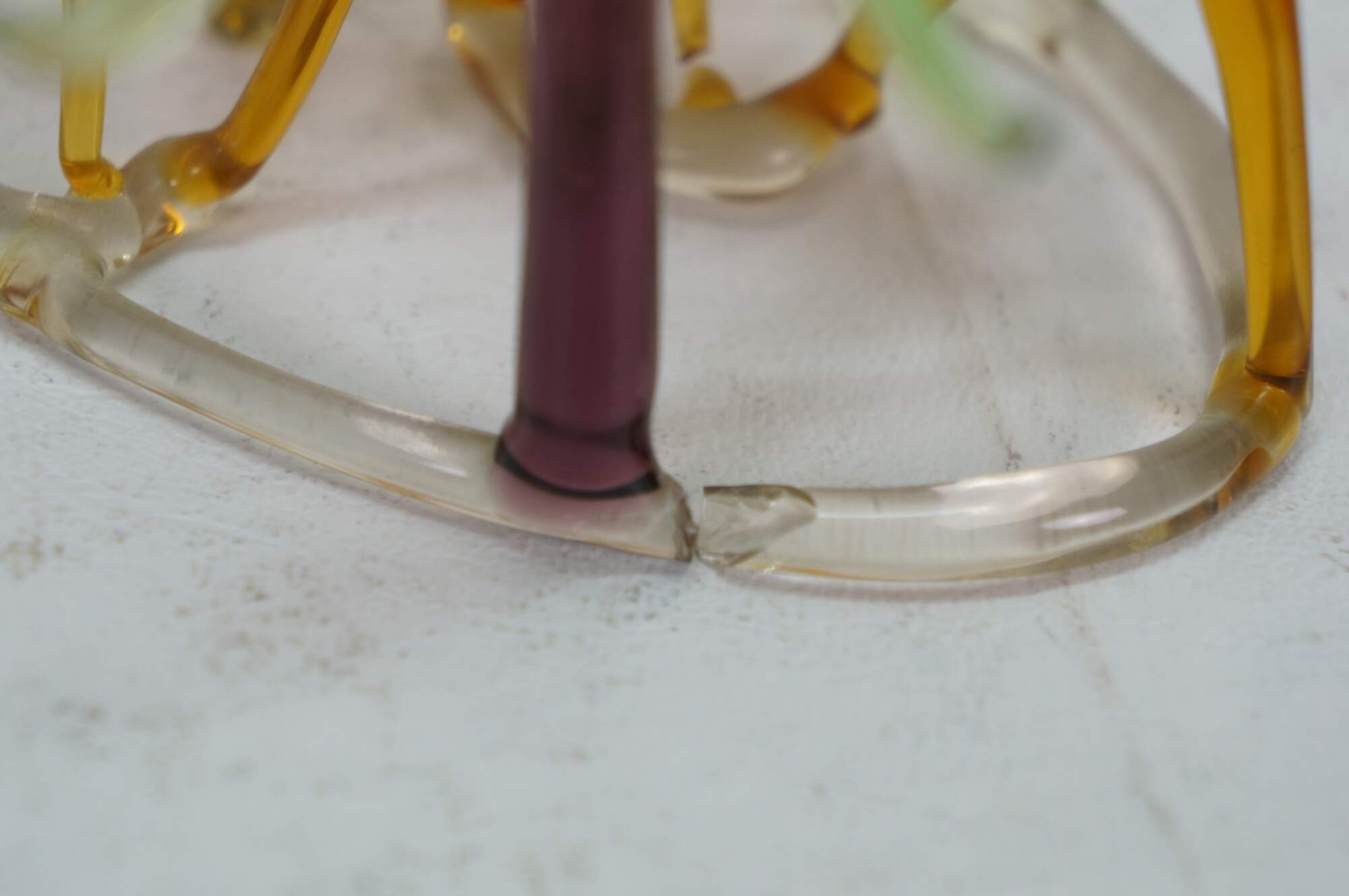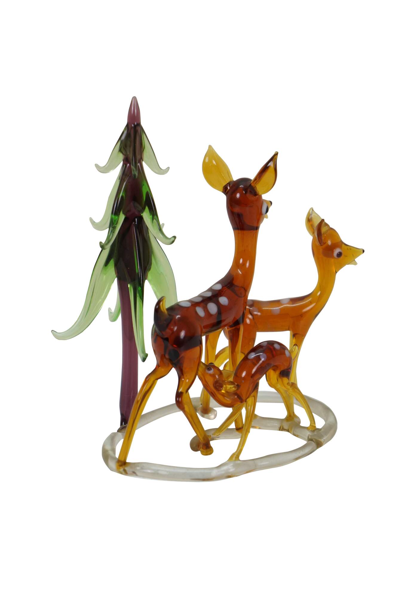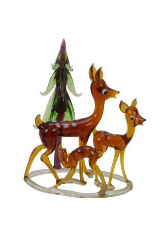 Mid to late 20th century hand blown art glass figurine in the shape of a mother deer and pair of fawns, standing next to a pine tree. Christmas. Bambi.