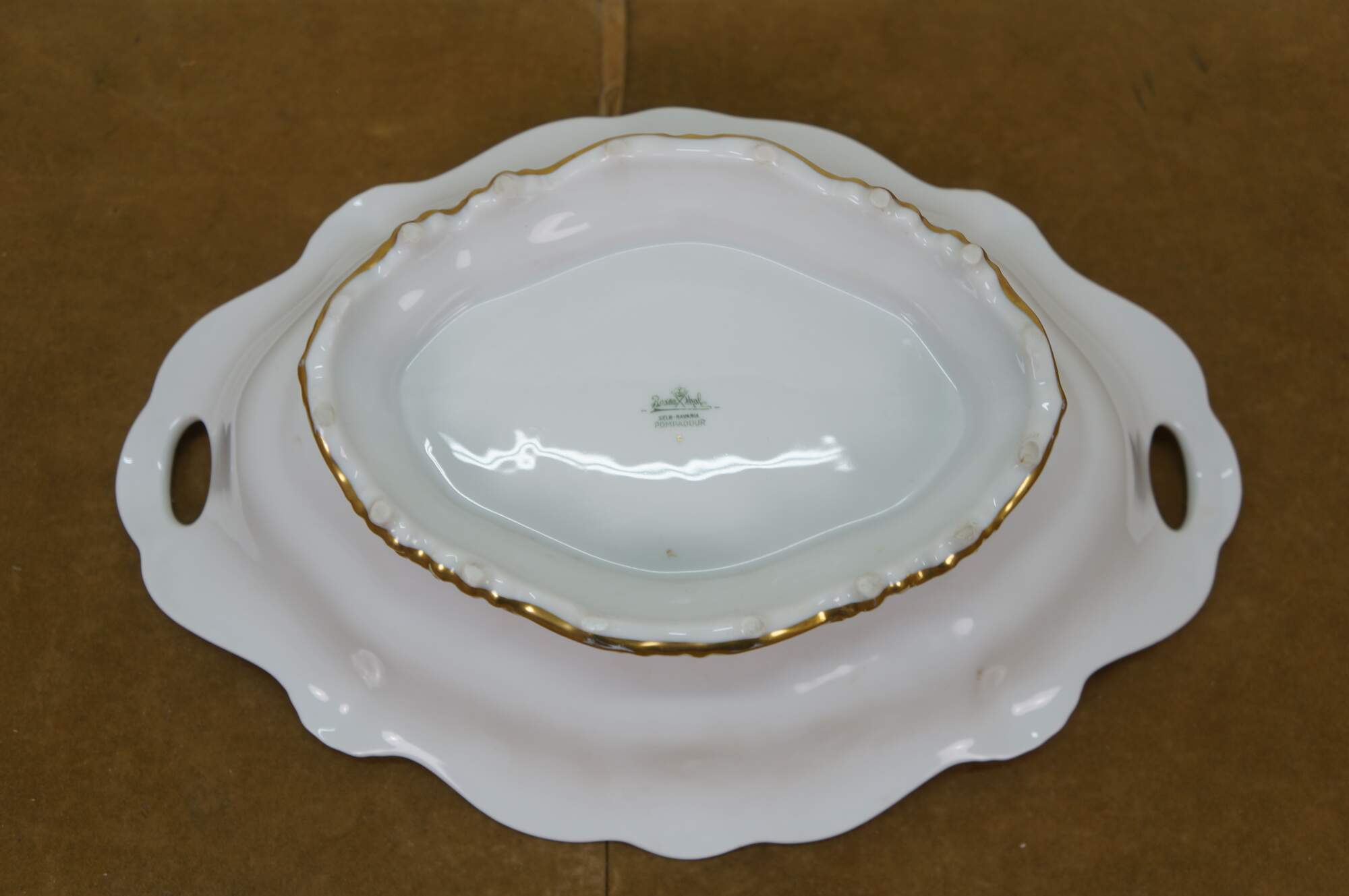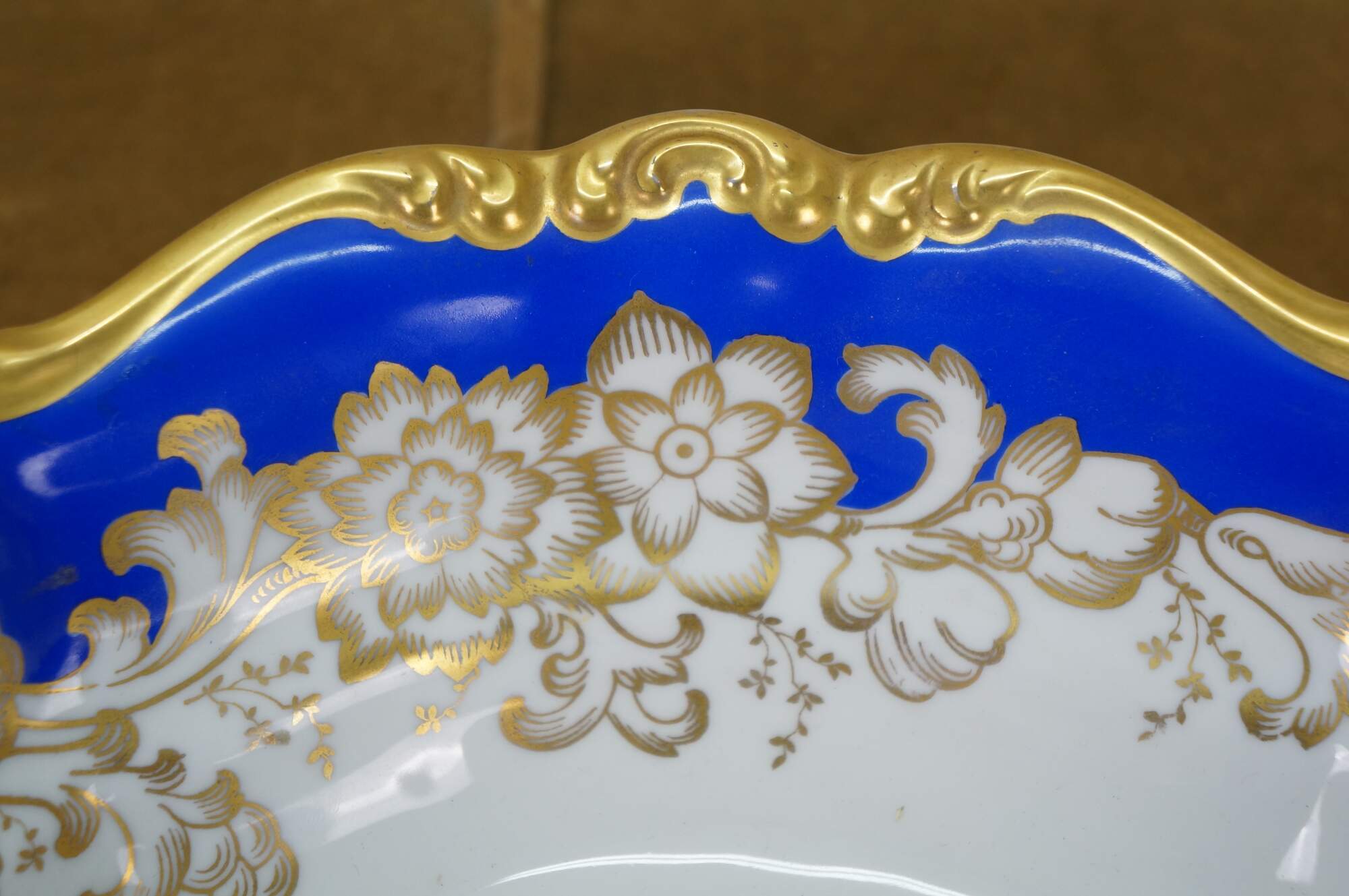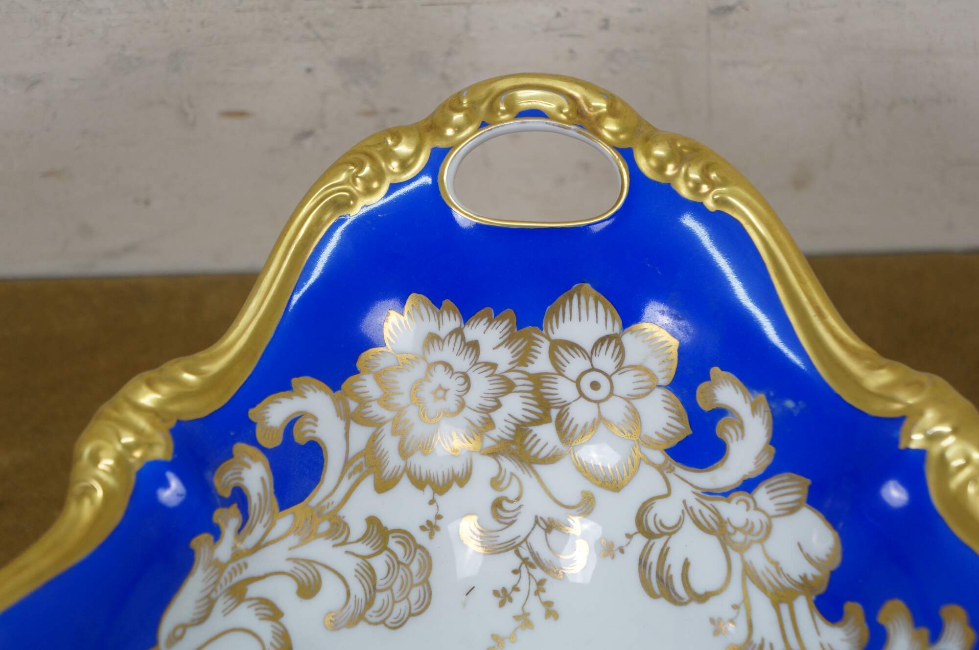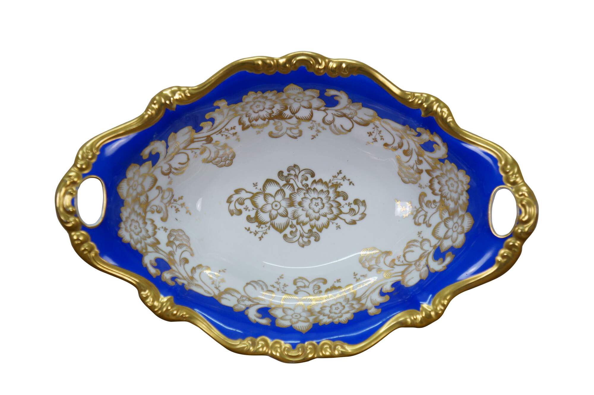 Antique 1933 Rosenthal Pompadour porcelain centerpiece / serving dish. Oval shape with scalloped edge, footed base, pierced handles, decorated with gilt flowers and trim around a deep blue border.