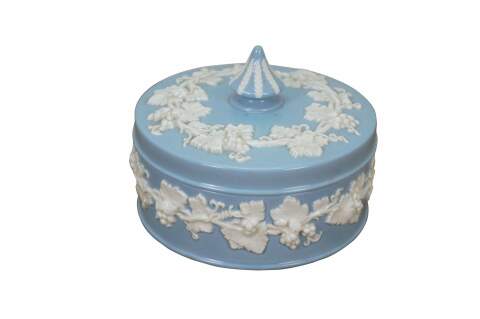 Vintage 20th century Wedgwood embossed queensware lidded powder dish / candy / trinket box. Light blue / lavender glazed ceramic embossed with white grapevines.