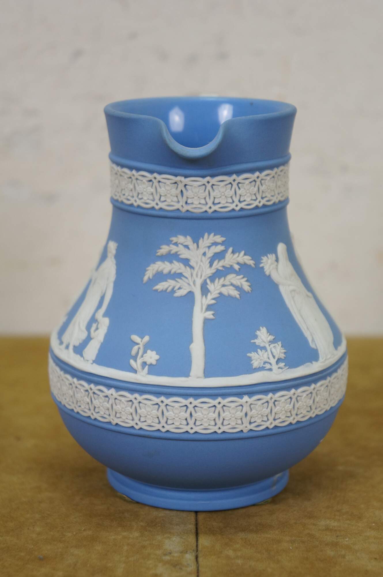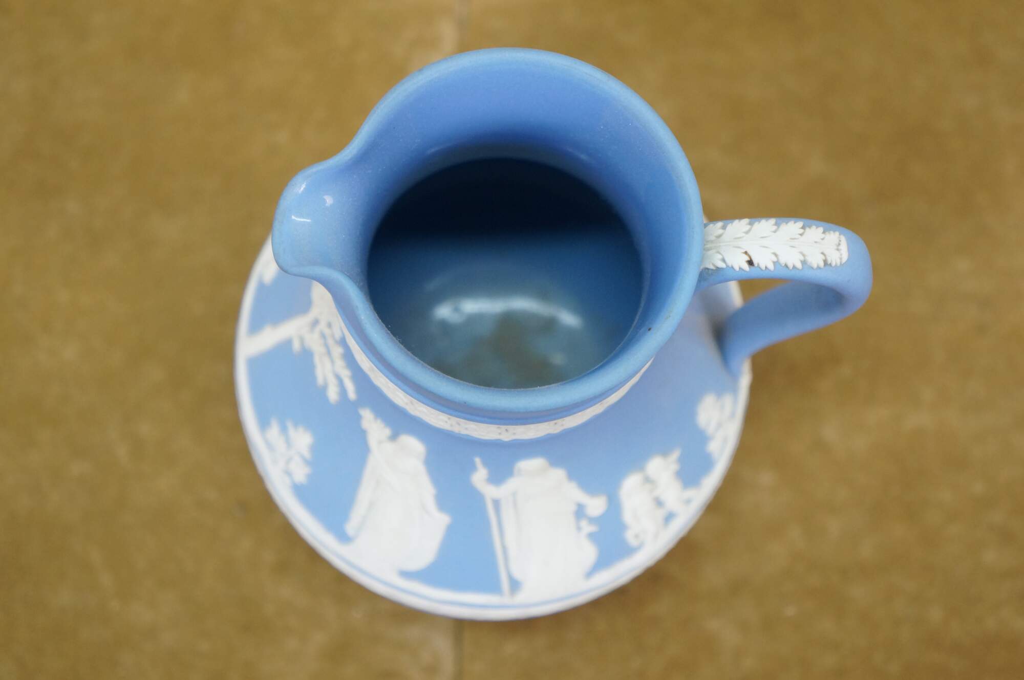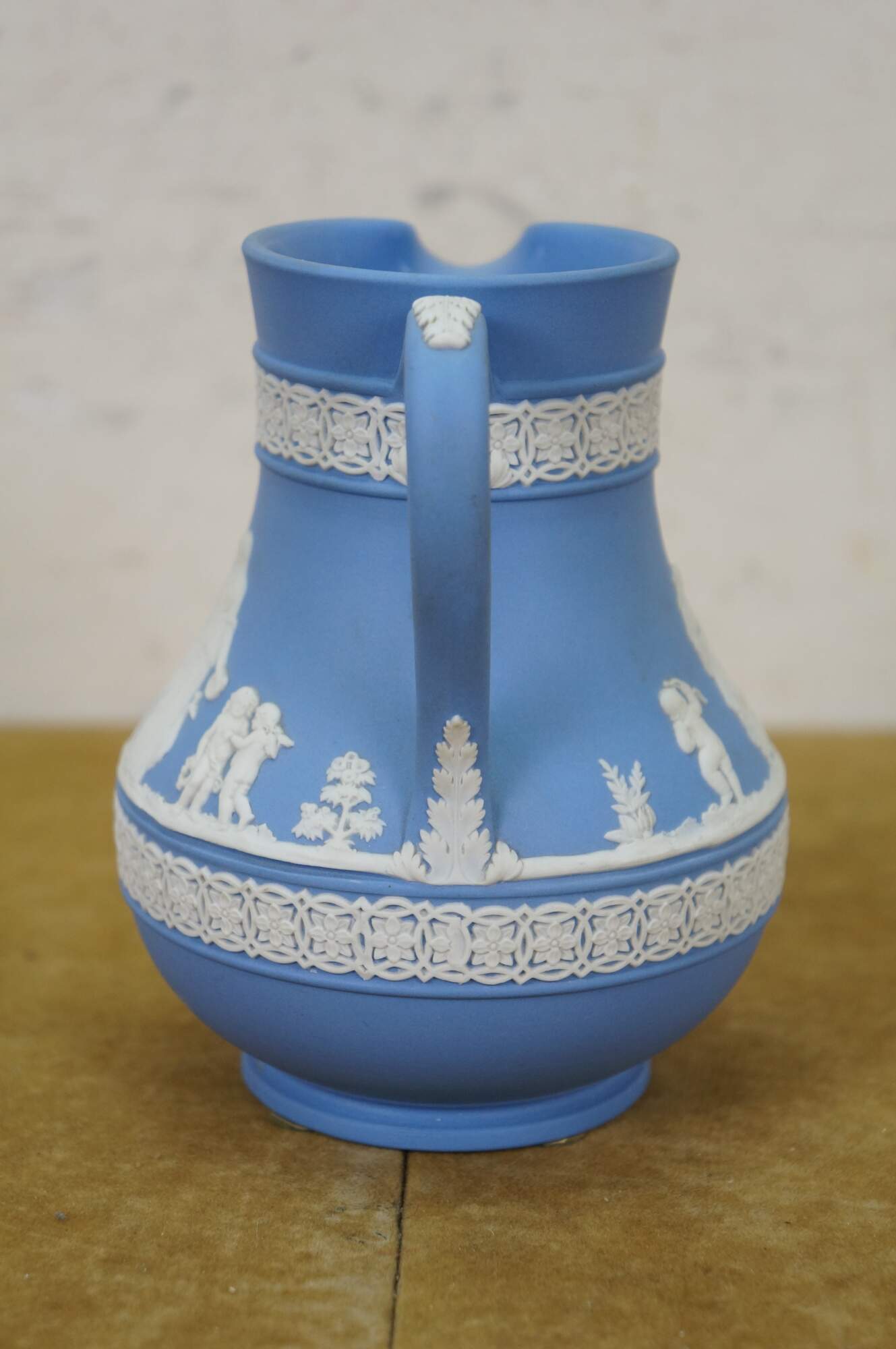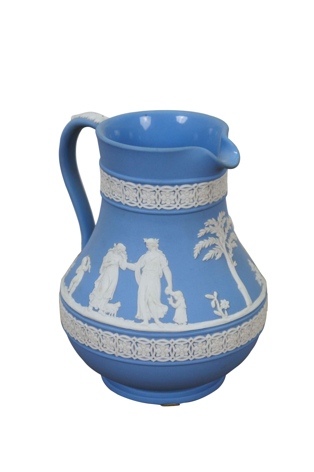 Vintage 20th century Wedgwood Etruscan cream pitcher. Lavender / light blue jasperware ceramic embossed with neoclassical figures and interlocking patterns in white.