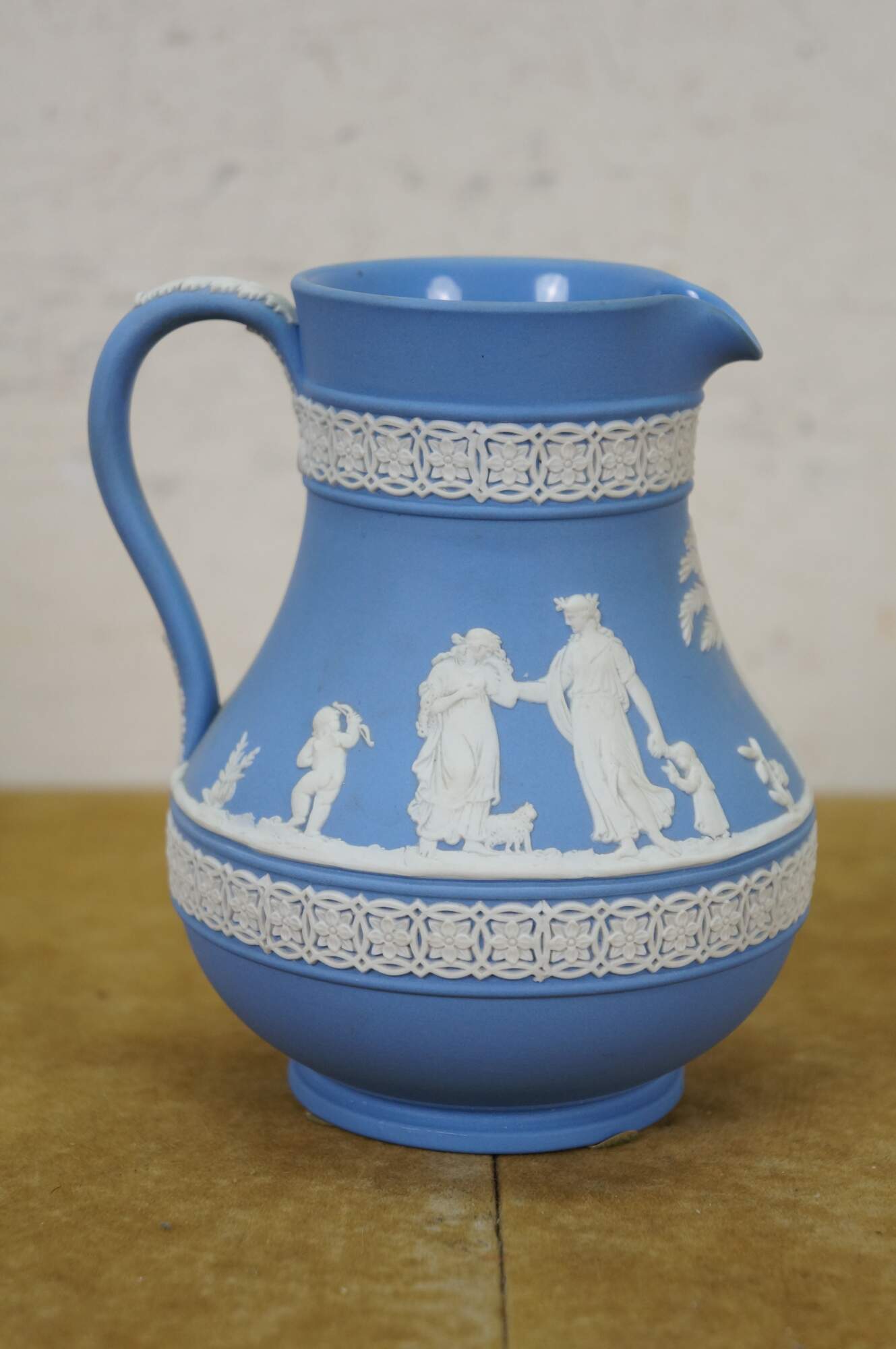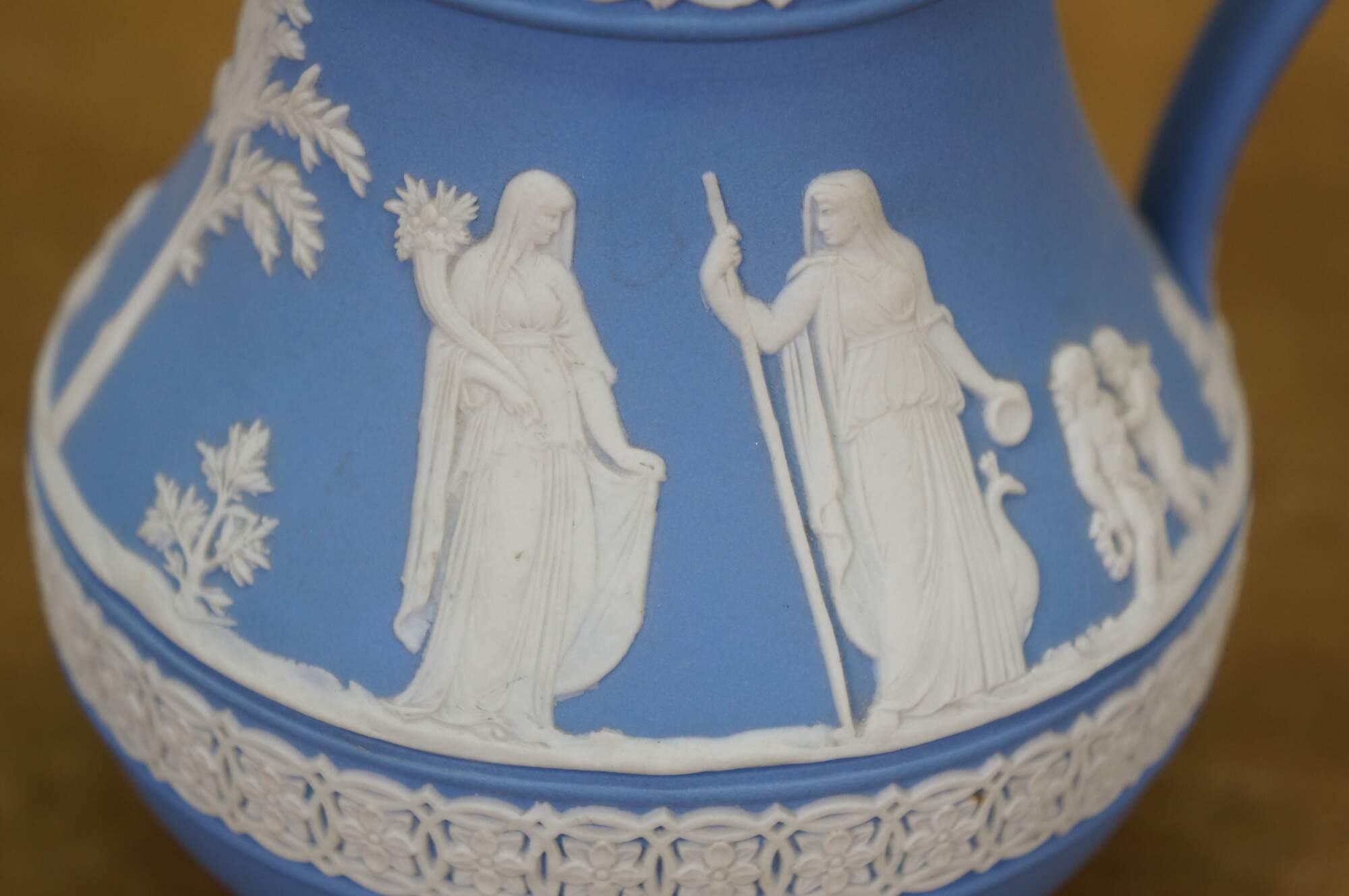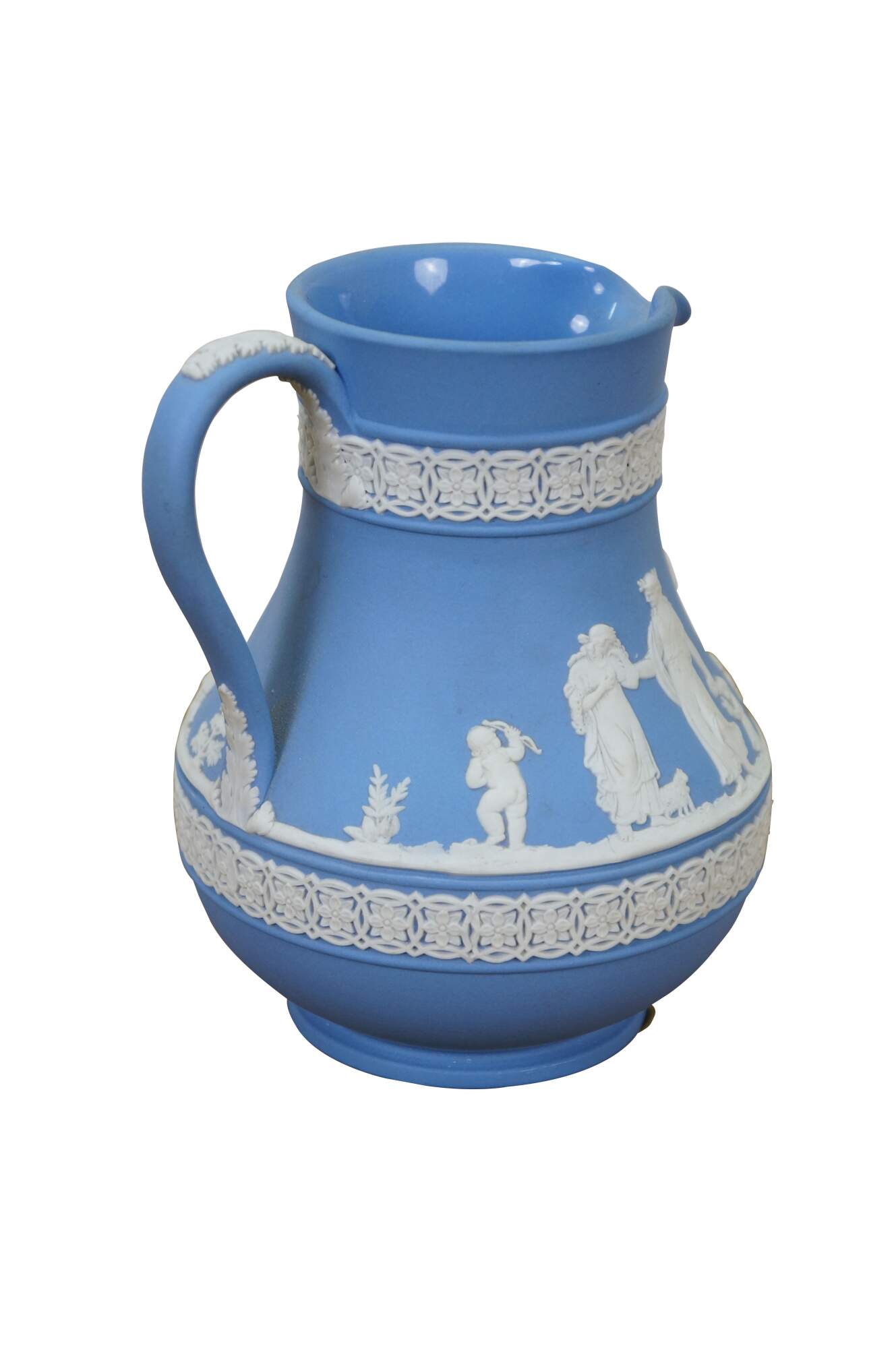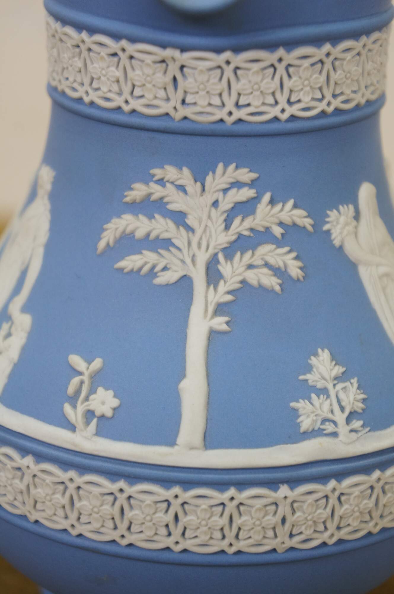 Vintage 20th century Wedgwood Etruscan cream pitcher. Lavender / light blue jasperware ceramic embossed with neoclassical figures and interlocking patterns in white.