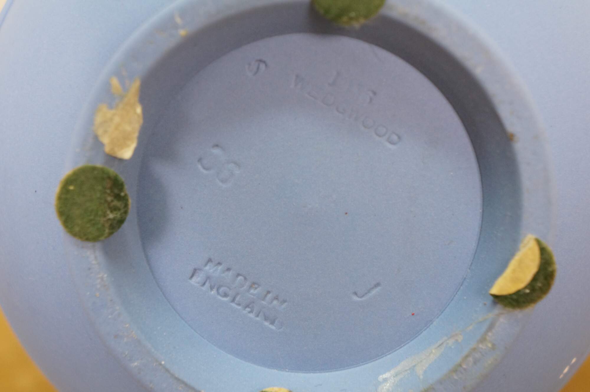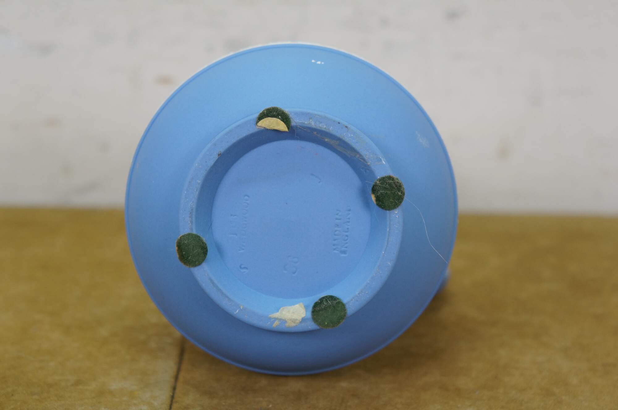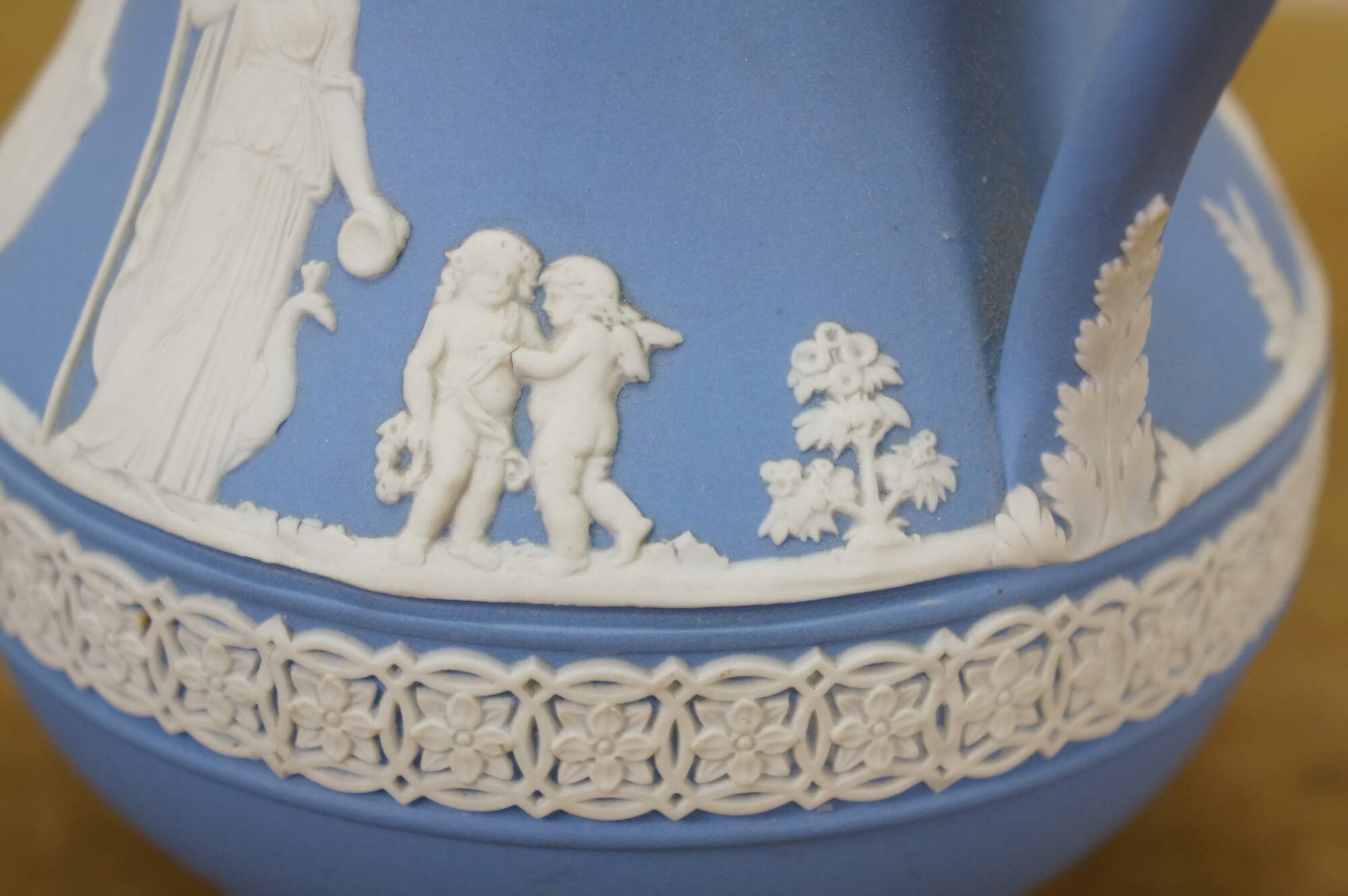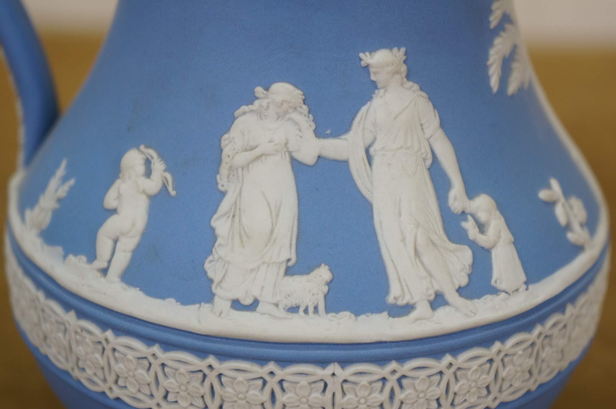 Vintage 20th century Wedgwood Etruscan cream pitcher. Lavender / light blue jasperware ceramic embossed with neoclassical figures and interlocking patterns in white.