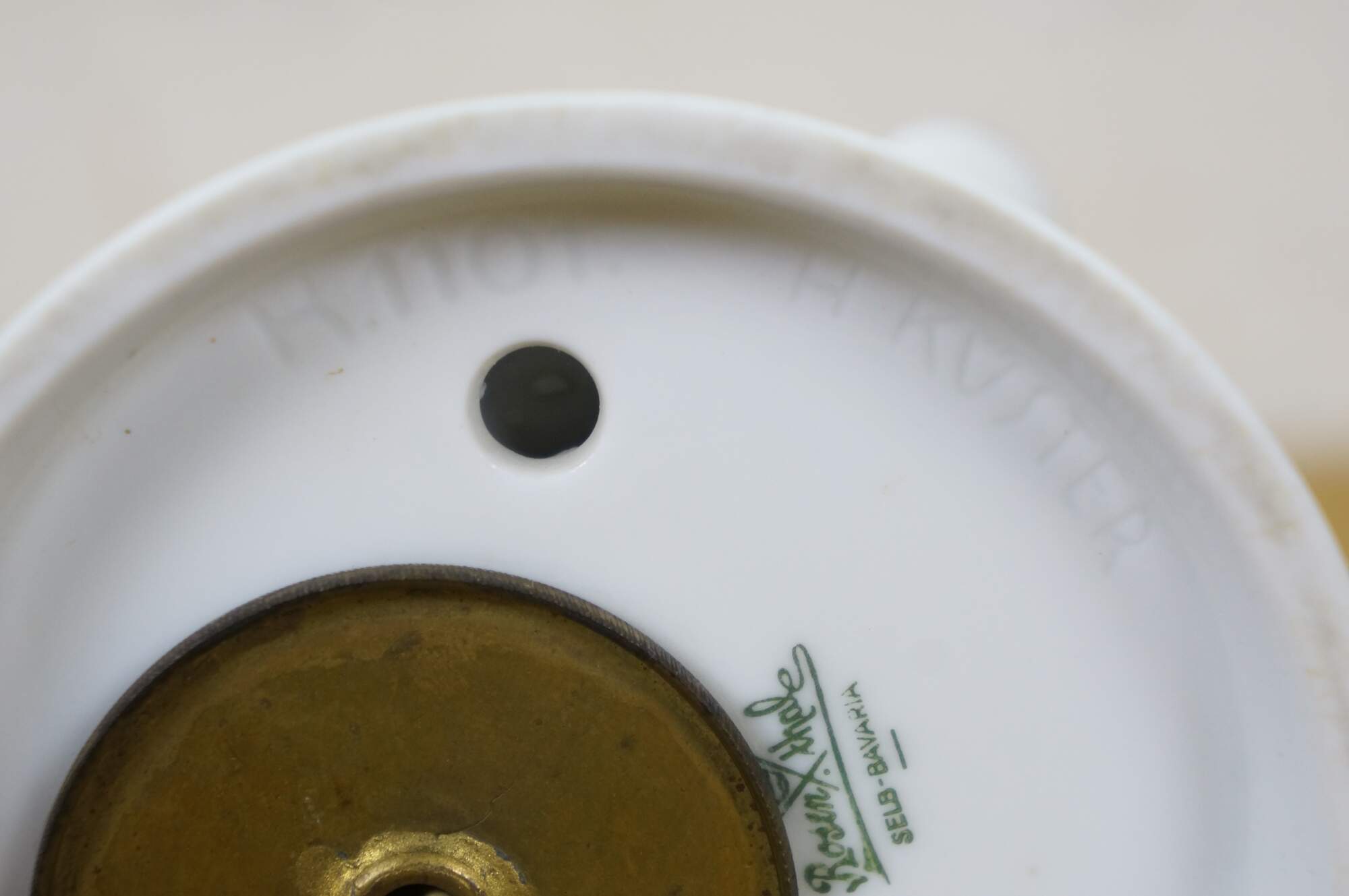 Rare antique Art Deco 1930 Rosenthal Grotesque Elephant Aroma diffuser figurine lamp designed by Hans Kuster. H1101. White porcelain circus / Indian style elephant seated upright on a round pedestal, painted with gold, blue, and yellow details, fringed eyes and pierced star on top of the head. Head removes to reveal a depression for inserting perfume oils, which are warmed by the bulb concealed inside the base.