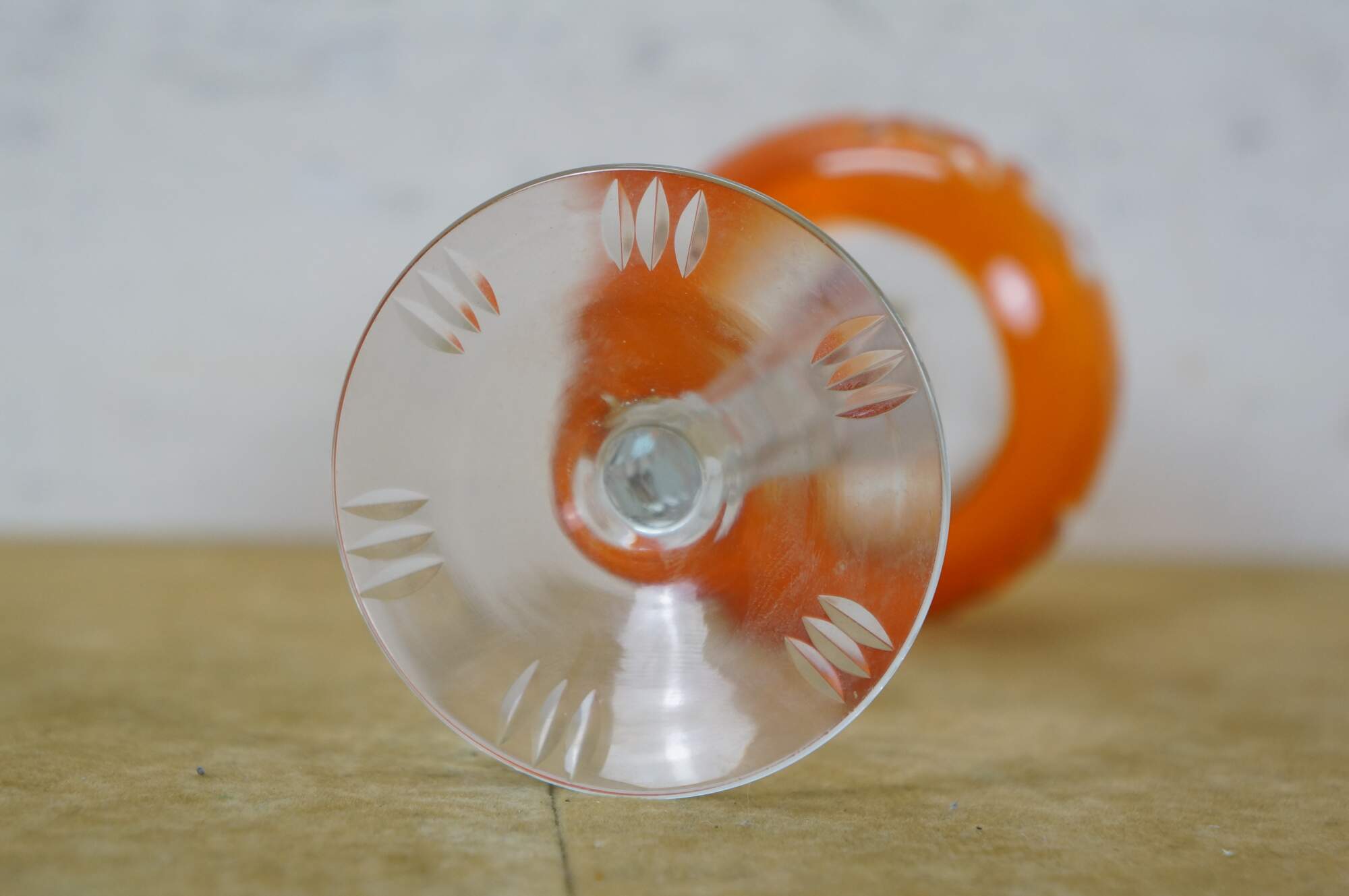 Single mid to late 20th century Bohemian / Czech orange cut to clear crystal wine glass / goblet, featuring a faceted stem and cut pattern of grapes, stars, wheat, and flowers on the bowl.