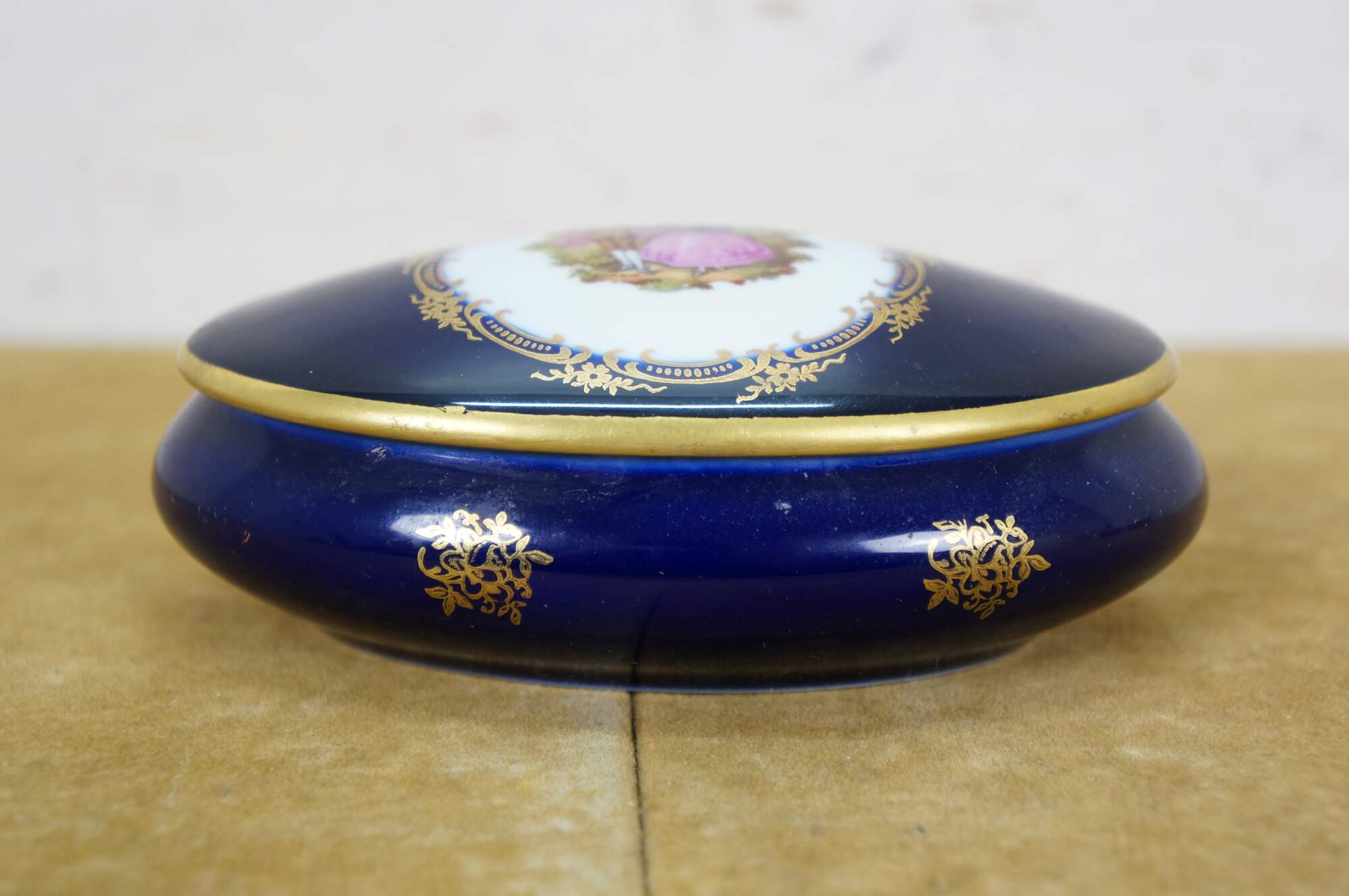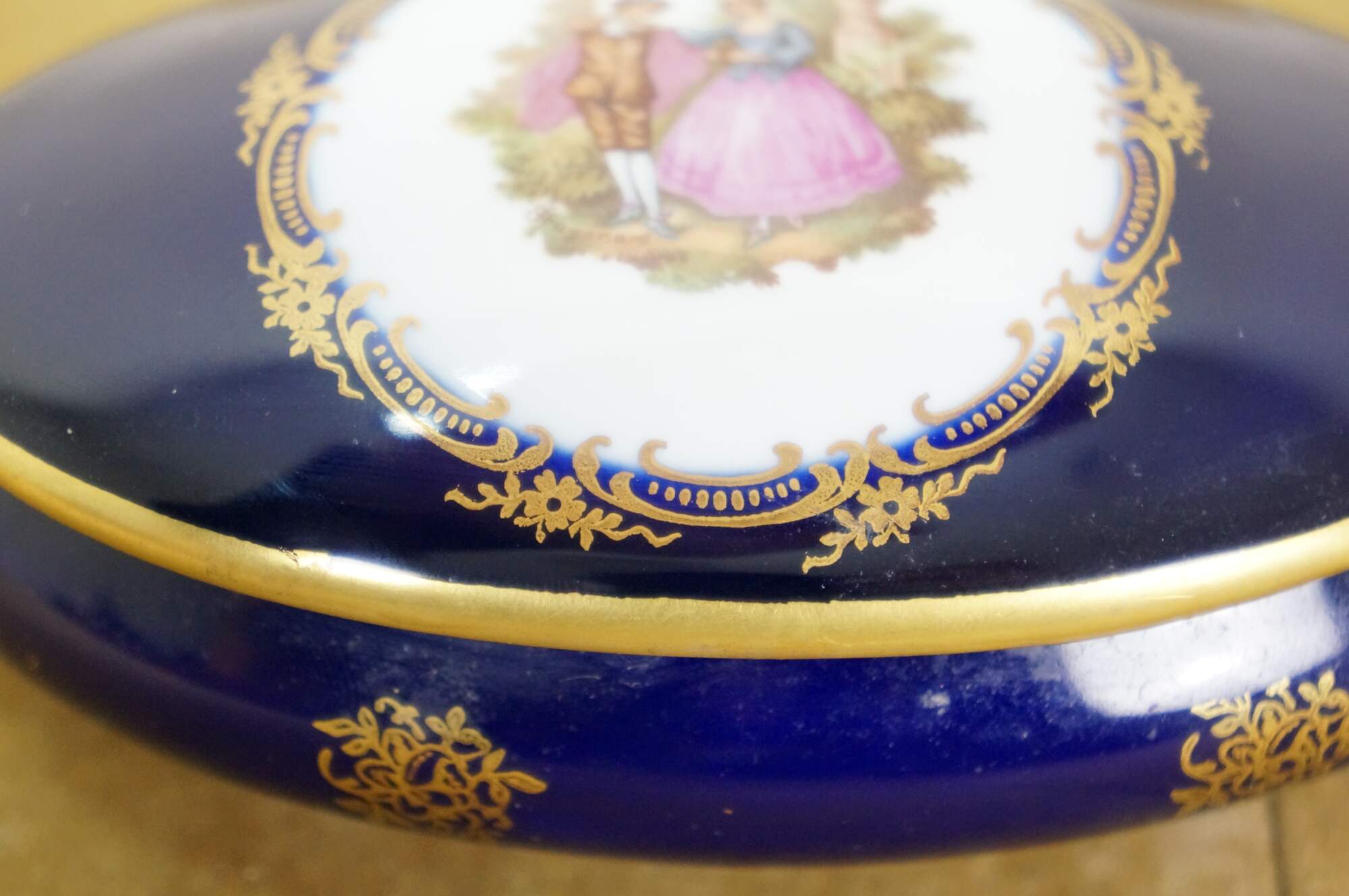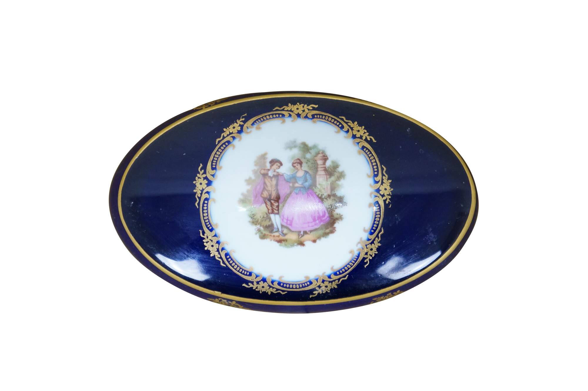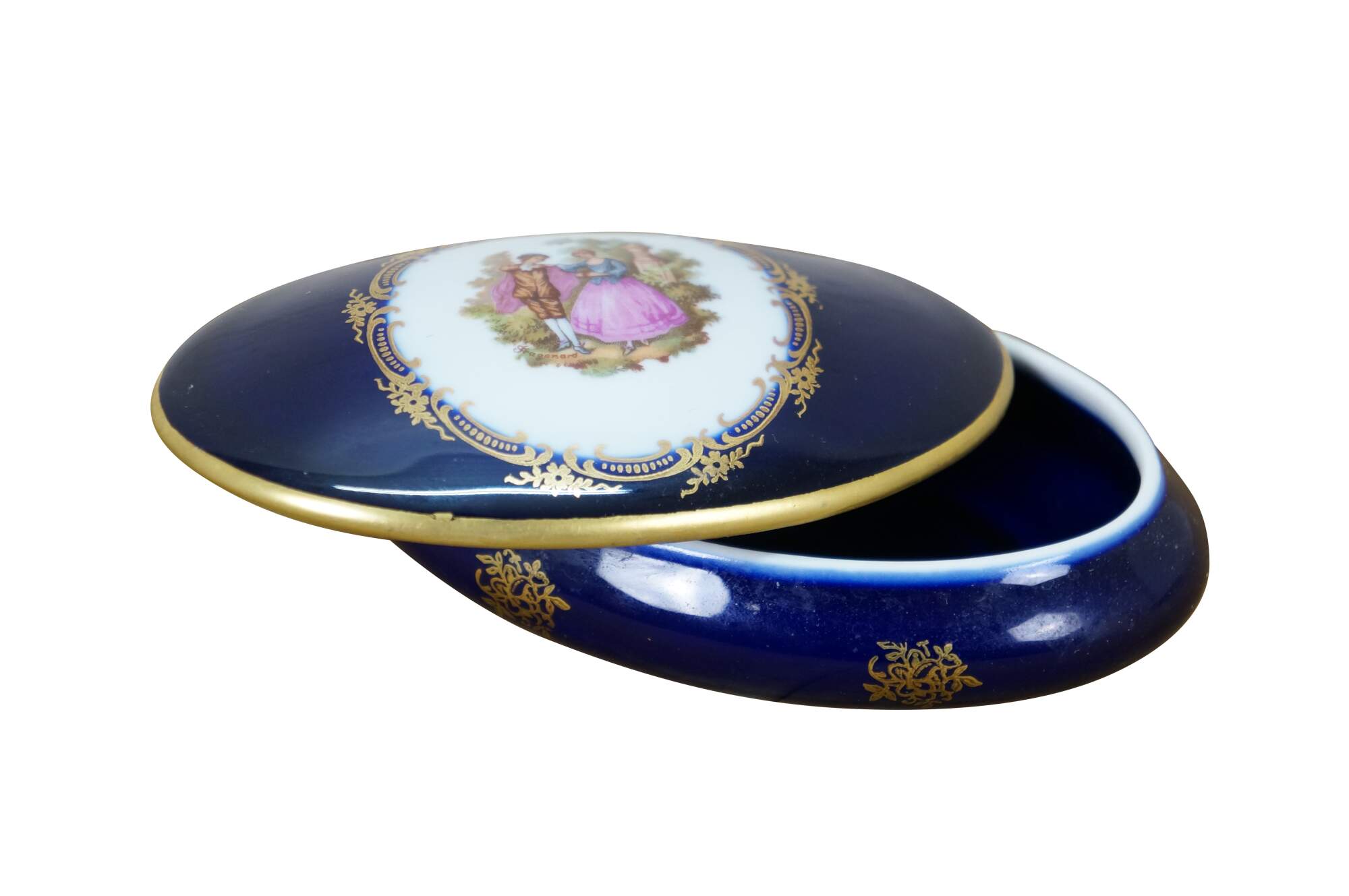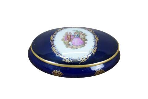 Vintage 20th century cobalt blue porcelain trinket box / lidded dish, featuring 22k gold floral accents and a printed Fragonard style courting couple motif on the lid. Porcelaine Limoges Castel France.