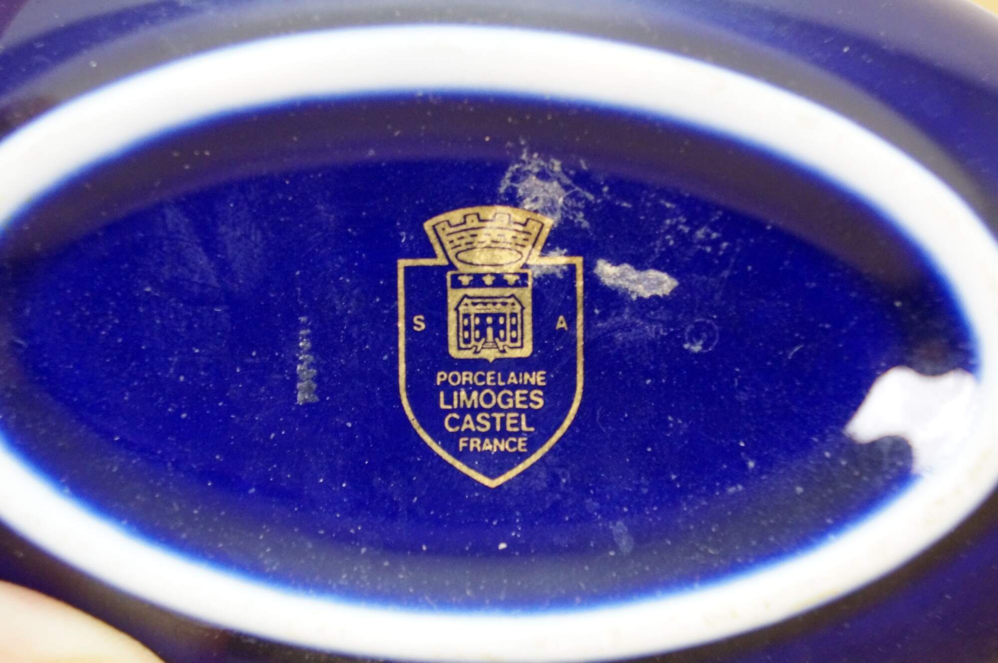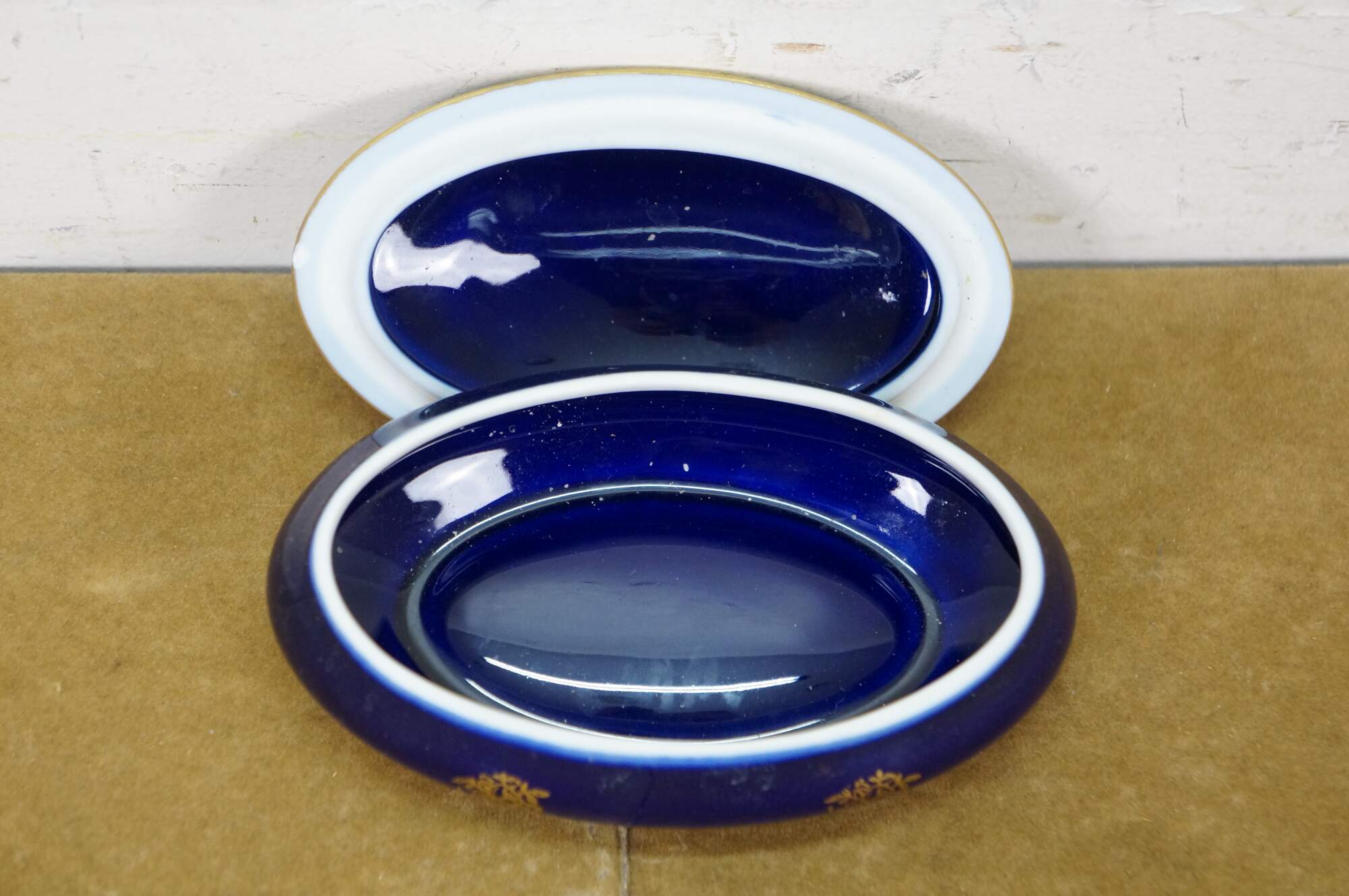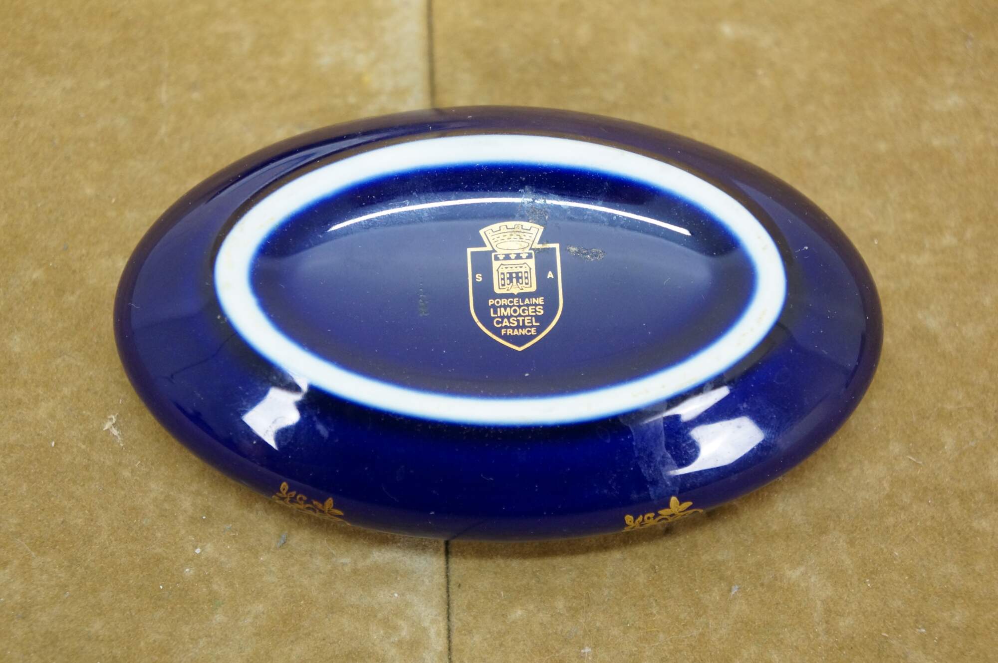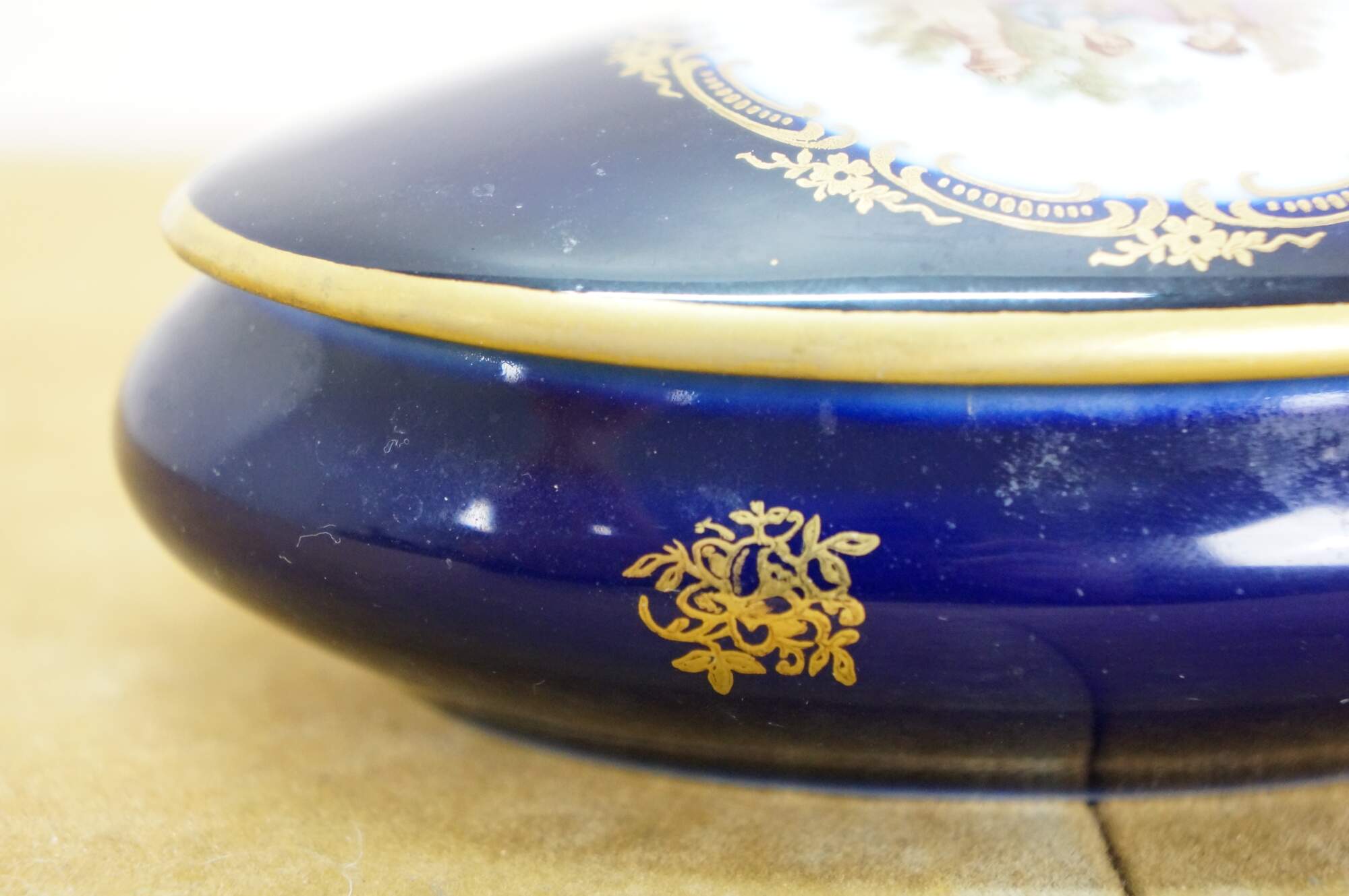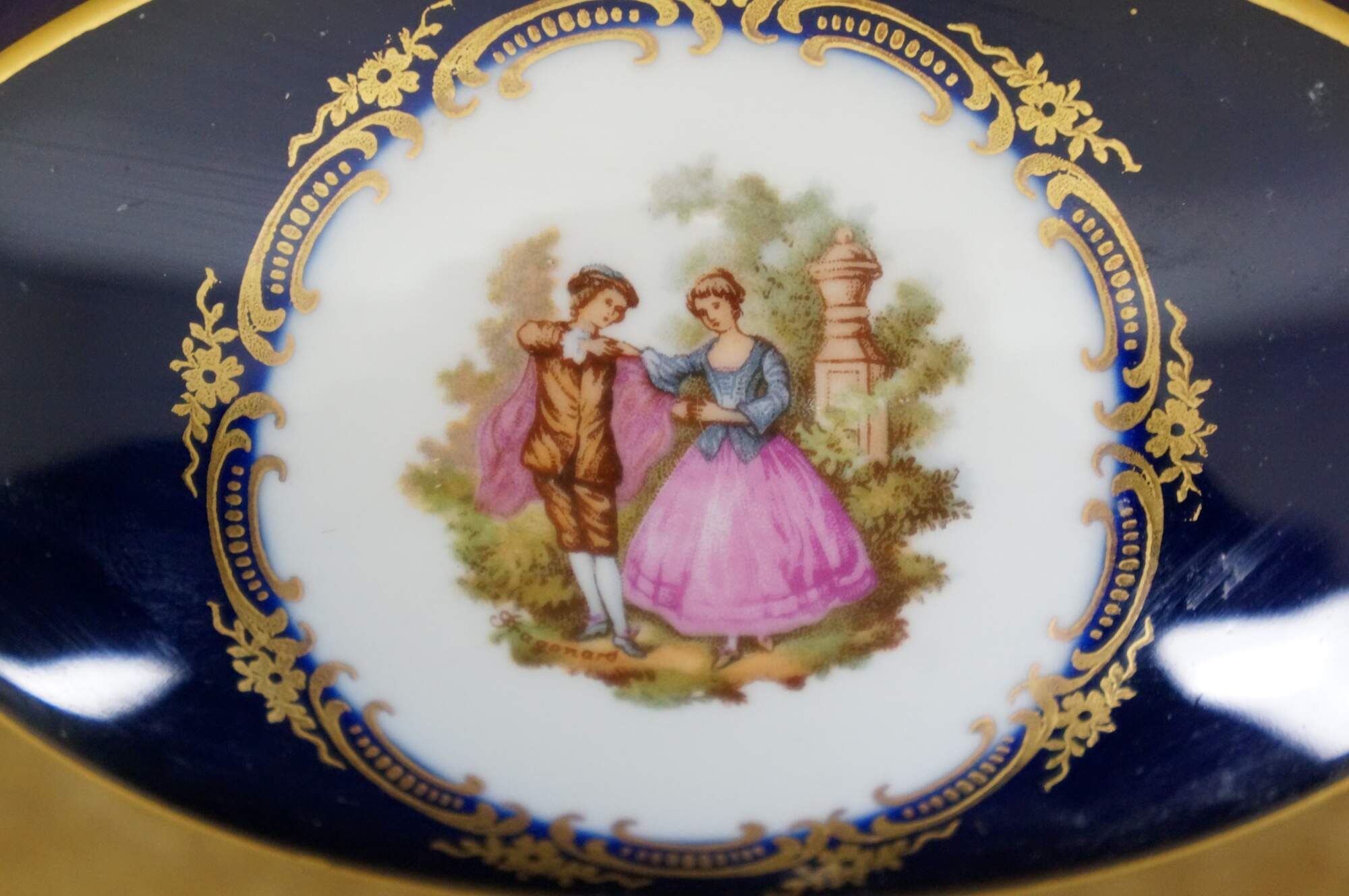 Vintage 20th century cobalt blue porcelain trinket box / lidded dish, featuring 22k gold floral accents and a printed Fragonard style courting couple motif on the lid. Porcelaine Limoges Castel France.