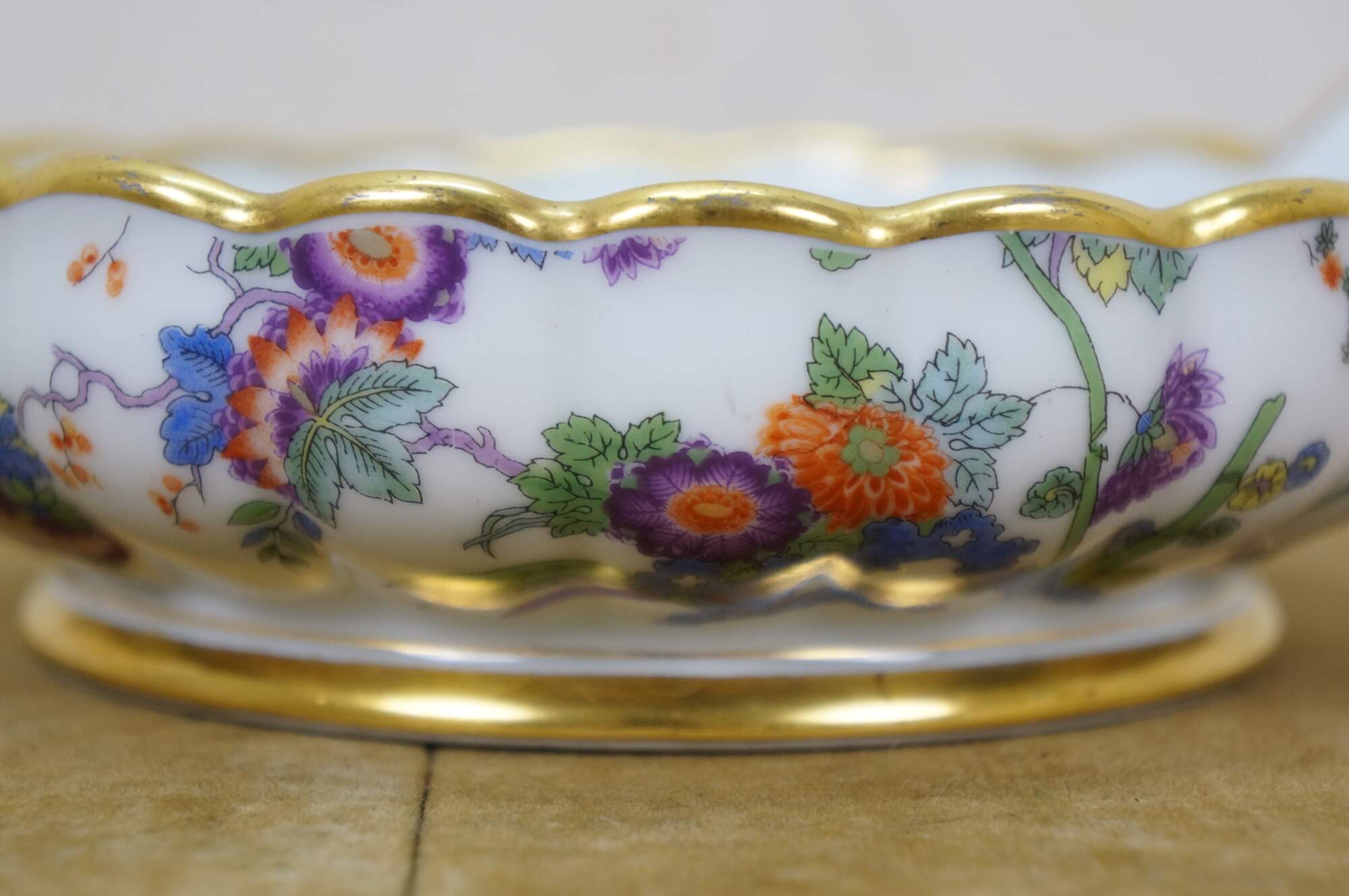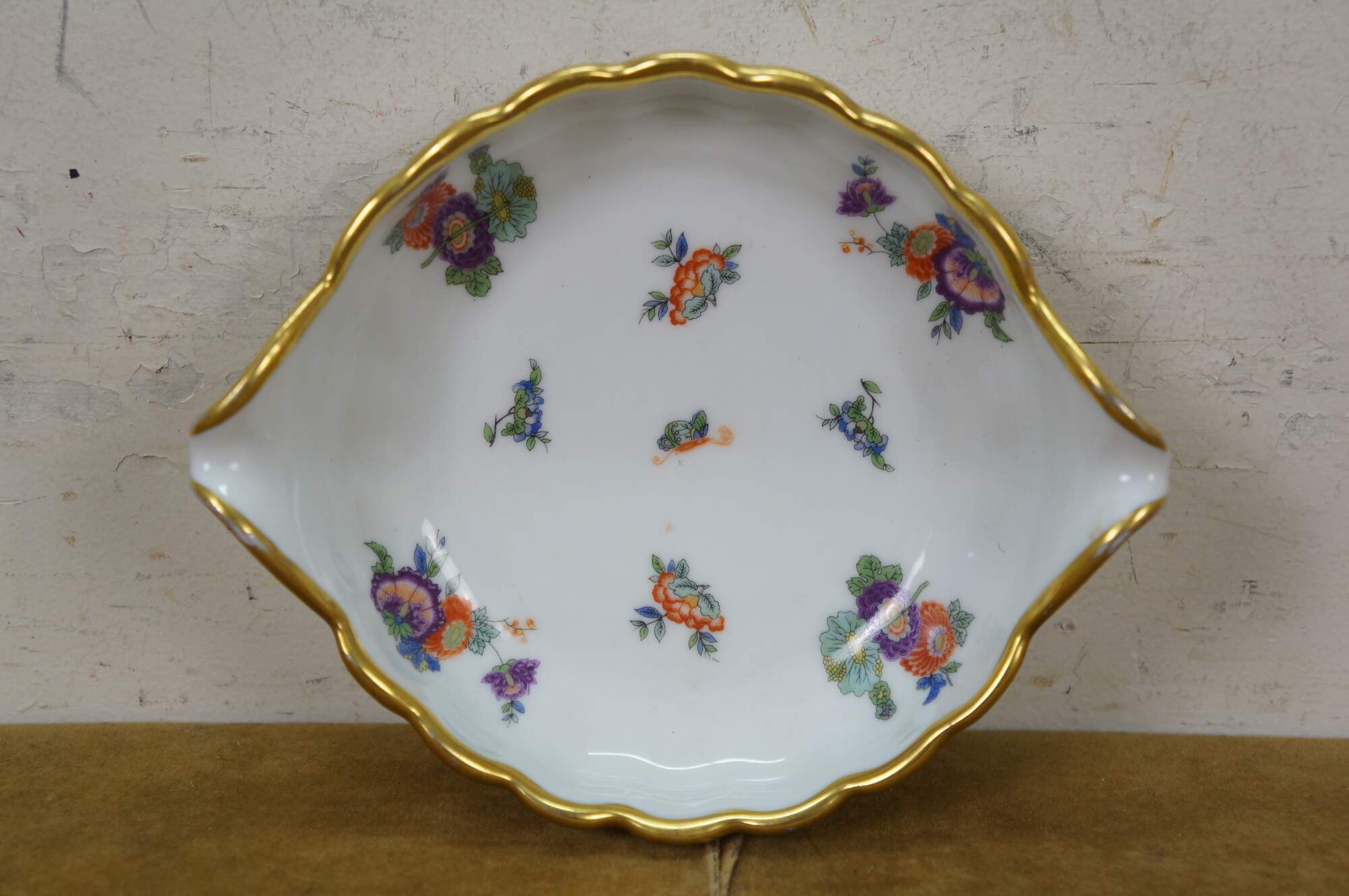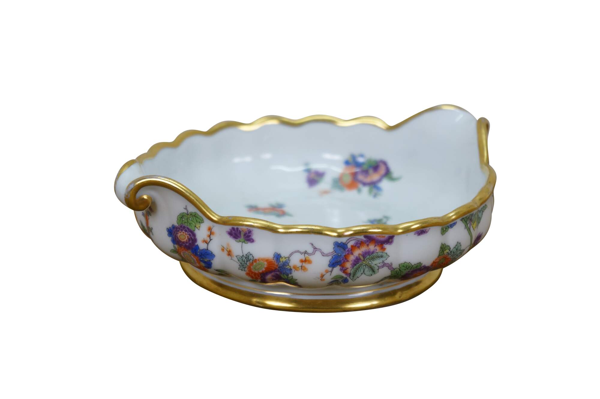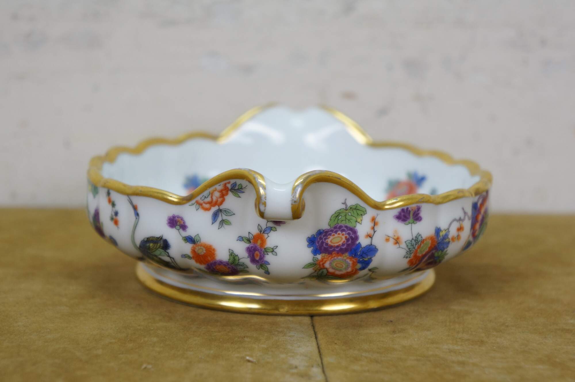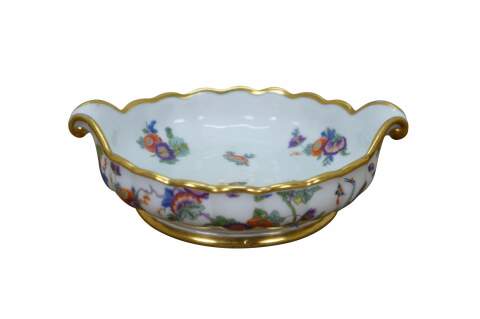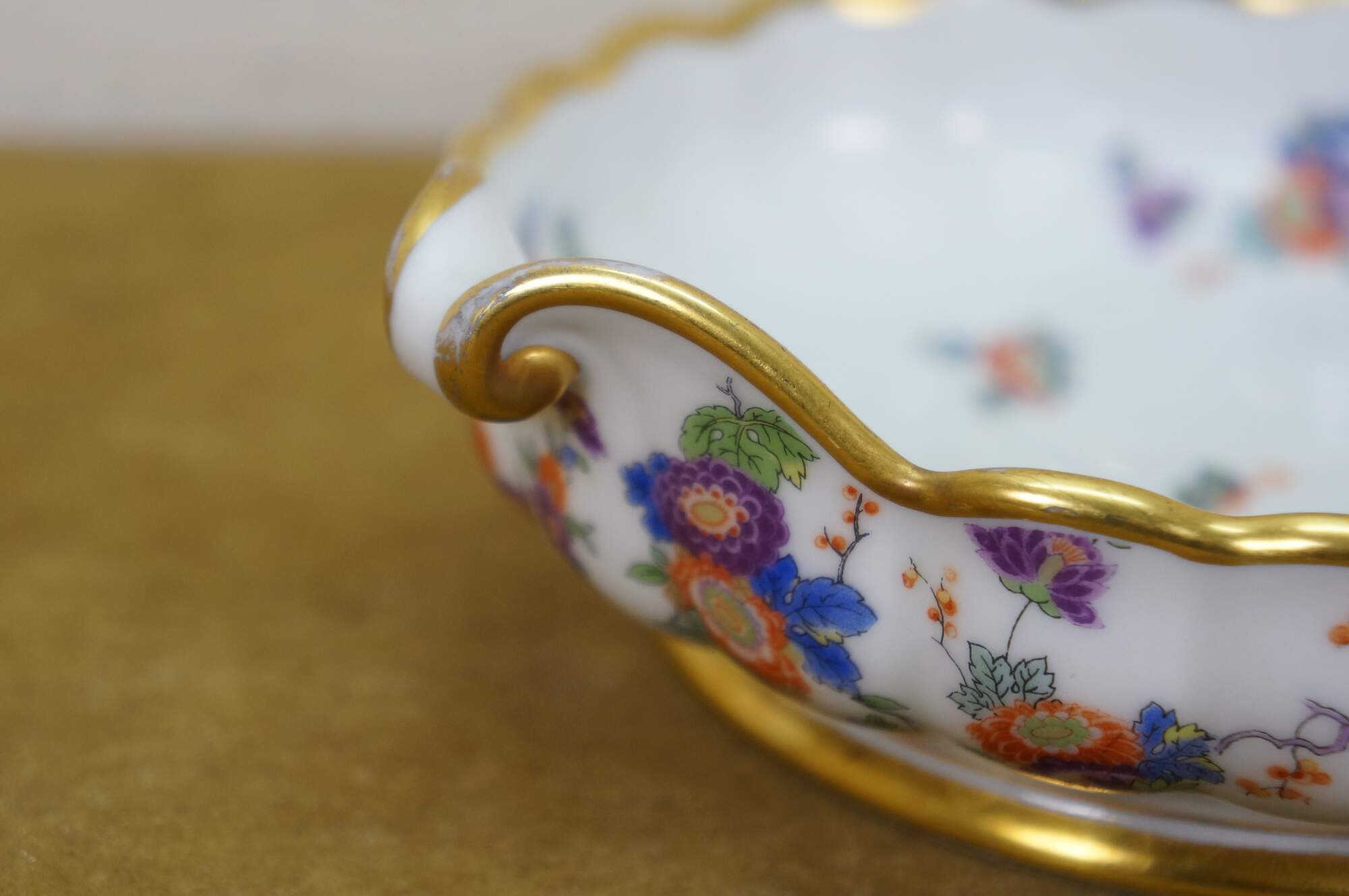 Early 20th century Thomas Bavaria art deco porcelain nut / bon bon dish. Round dish with scalloped edge and scrolled / snail shaped handles trimmed in gold, decorated with a multicolor design of chrysanthemums and butterflies.