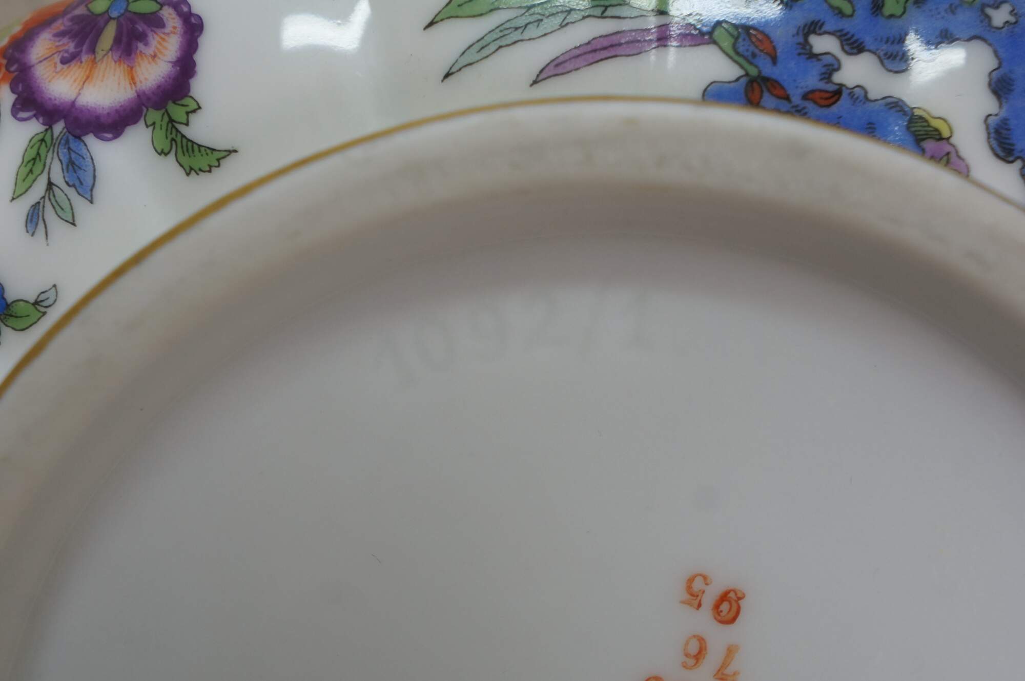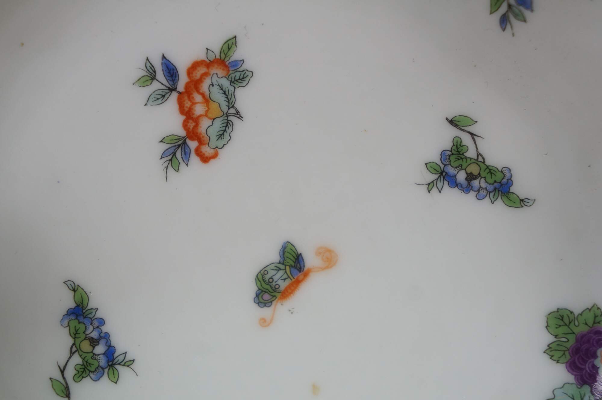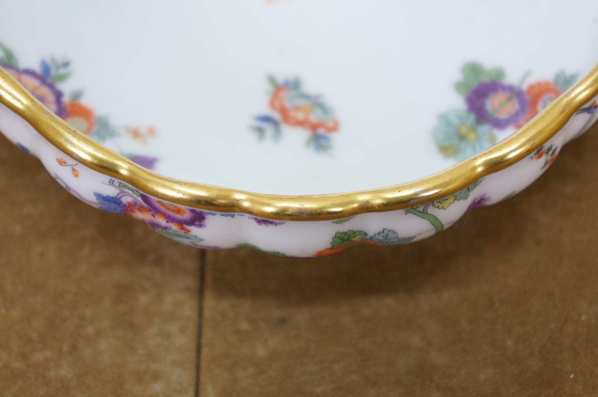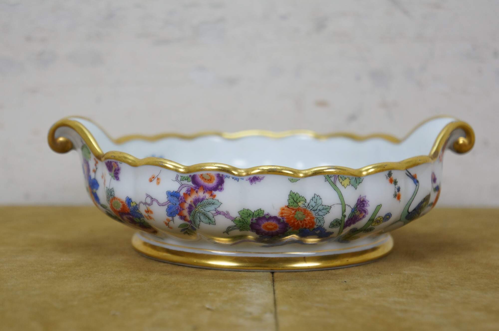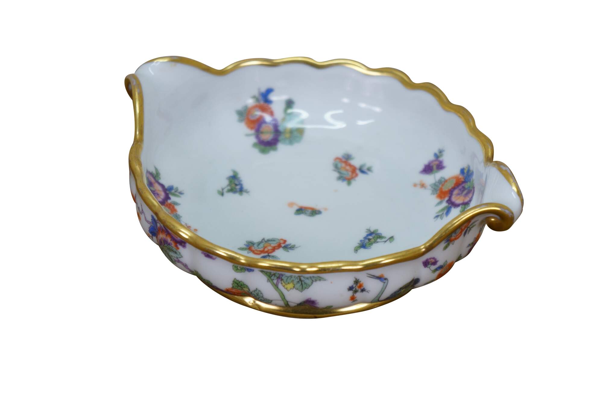 Early 20th century Thomas Bavaria art deco porcelain nut / bon bon dish. Round dish with scalloped edge and scrolled / snail shaped handles trimmed in gold, decorated with a multicolor design of chrysanthemums and butterflies.