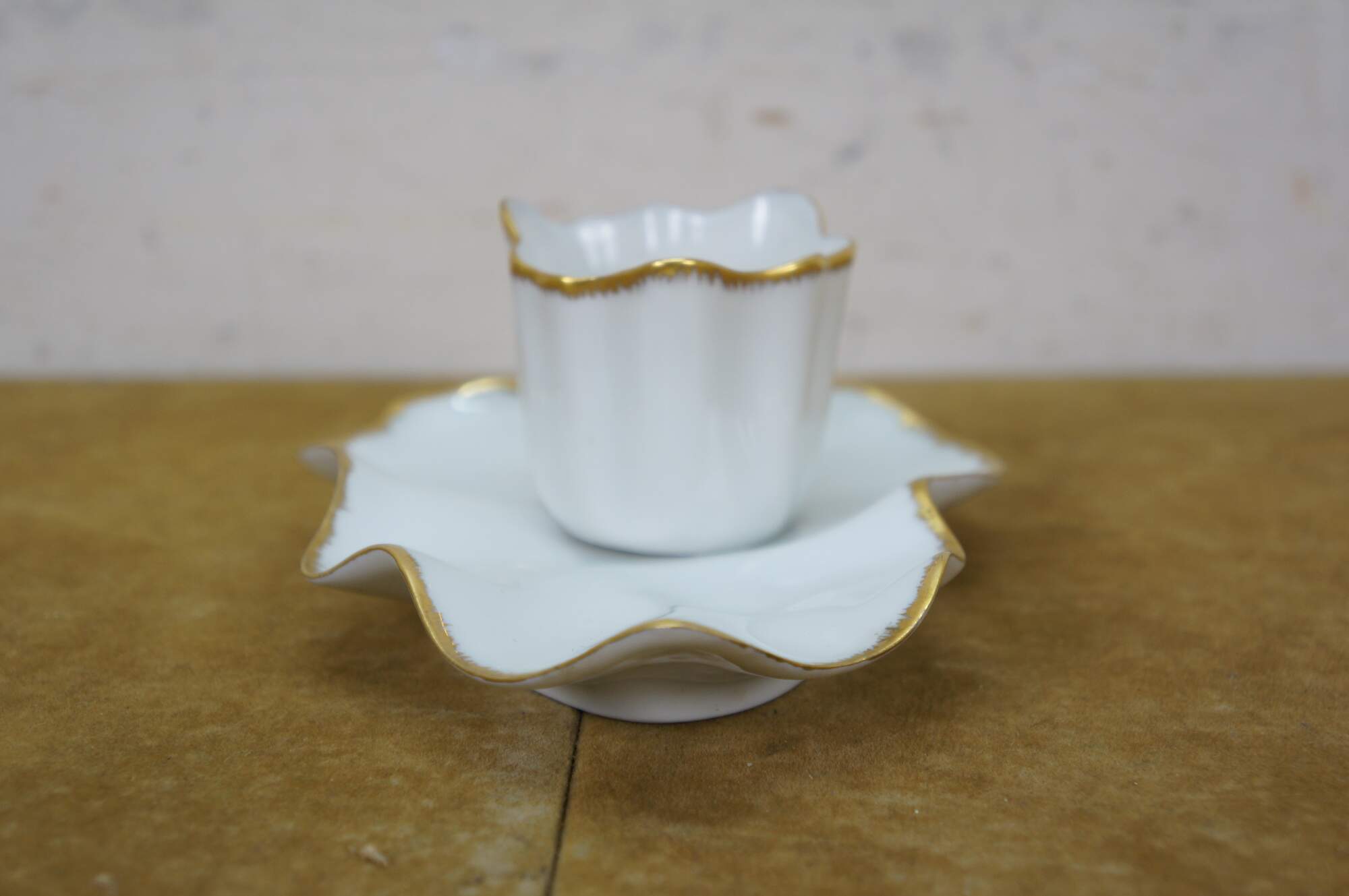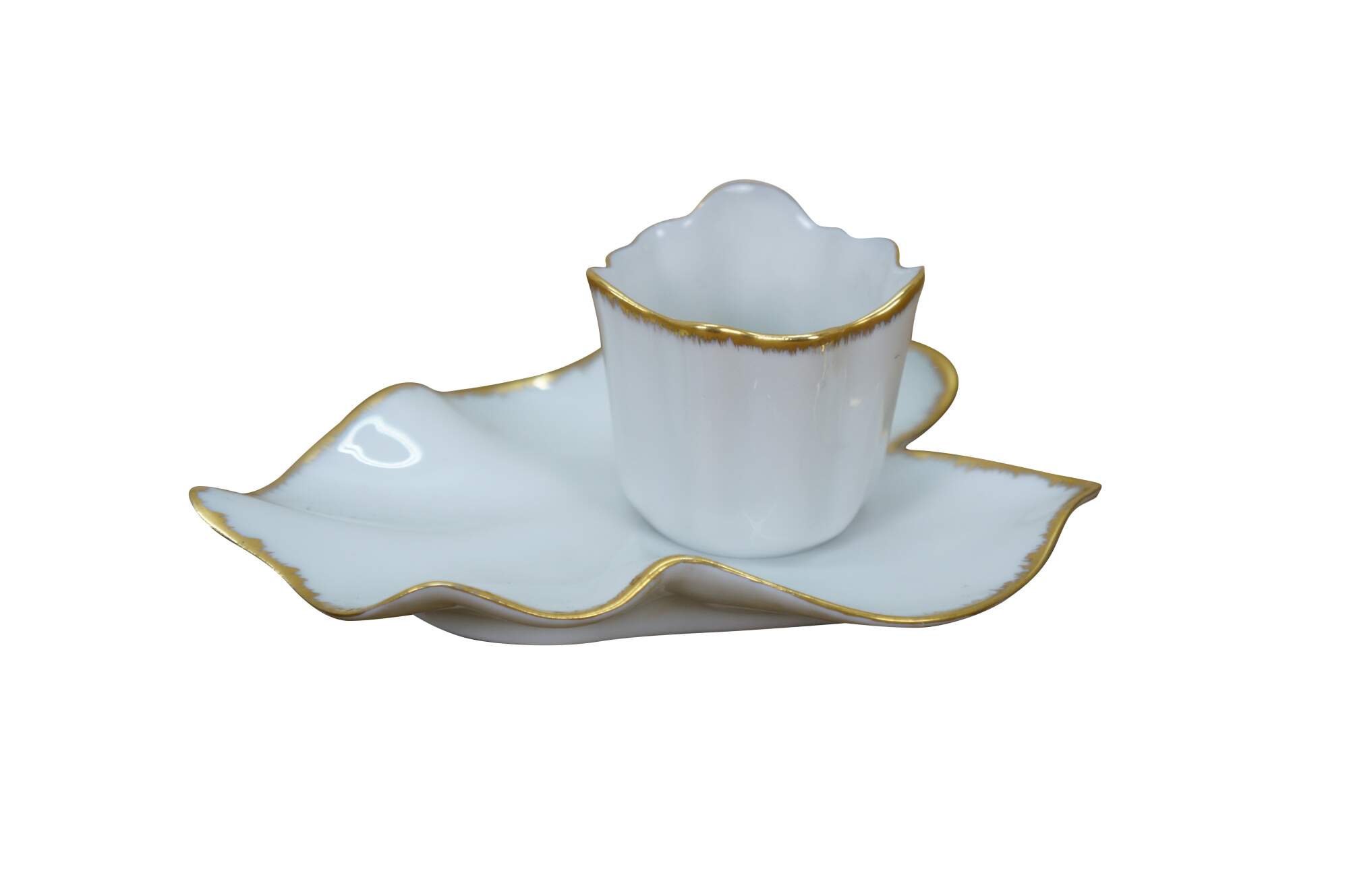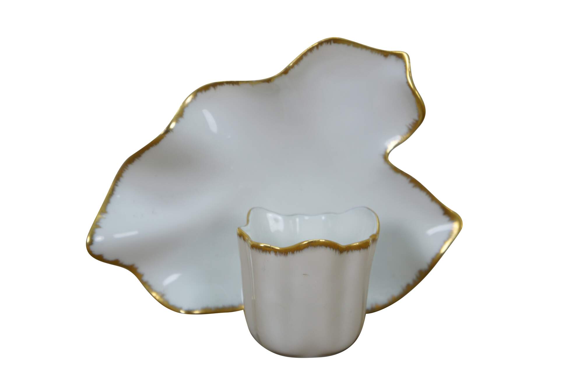 Vintage 20th century Limoges France white porcelain demitasse coffee cup and saucer in the shape of a flower blossom and a curling leaf, trimmed with gold.