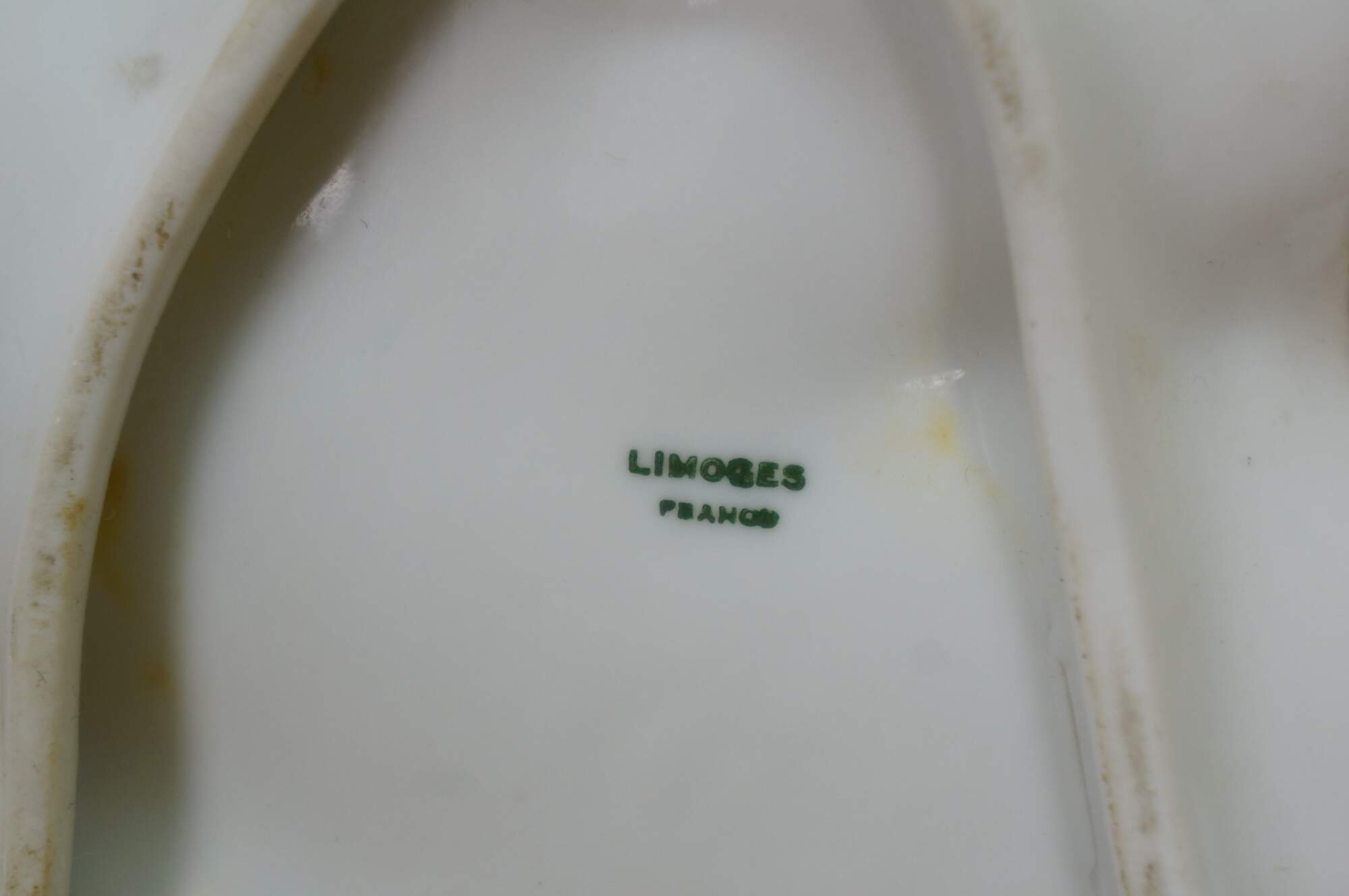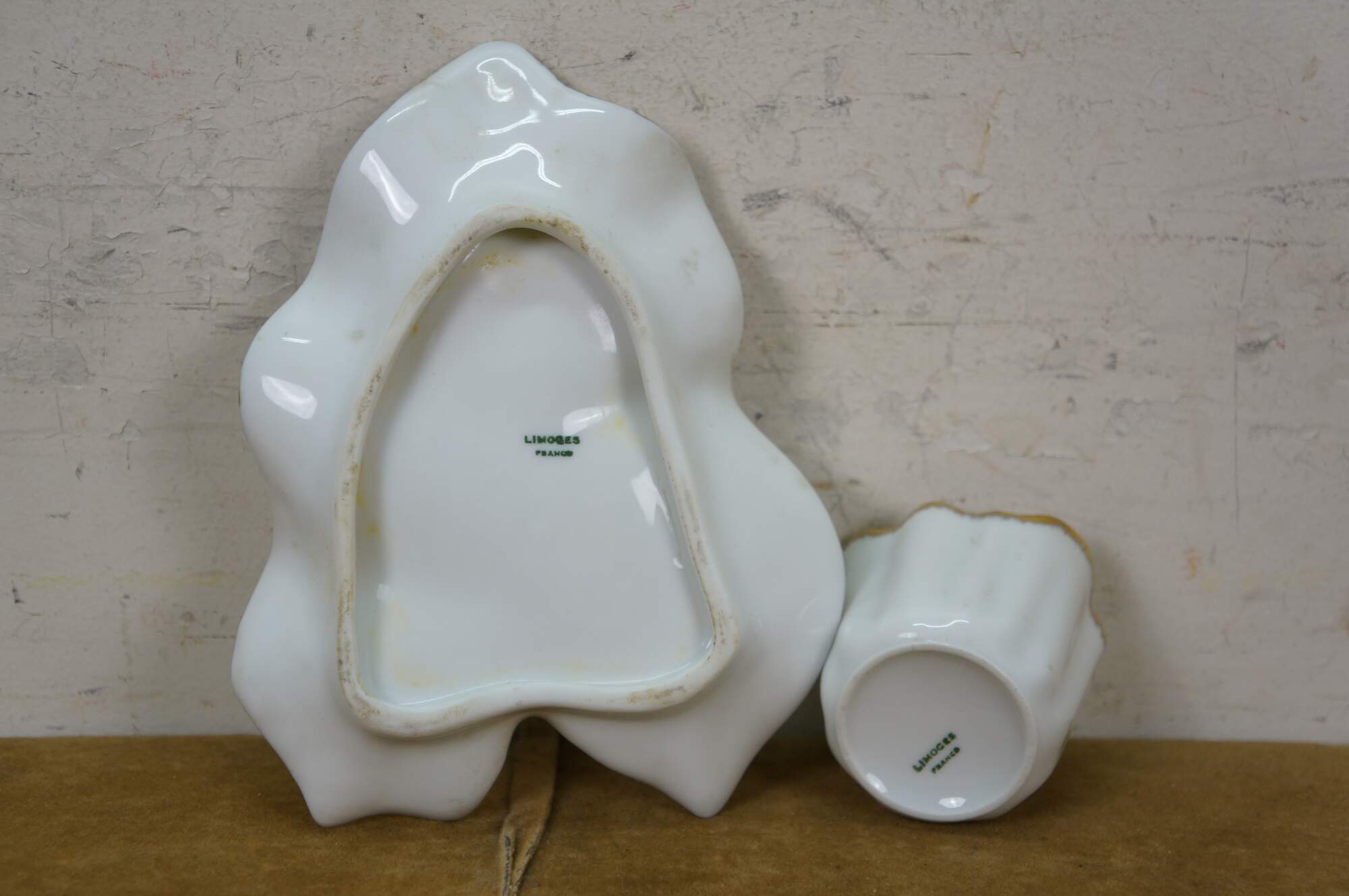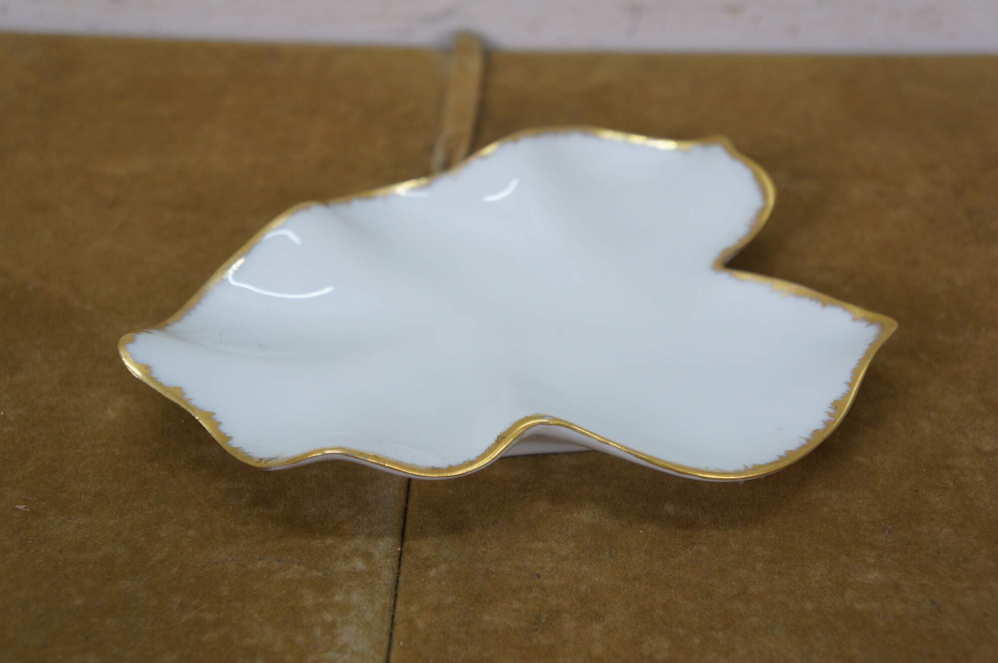 Vintage 20th century Limoges France white porcelain demitasse coffee cup and saucer in the shape of a flower blossom and a curling leaf, trimmed with gold.