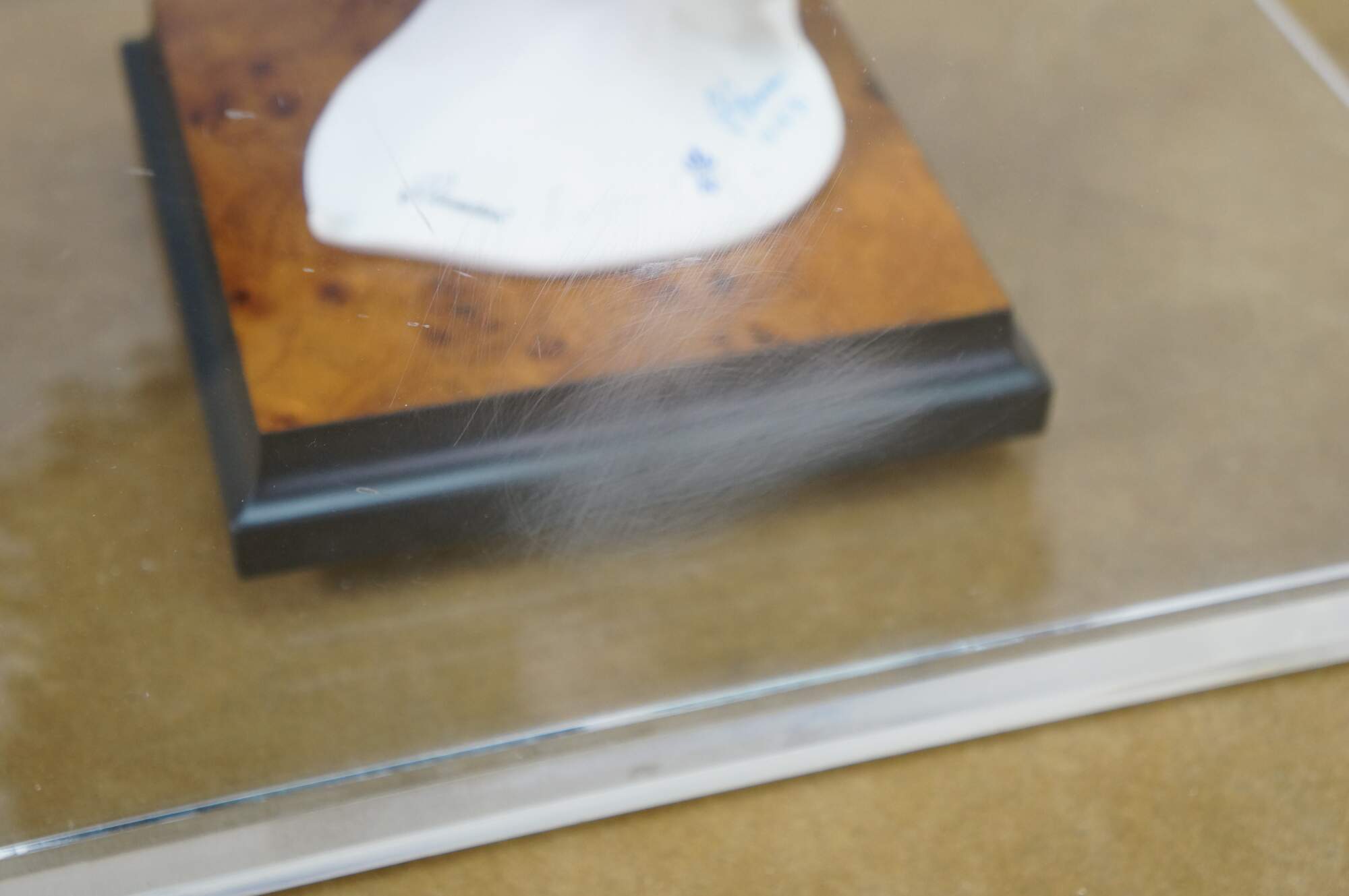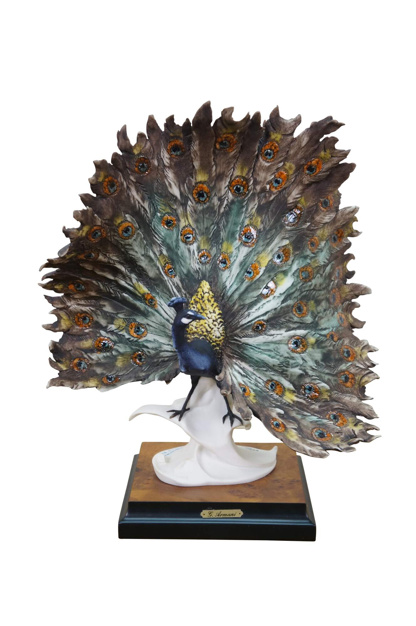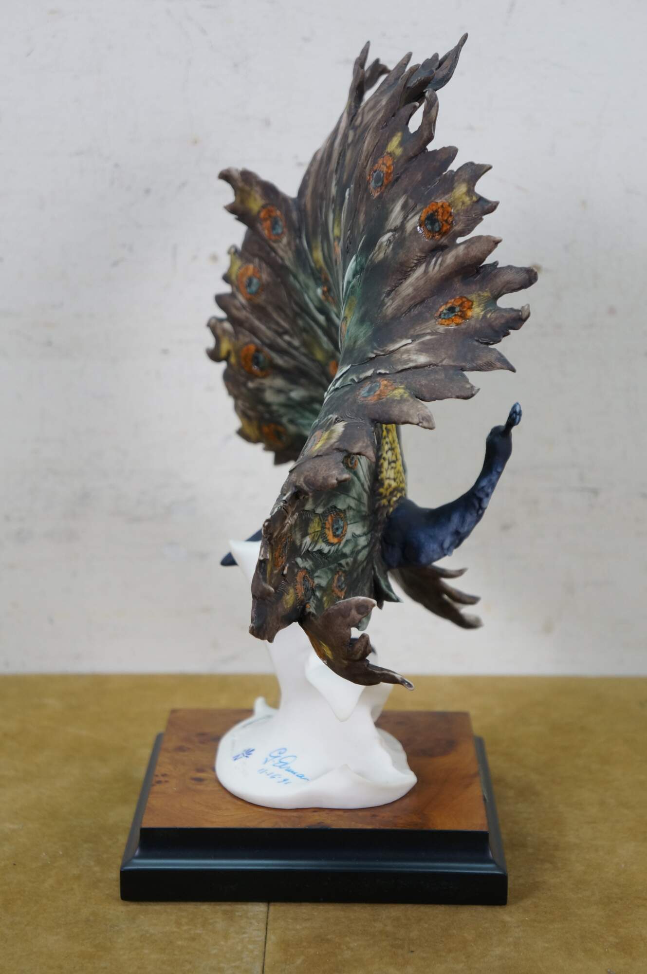 Rare vintage 1989 signed Italian Florentine Capodimonte ceramic sculpture number 0720 in the shape of a male peacock with tail feathers spread, designed by Giuseppe Armani and signed by the artist in 1991. Ceramic sculpture set on a black and burl square base. Florence Italy, copyright 1989, signed twice, and dated 11-16-91 on right signature. Includes acrylic display case.