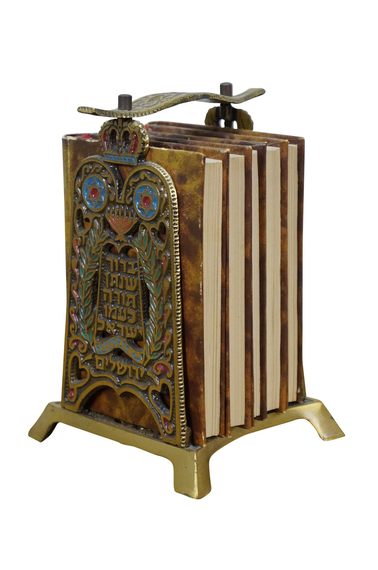 The Hebrew Bible with English Translation - The Five Books of Moses - Copyright 1973 by Sinai Publishing, Tel-Aviv - Printed in Israel. A parallel text set of of the Five Books of Moses / Pentateuch in Hebrew and English. Brown leatherette hard back / hard cover with enameled brass display stand featuring the Ten Commandments. Bar / Bat Mitzvah Torah Gift.