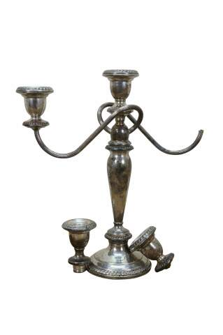 Damaged, Tarnish/wear to finish; one candle cup detached; for use as parts or as a single short or tall candlestick.