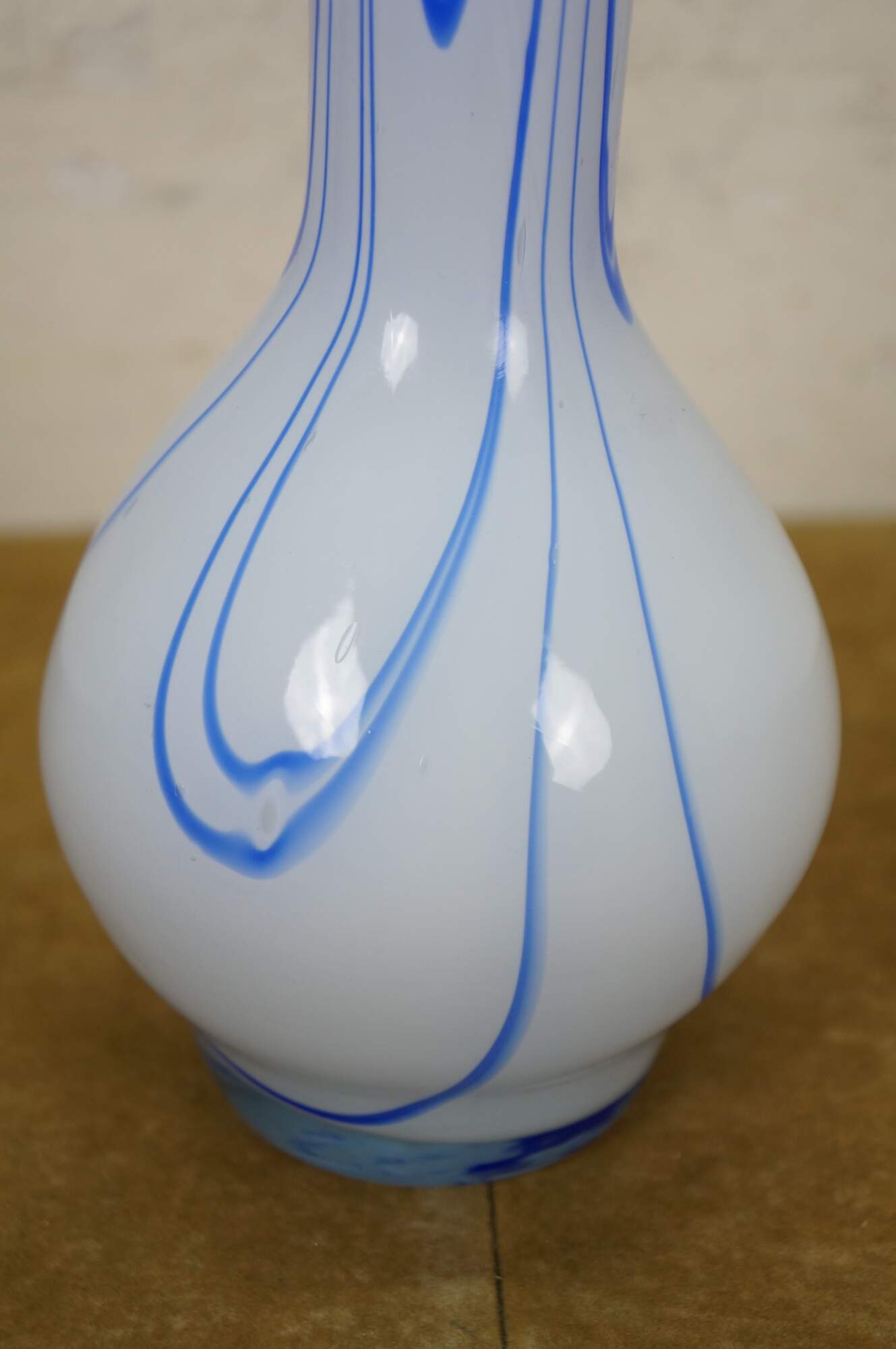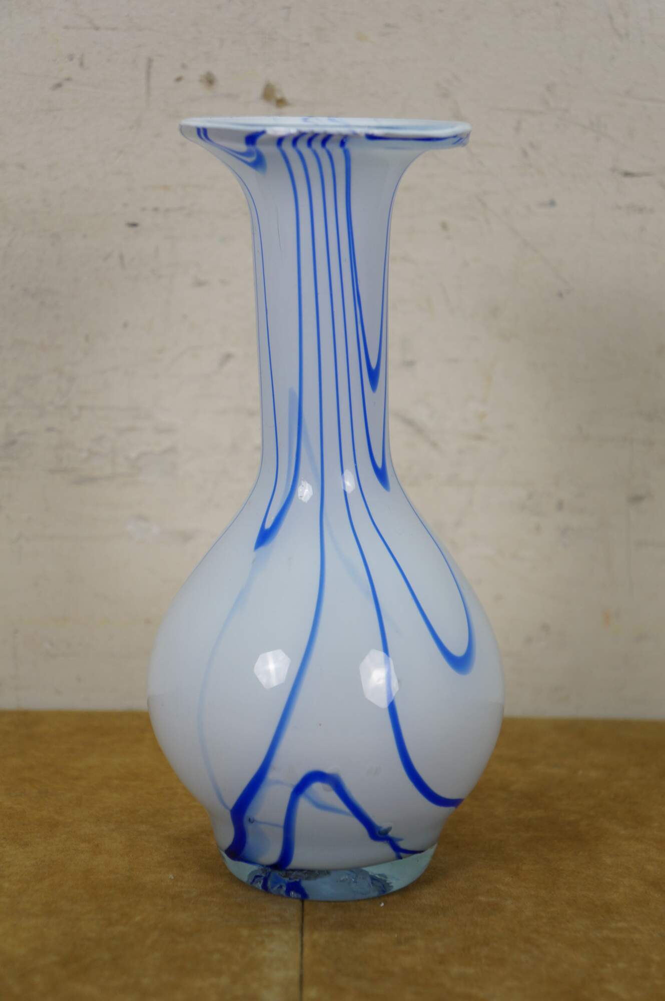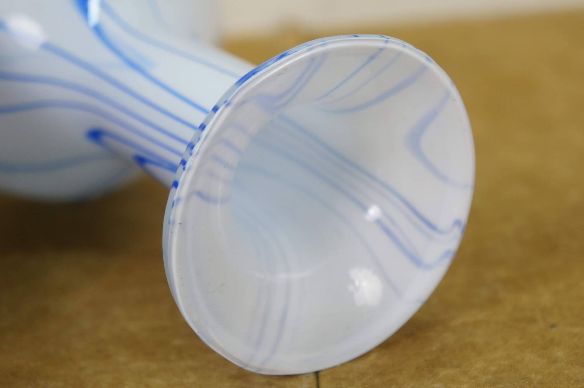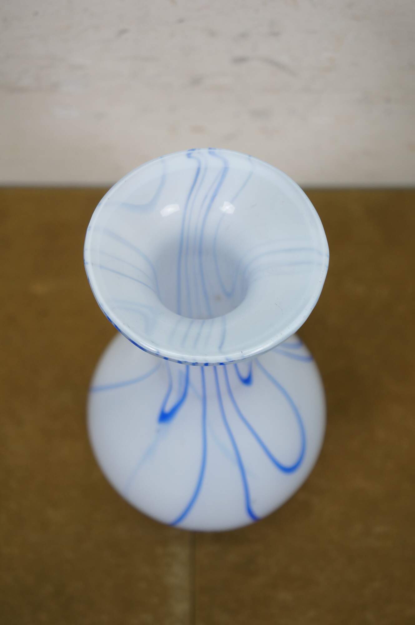 Vintage 20th century hand blown art glass vase - milk white with cobalt blue swirls, bulb shaped base and flared mouth. Un-polished pontil. No signature.