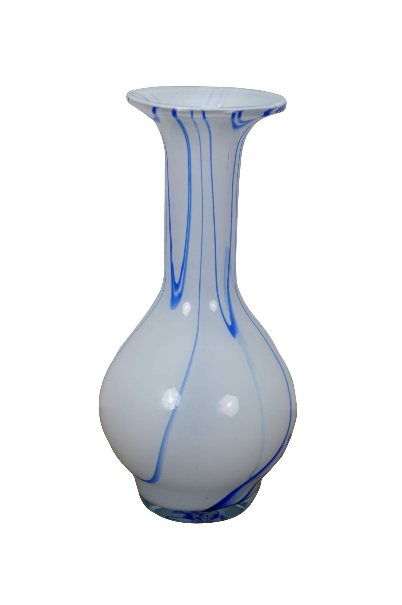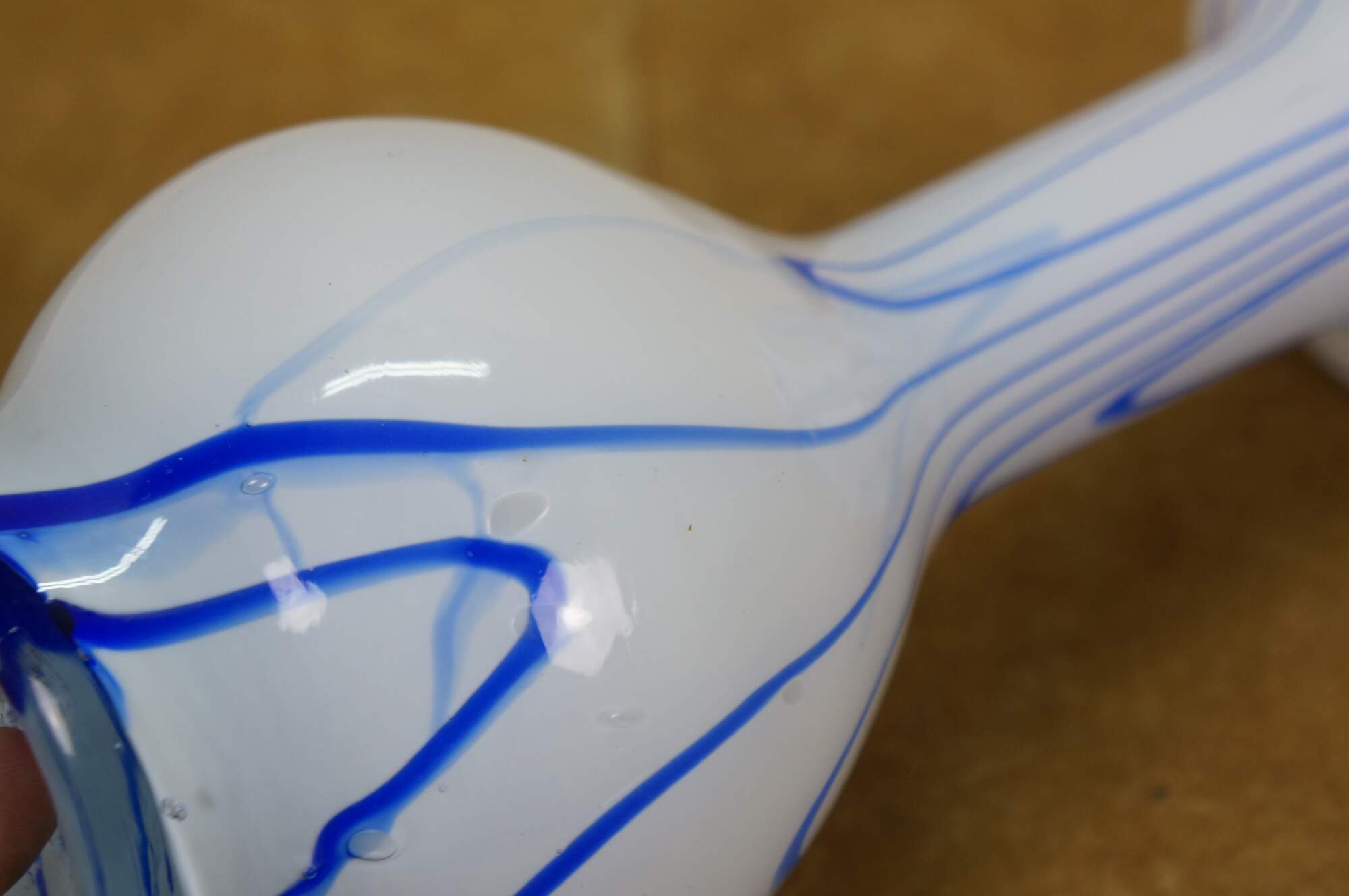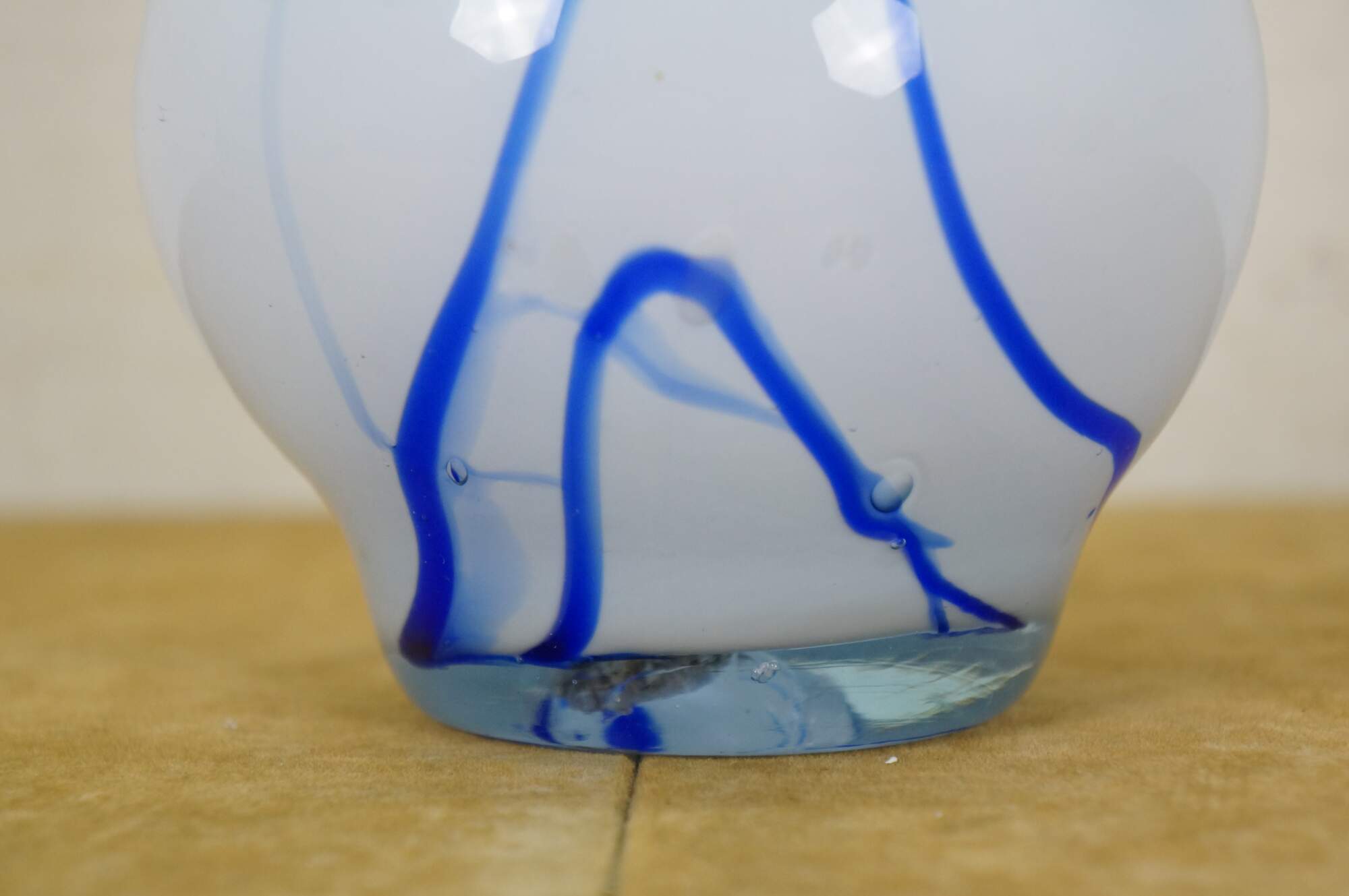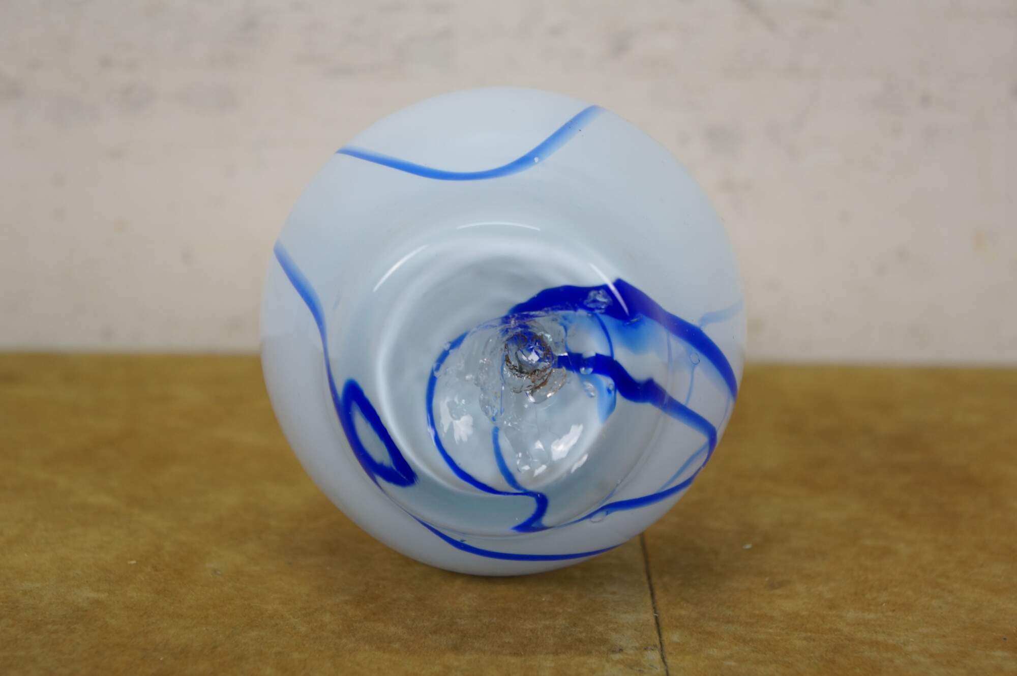 Vintage 20th century hand blown art glass vase - milk white with cobalt blue swirls, bulb shaped base and flared mouth. Un-polished pontil. No signature.