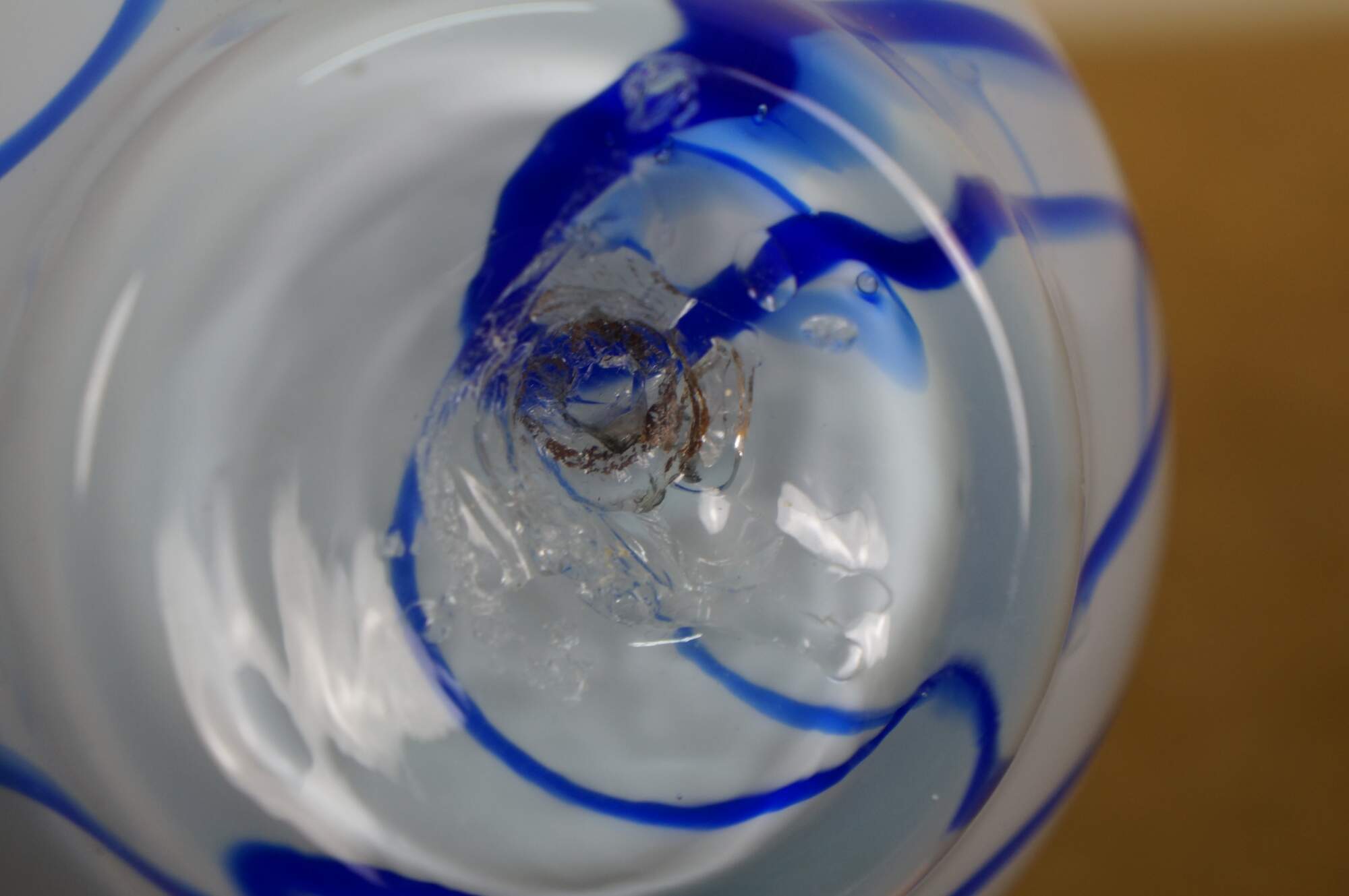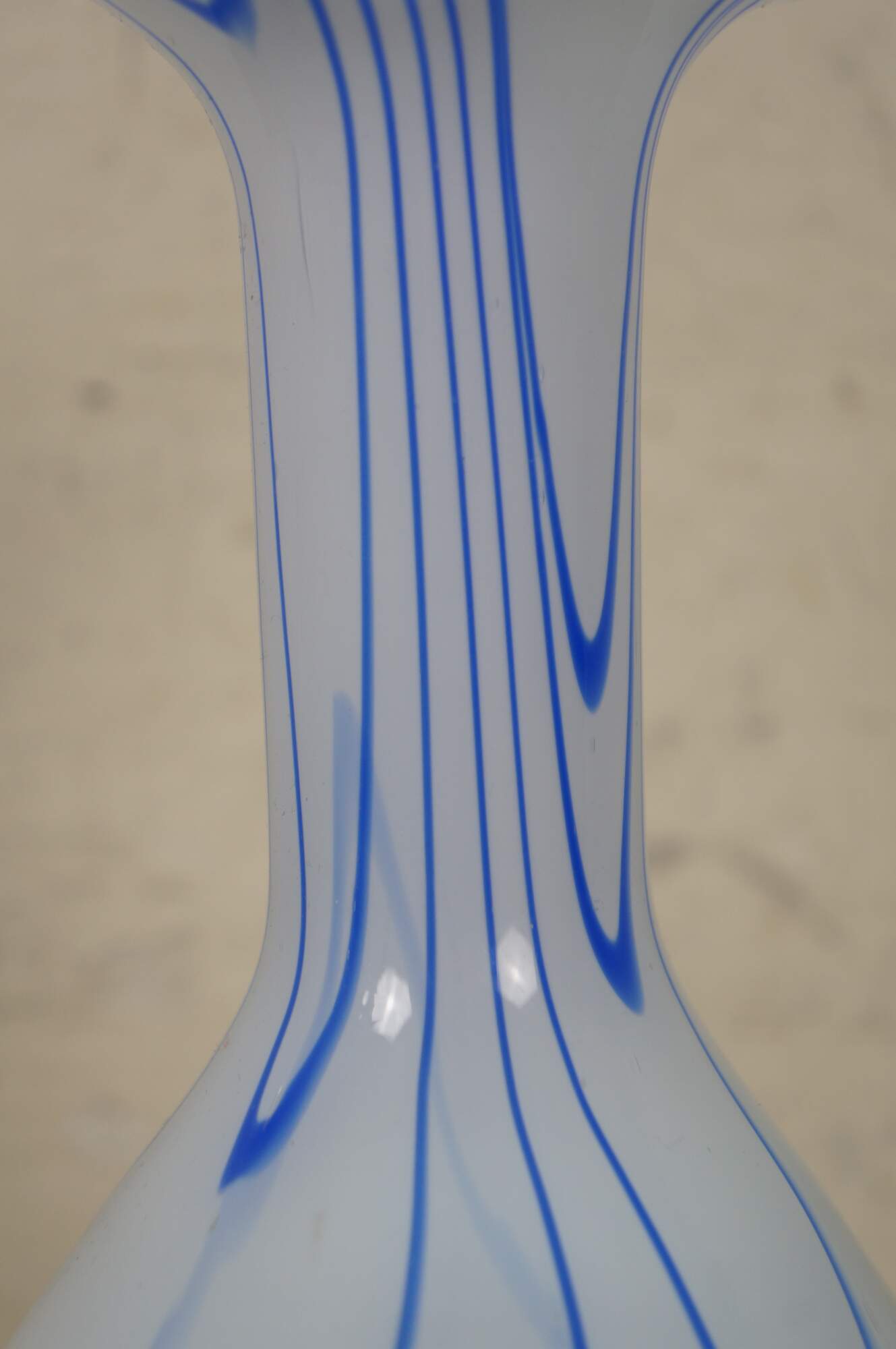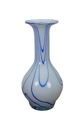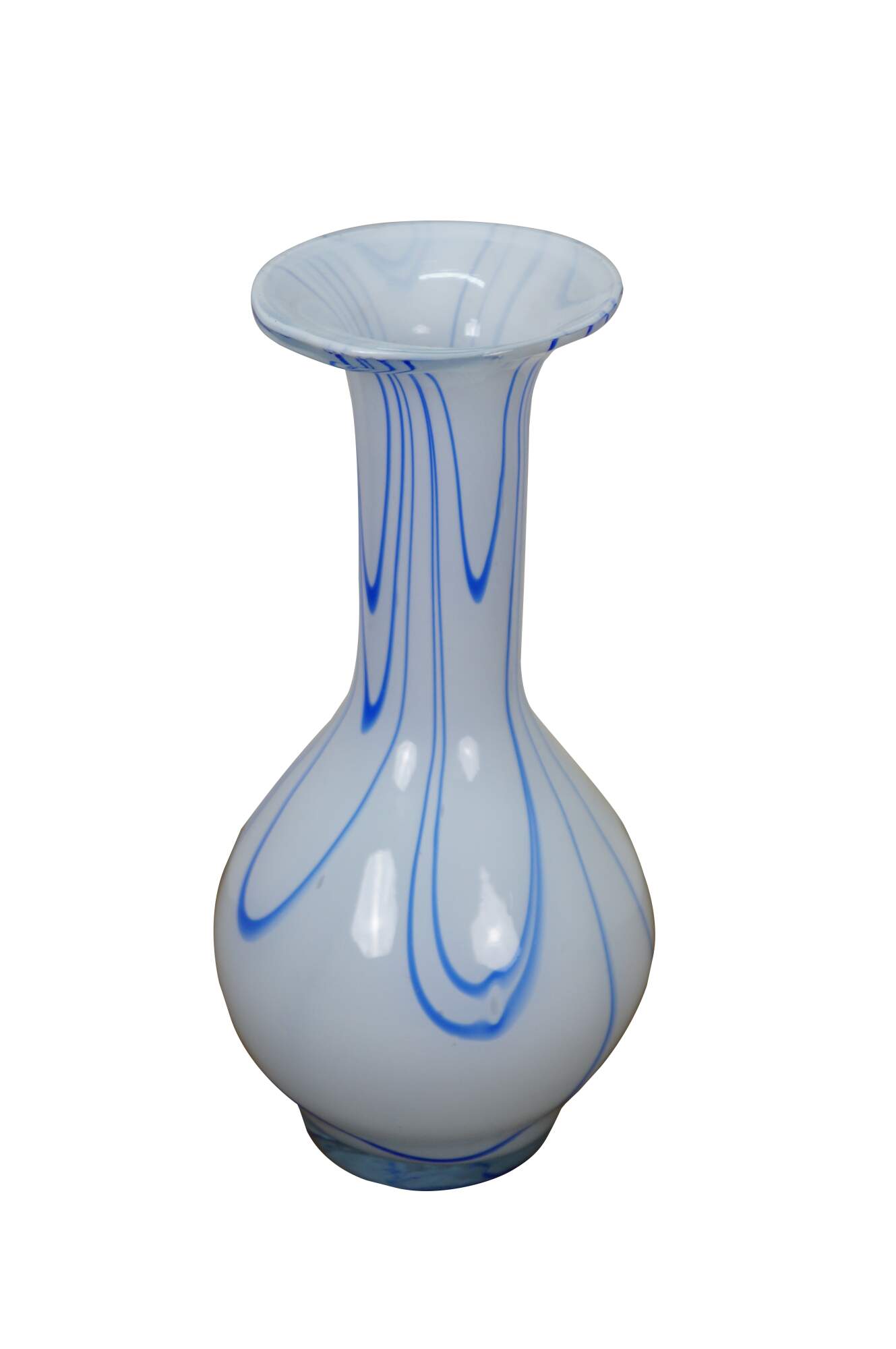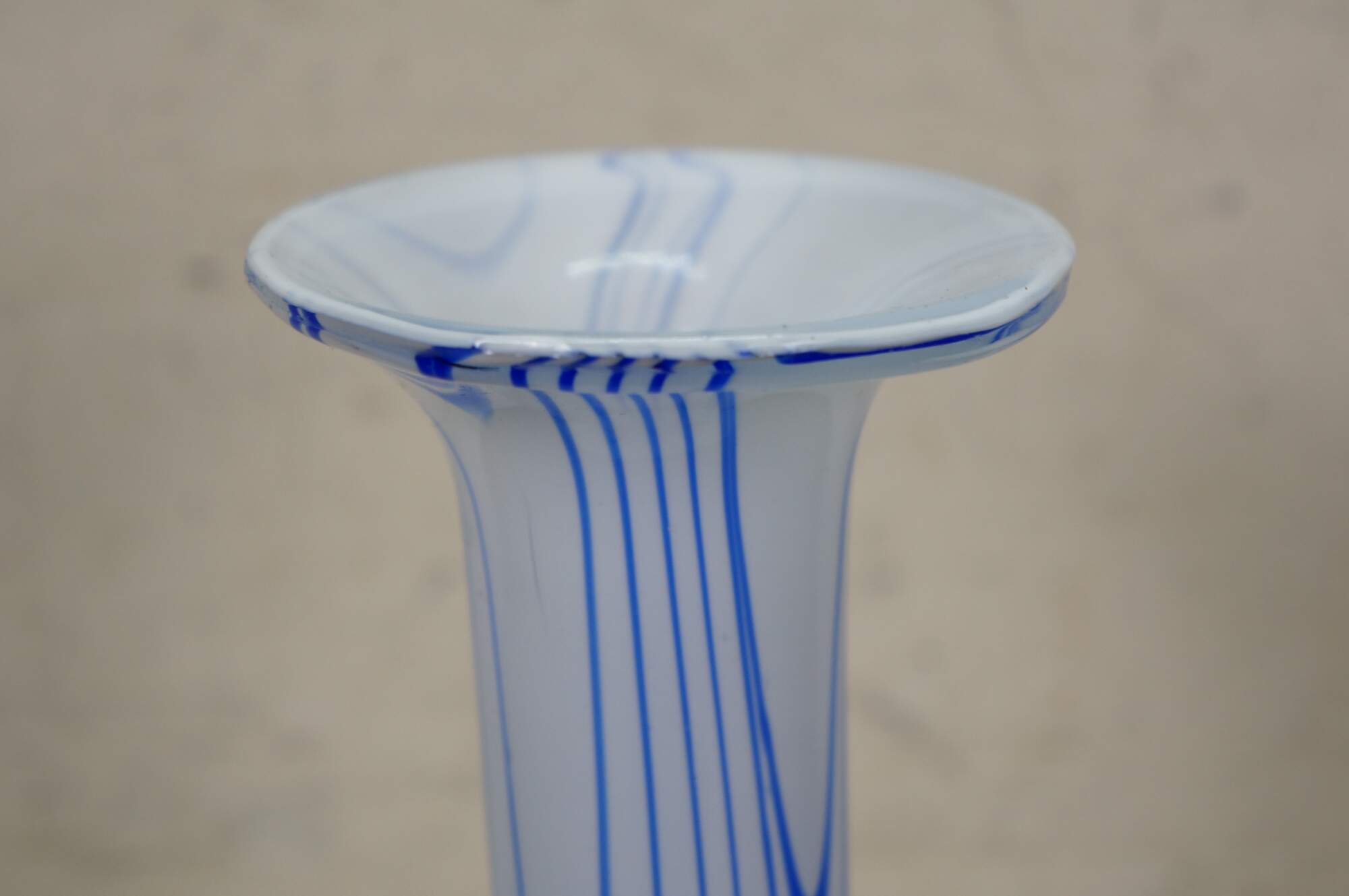 Vintage 20th century hand blown art glass vase - milk white with cobalt blue swirls, bulb shaped base and flared mouth. Un-polished pontil. No signature.