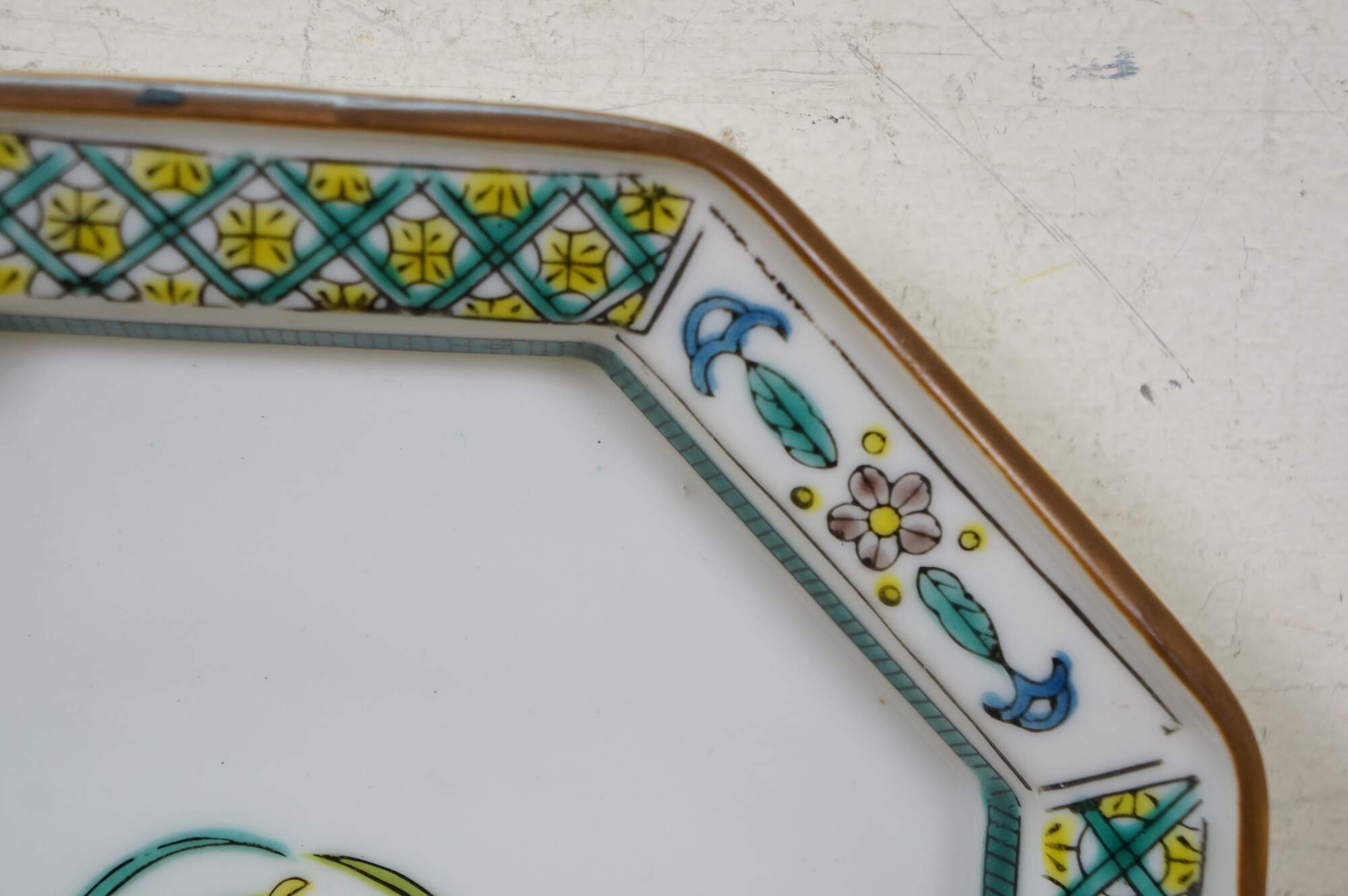 Vintage 20th century octagonal bread plate / dish hand painted in green and yellow with lattice patterns and flowers around the edge and a central motif of lilies. Signed on reverse.