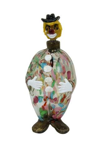 Vintage 20th-century hand-blown Murano glass decanter/bottle in the shape of a clown with gold-flecked shoes, a multicolored spotted suit, blond hair, and a tiny cowboy hat.