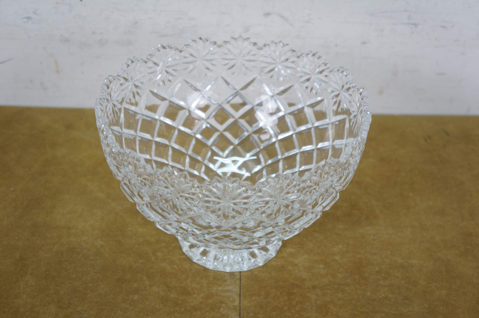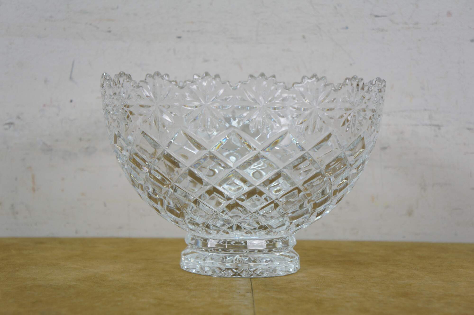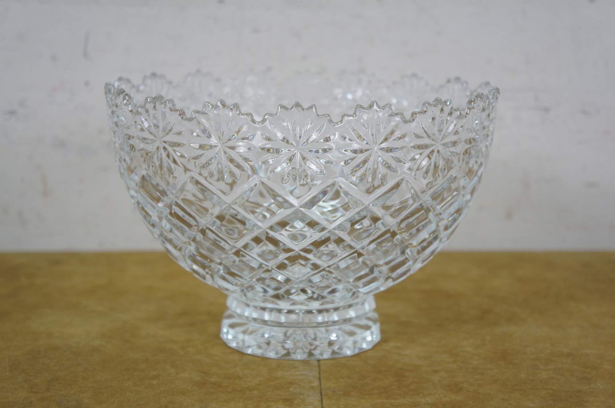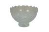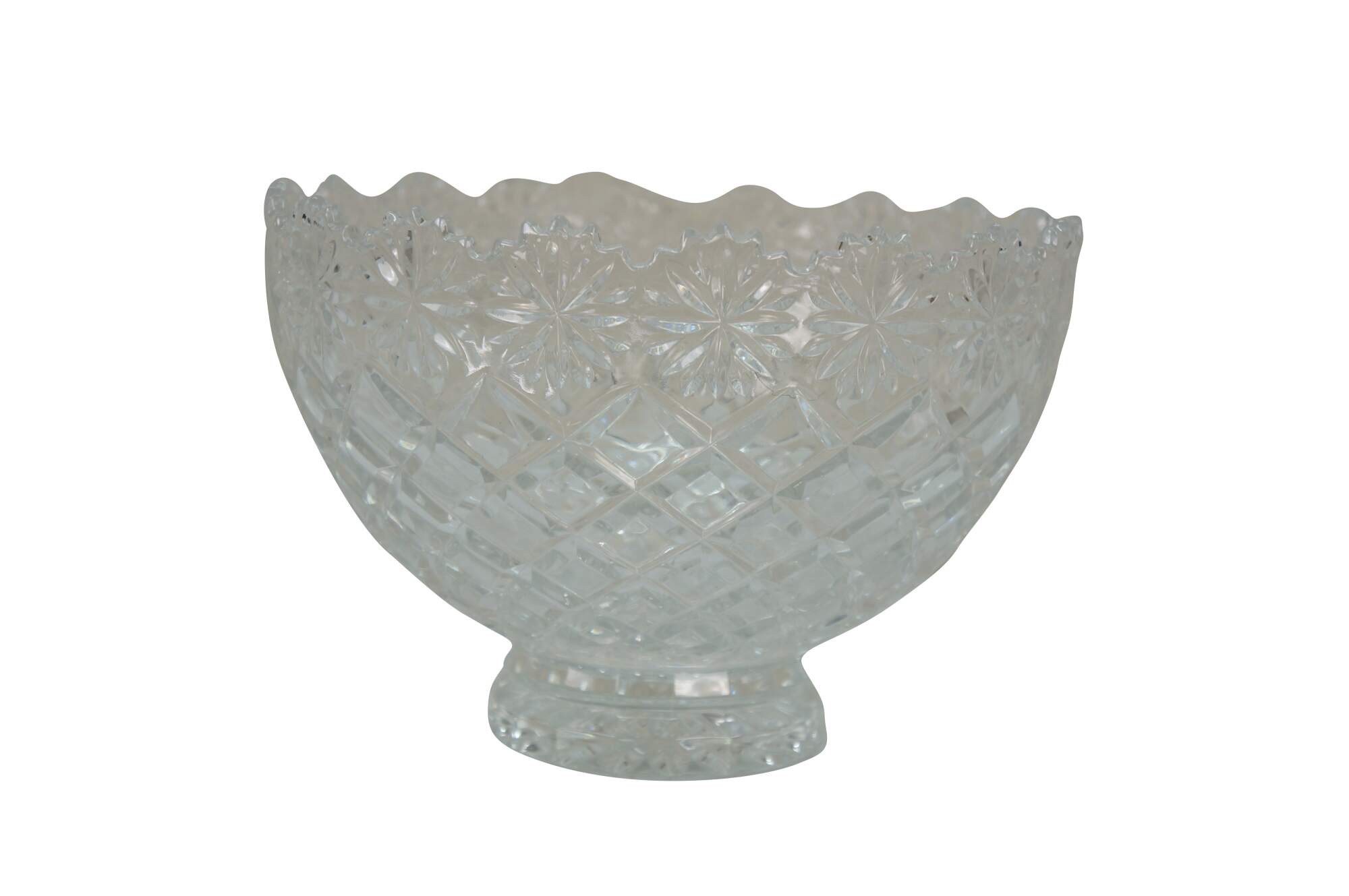 Early 21st century art deco style pressed glass Brussels Collection bowl / centerpiece by CrystalClear / Jay Imports. Round form tapering to a footed base, with diamond pattern sides and a floral /daisy border and sawtooth rim.