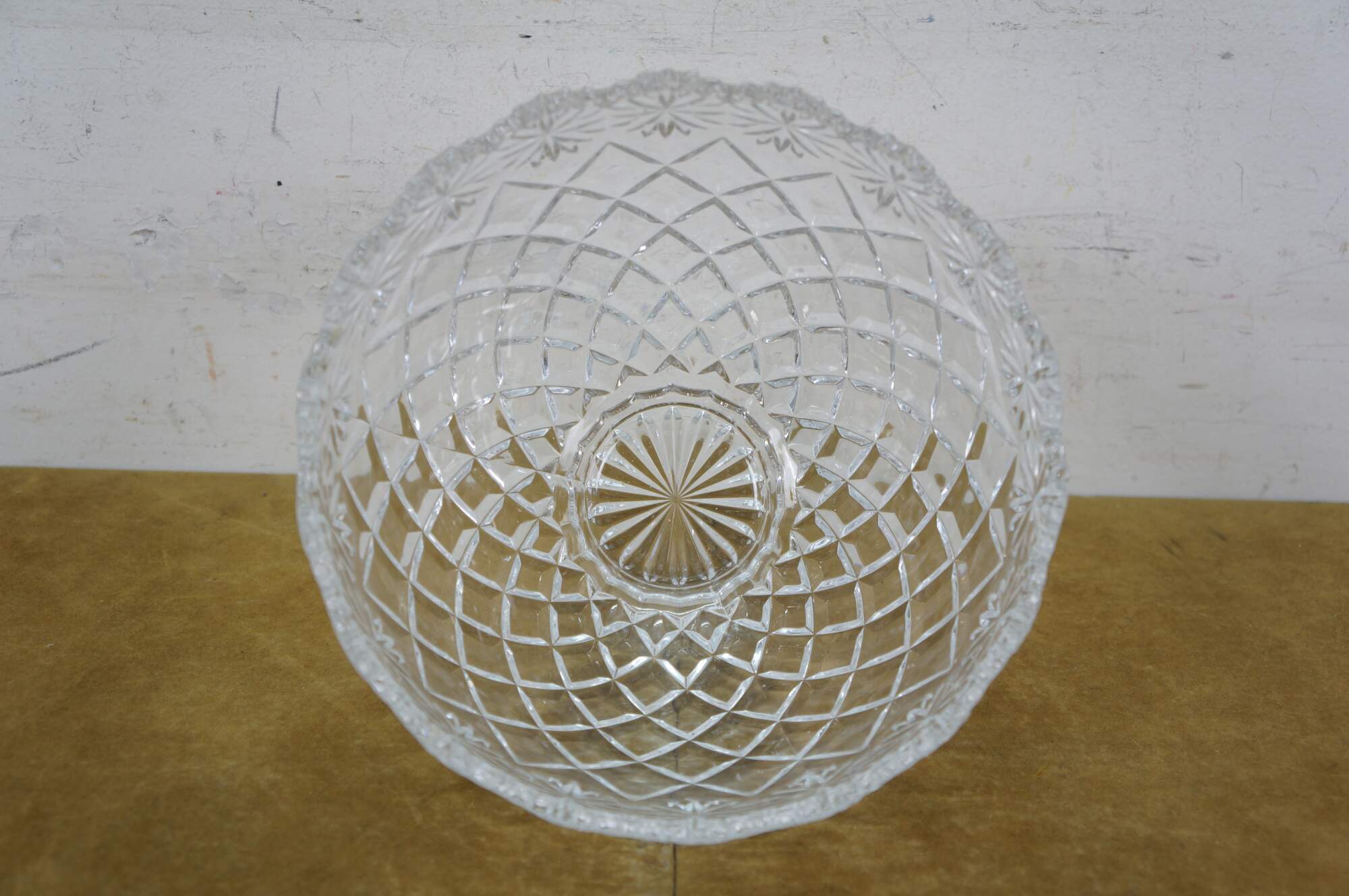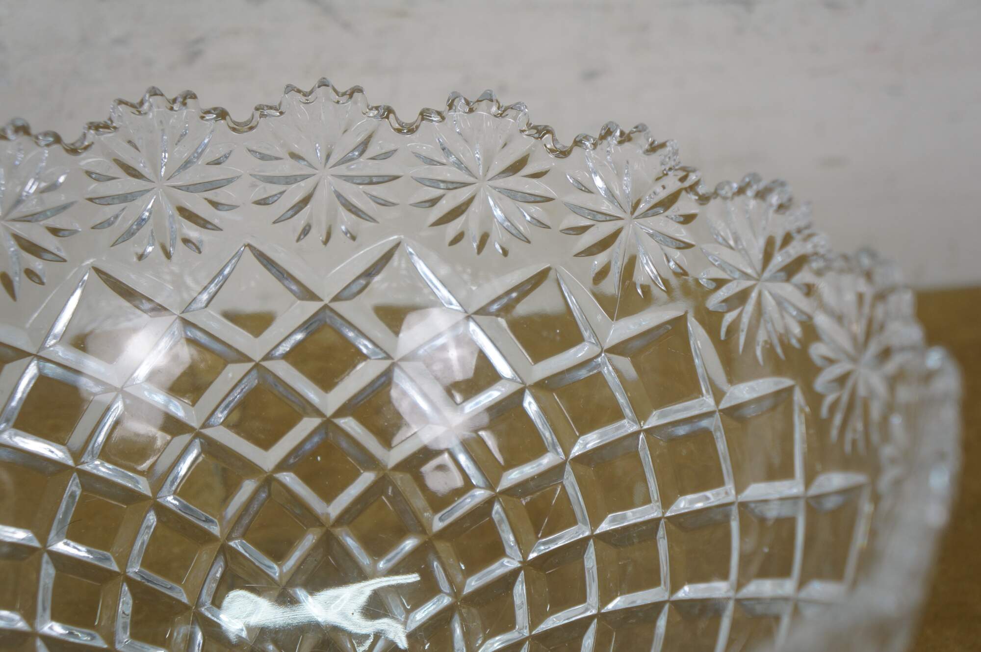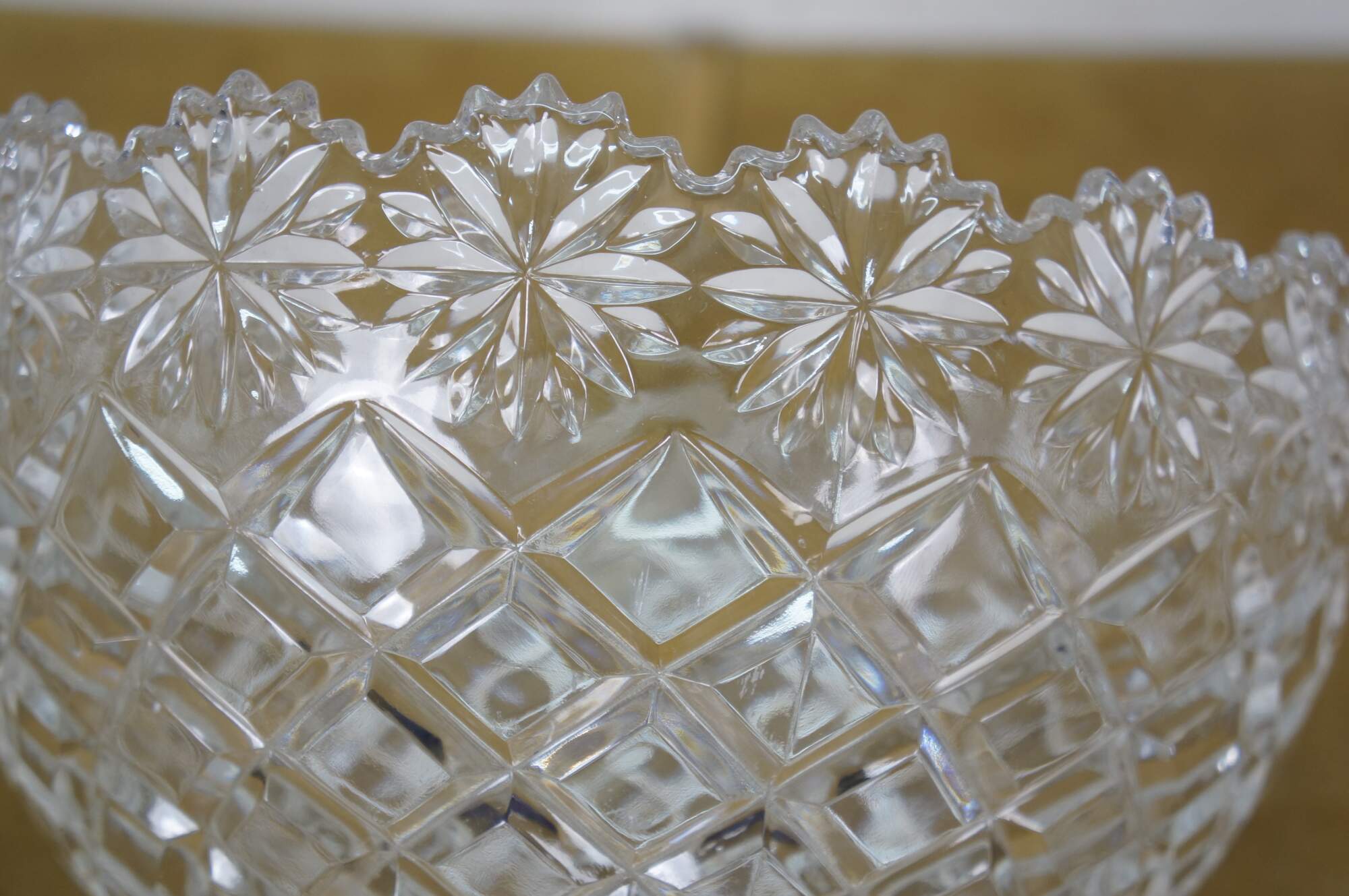 Early 21st century art deco style pressed glass Brussels Collection bowl / centerpiece by CrystalClear / Jay Imports. Round form tapering to a footed base, with diamond pattern sides and a floral /daisy border and sawtooth rim.