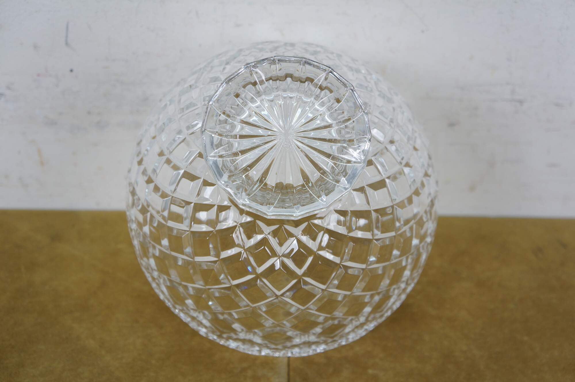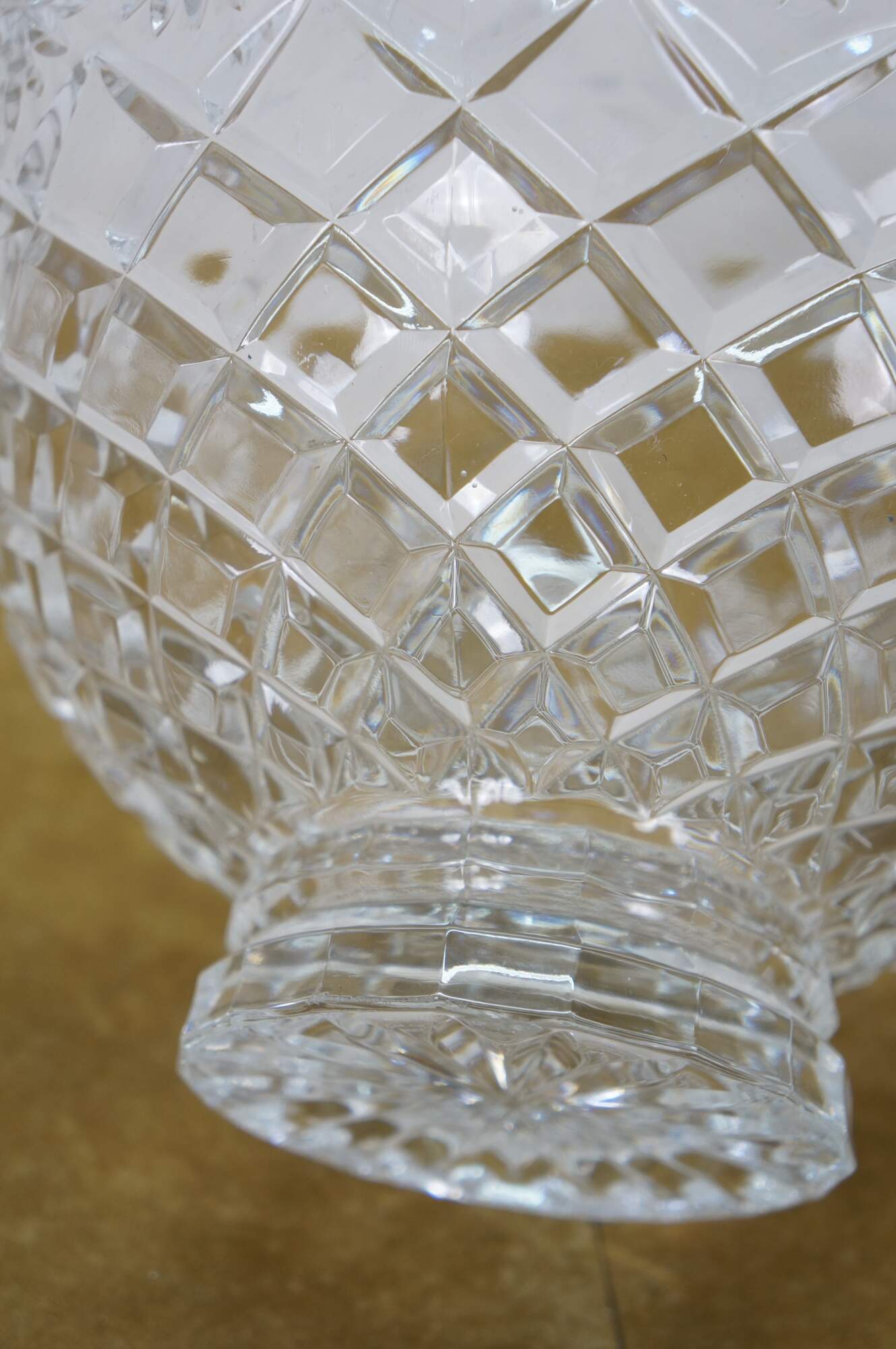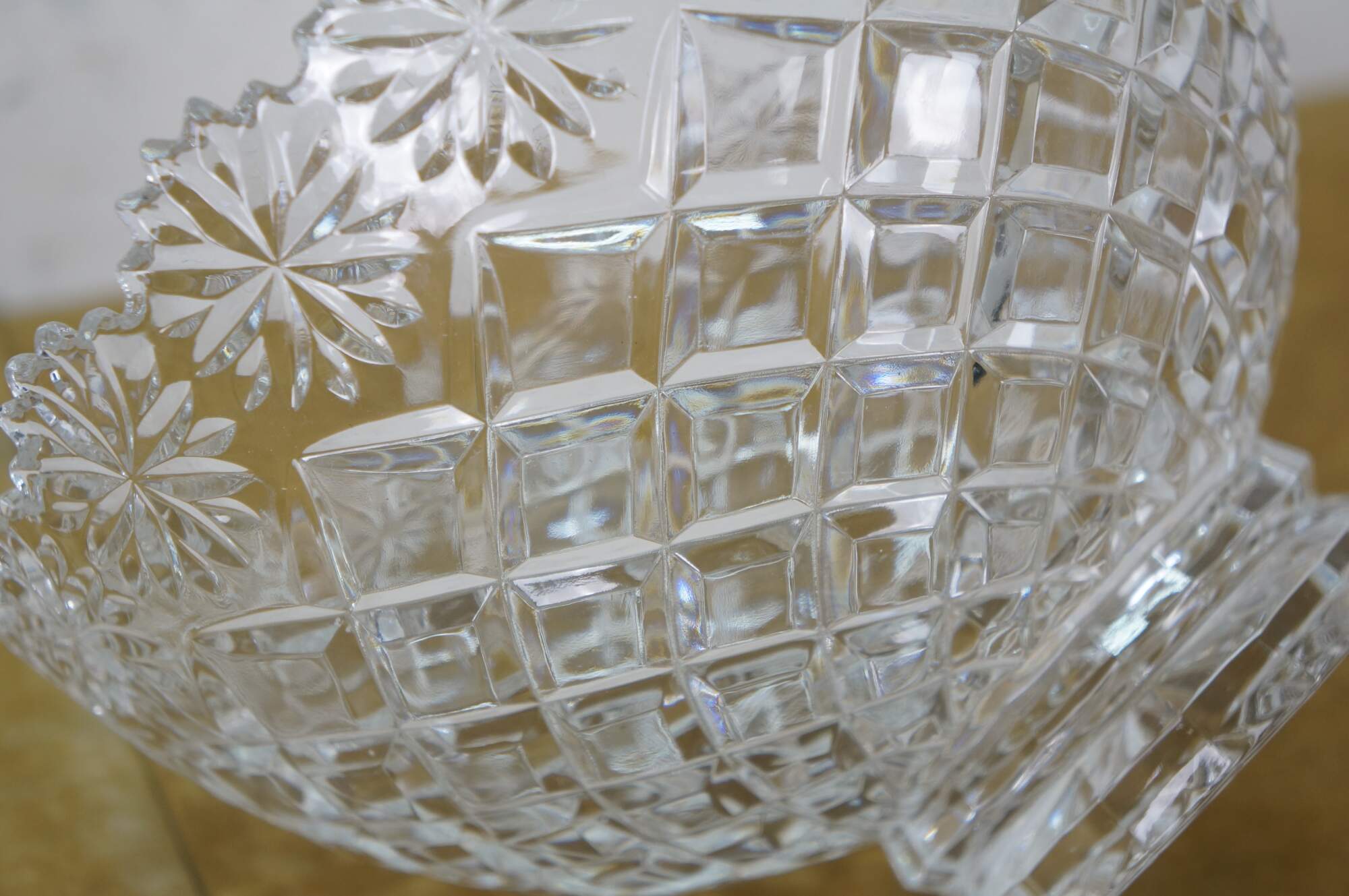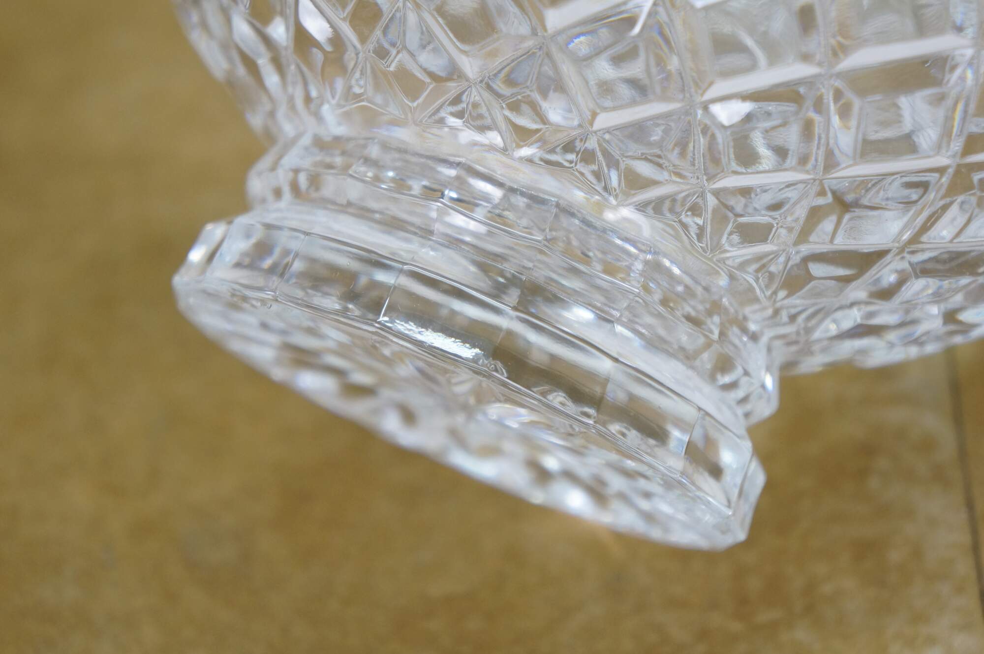 Early 21st century art deco style pressed glass Brussels Collection bowl / centerpiece by CrystalClear / Jay Imports. Round form tapering to a footed base, with diamond pattern sides and a floral /daisy border and sawtooth rim.