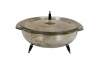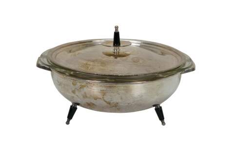 Mid 20th century silverplate chafing dish / buffet server by W&S Blackinton. Round form with mid century modern styling, black and silver peg feet and finial on the lid. Includes 024 2 Qt PYREX borosilicate glass insert, Made in USA, G-16.