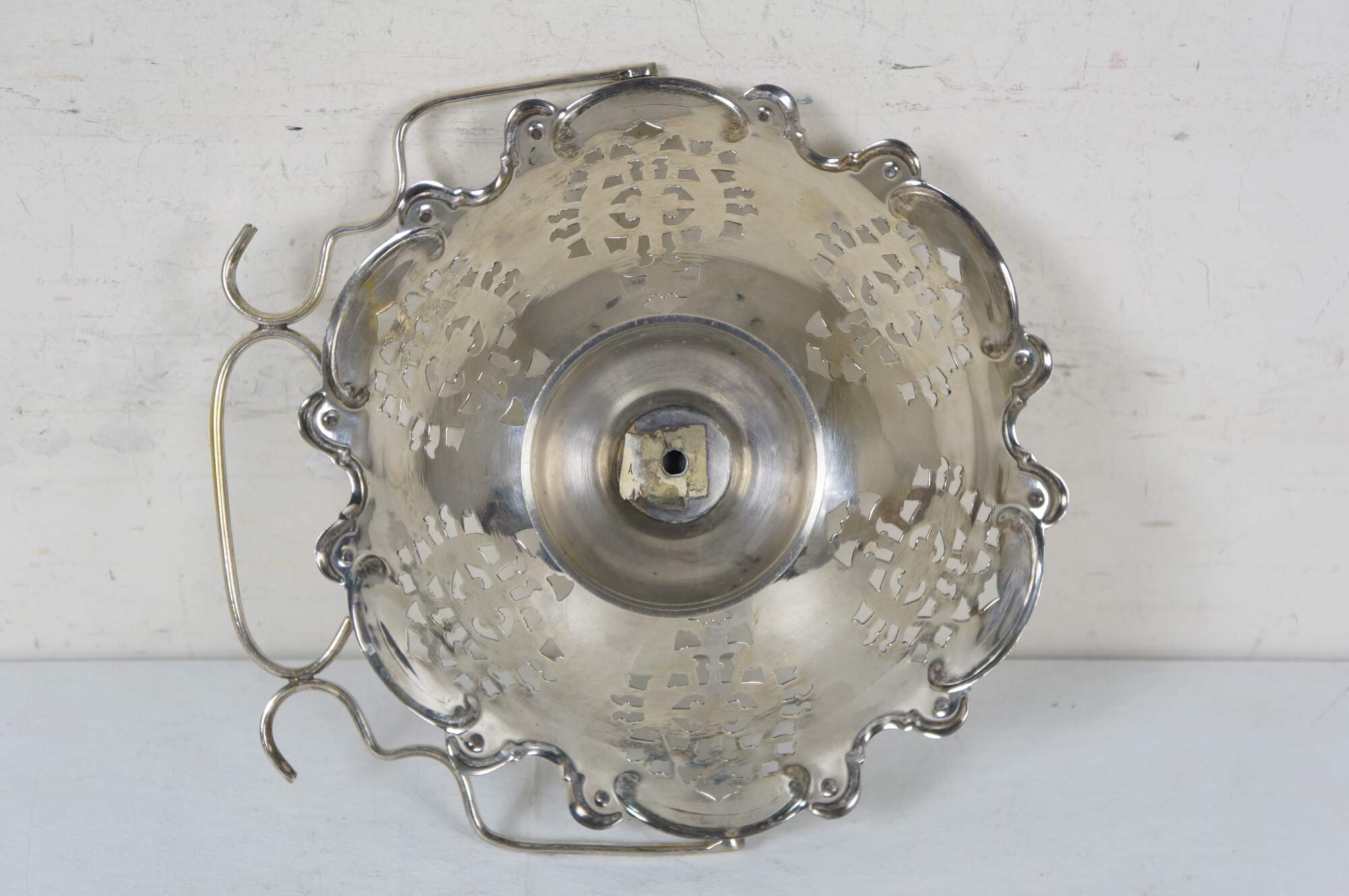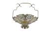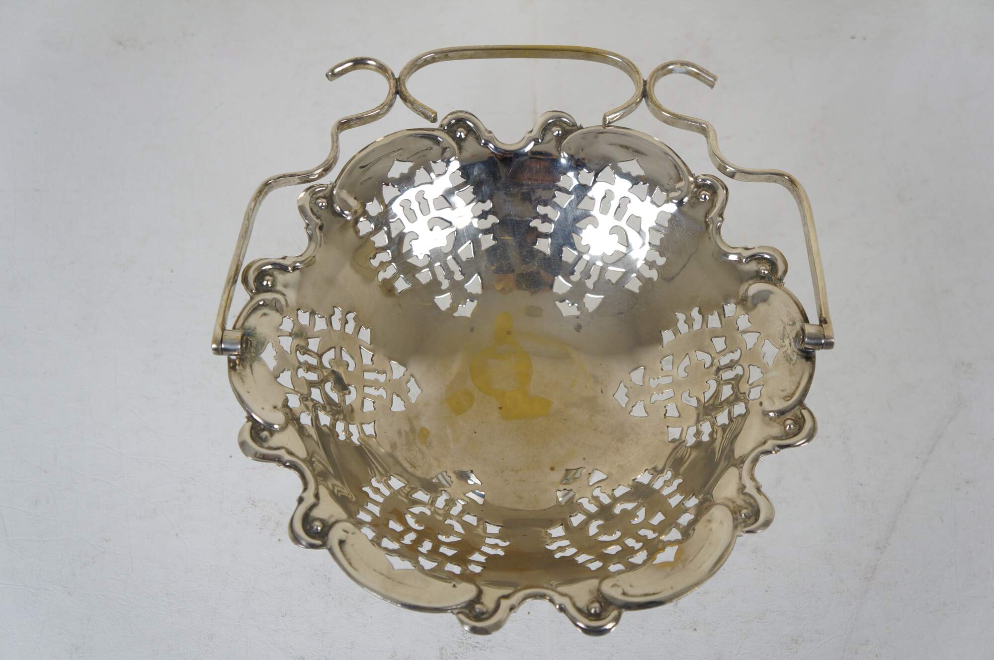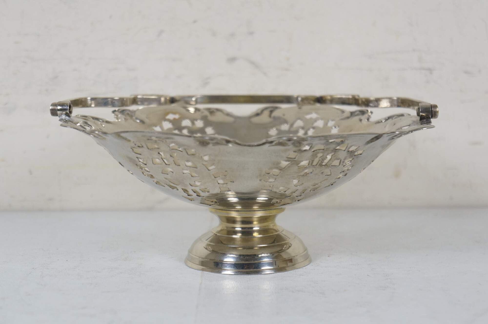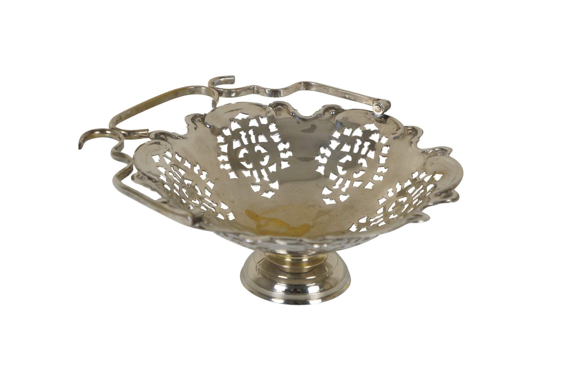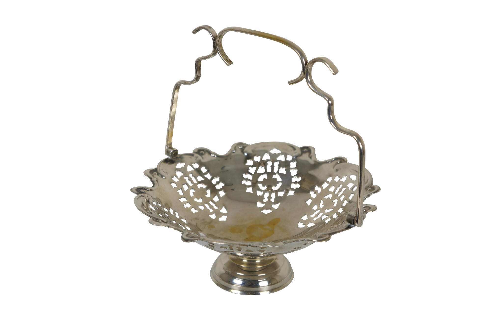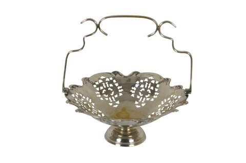 Vintage 20th century silverplate bride's basket / centerpiece - round form with a scalloped edge, pedestal base, pierced sides and rotating bail handle.