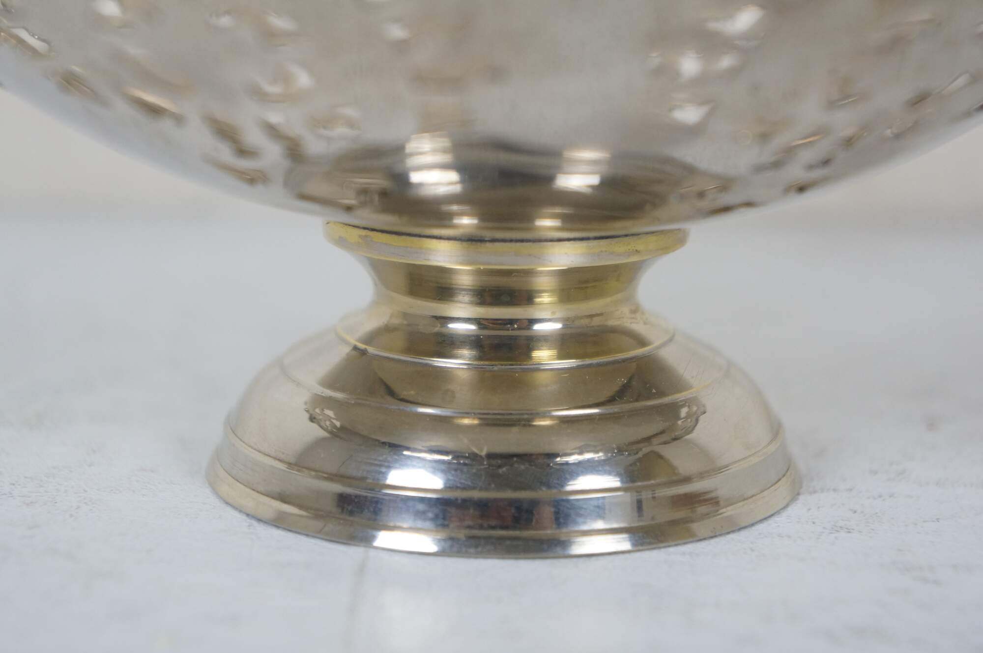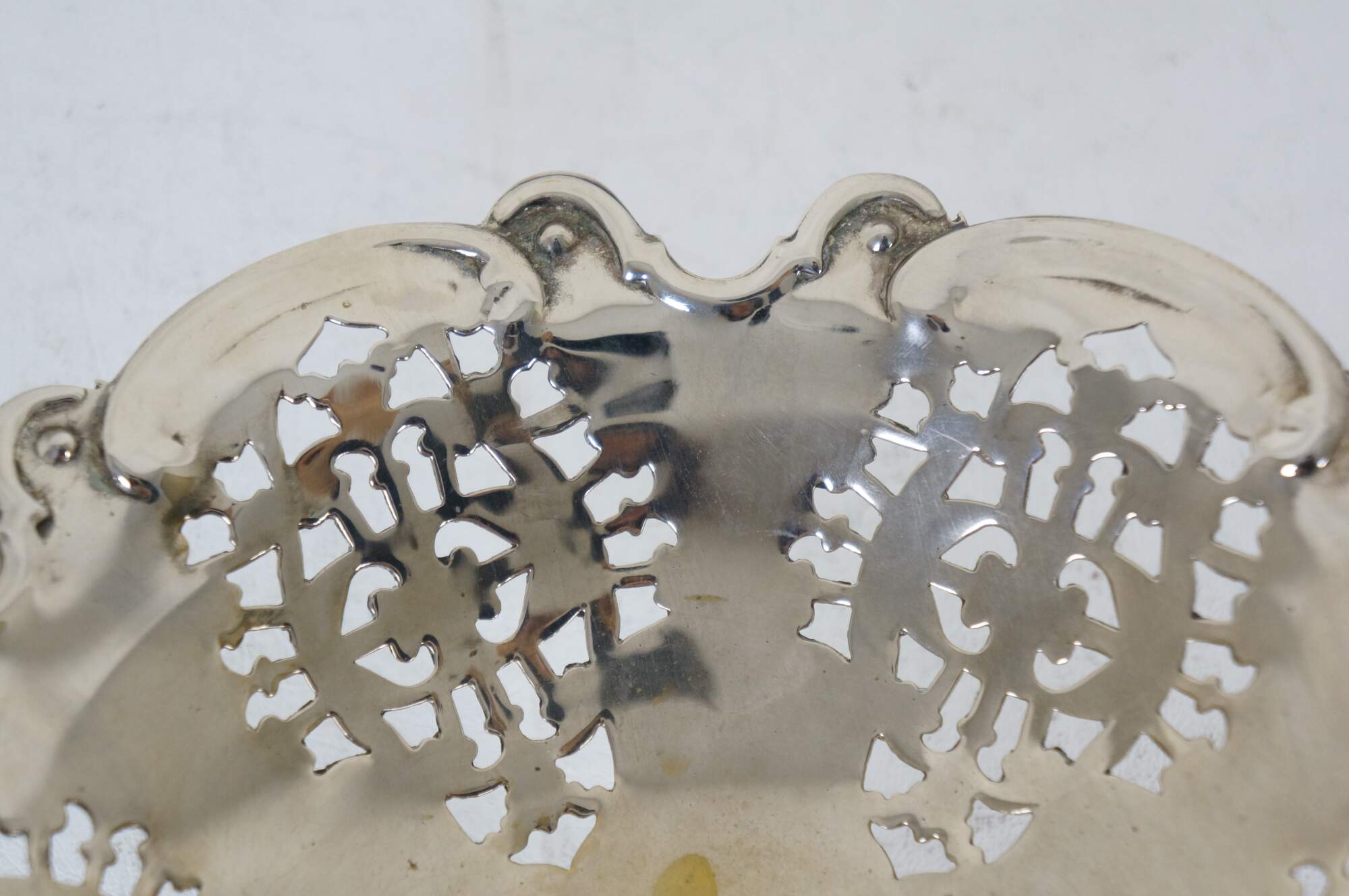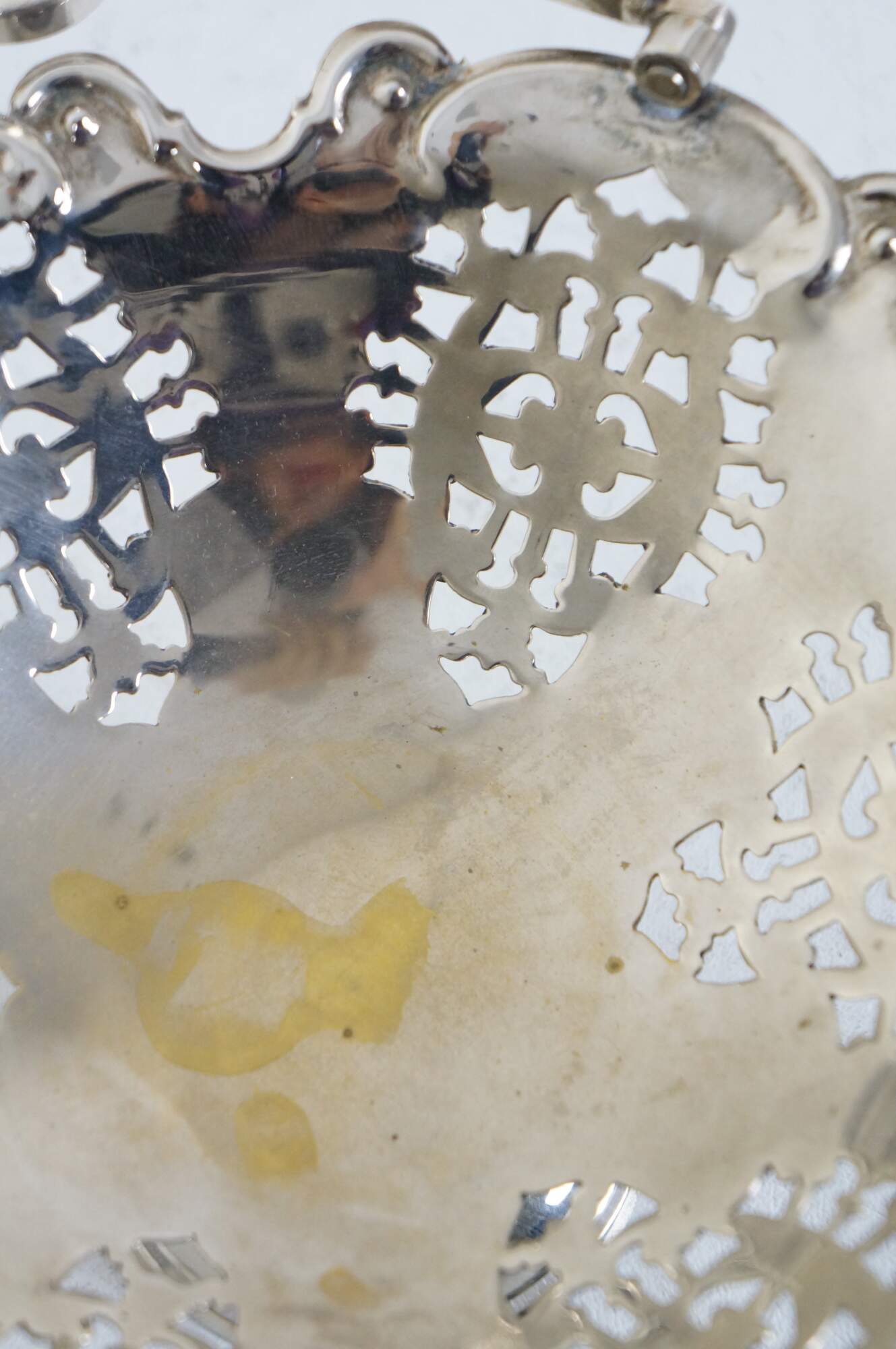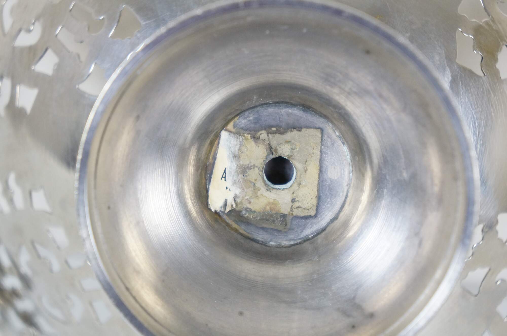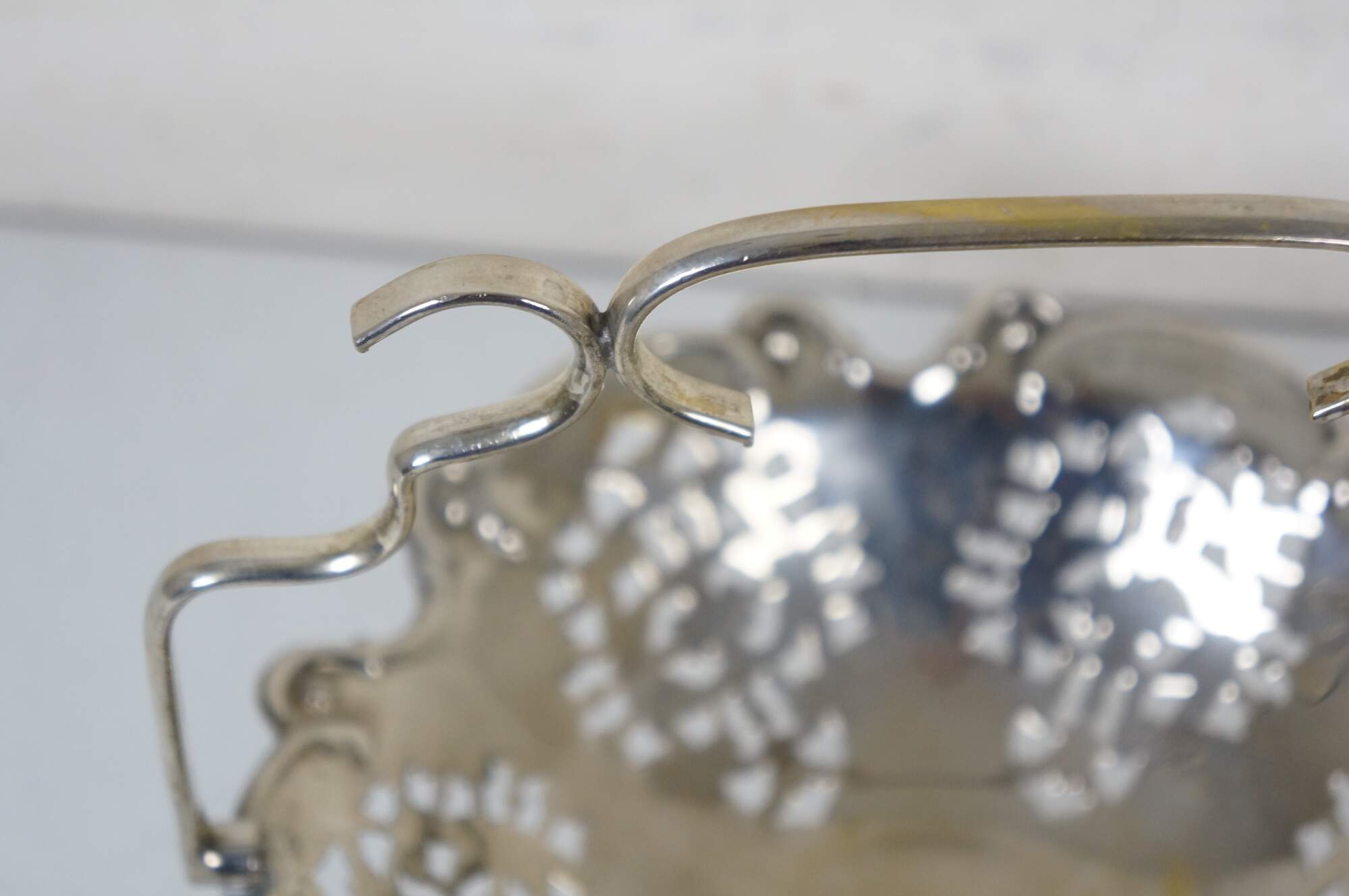 Vintage 20th century silverplate bride's basket / centerpiece - round form with a scalloped edge, pedestal base, pierced sides and rotating bail handle.