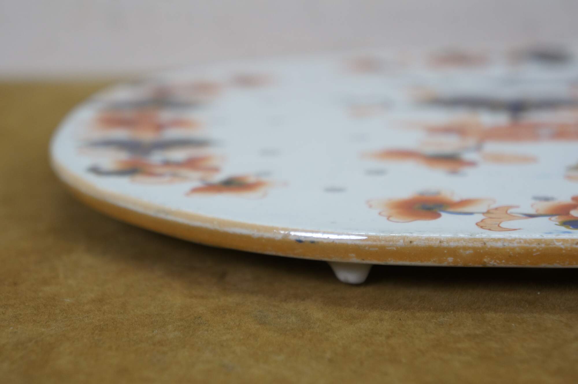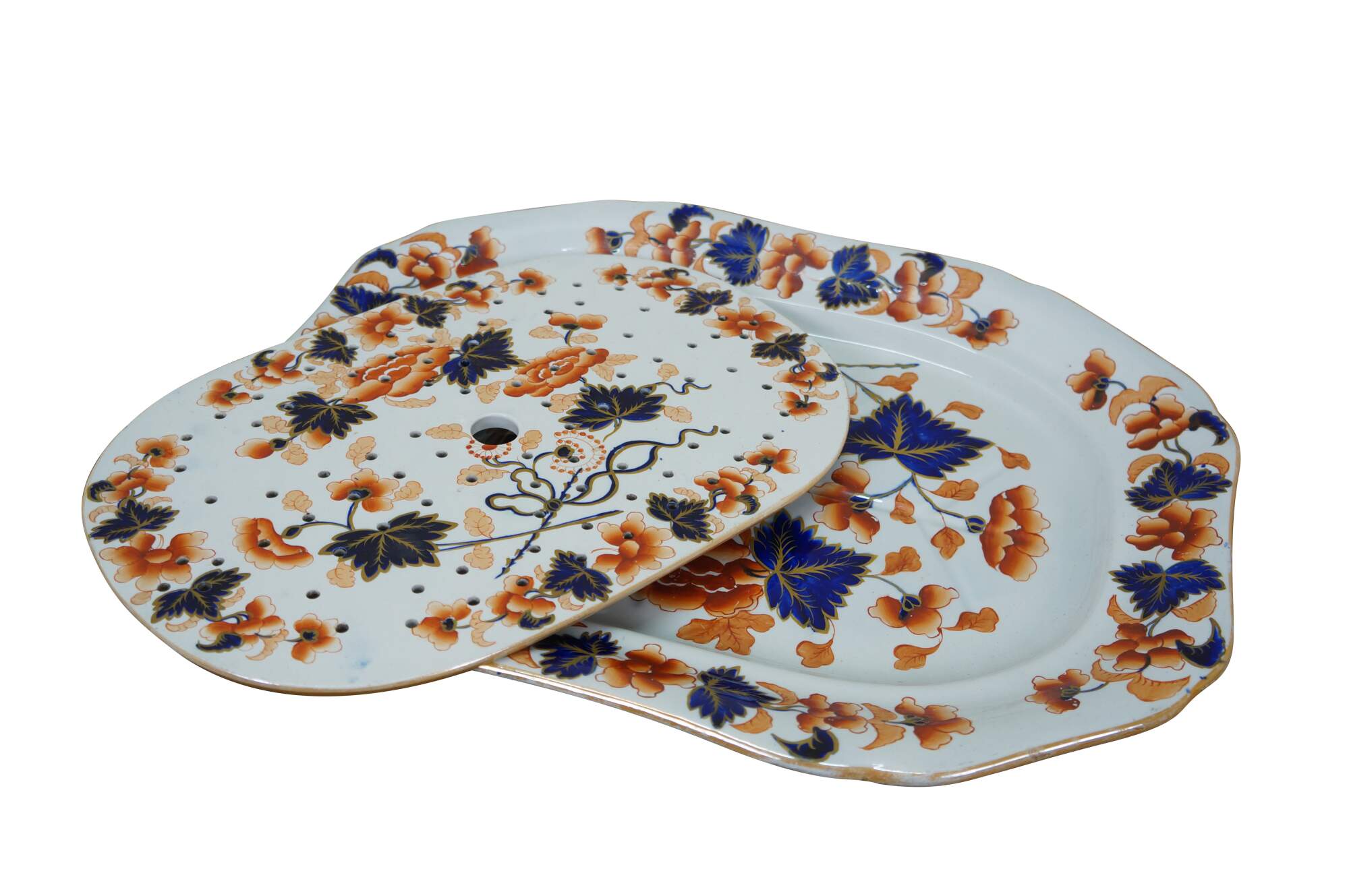 Rare antique late 19th to early 20th century stone china / ironstone porcelain two part meat platter set. Rounded rectangular shape with scalloped edge, hand painted with an Imari style floral and foliate pattern in cobalt blue and orange with gilt details. Includes base with incised grooves and reservoir for drippings and a removable upper portion pierced throughout with holes.