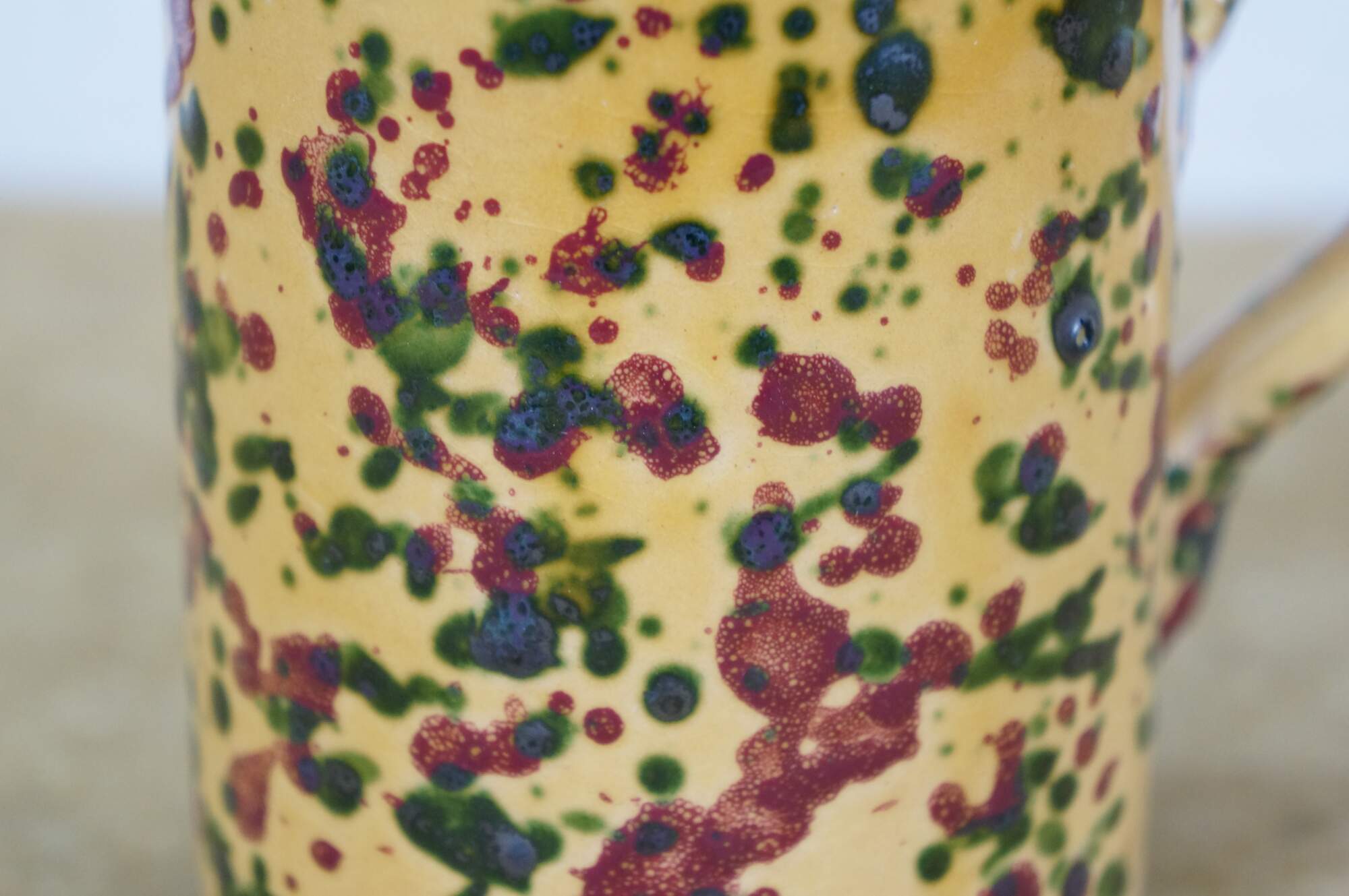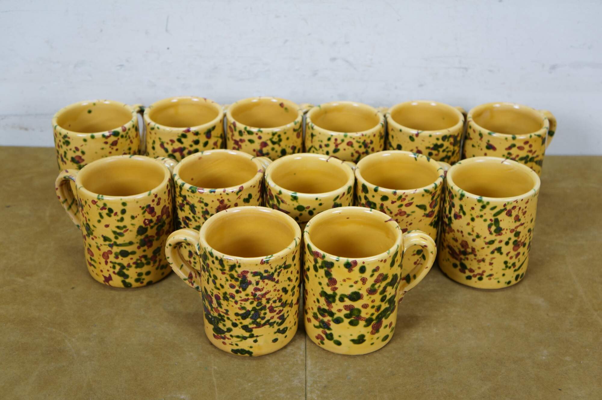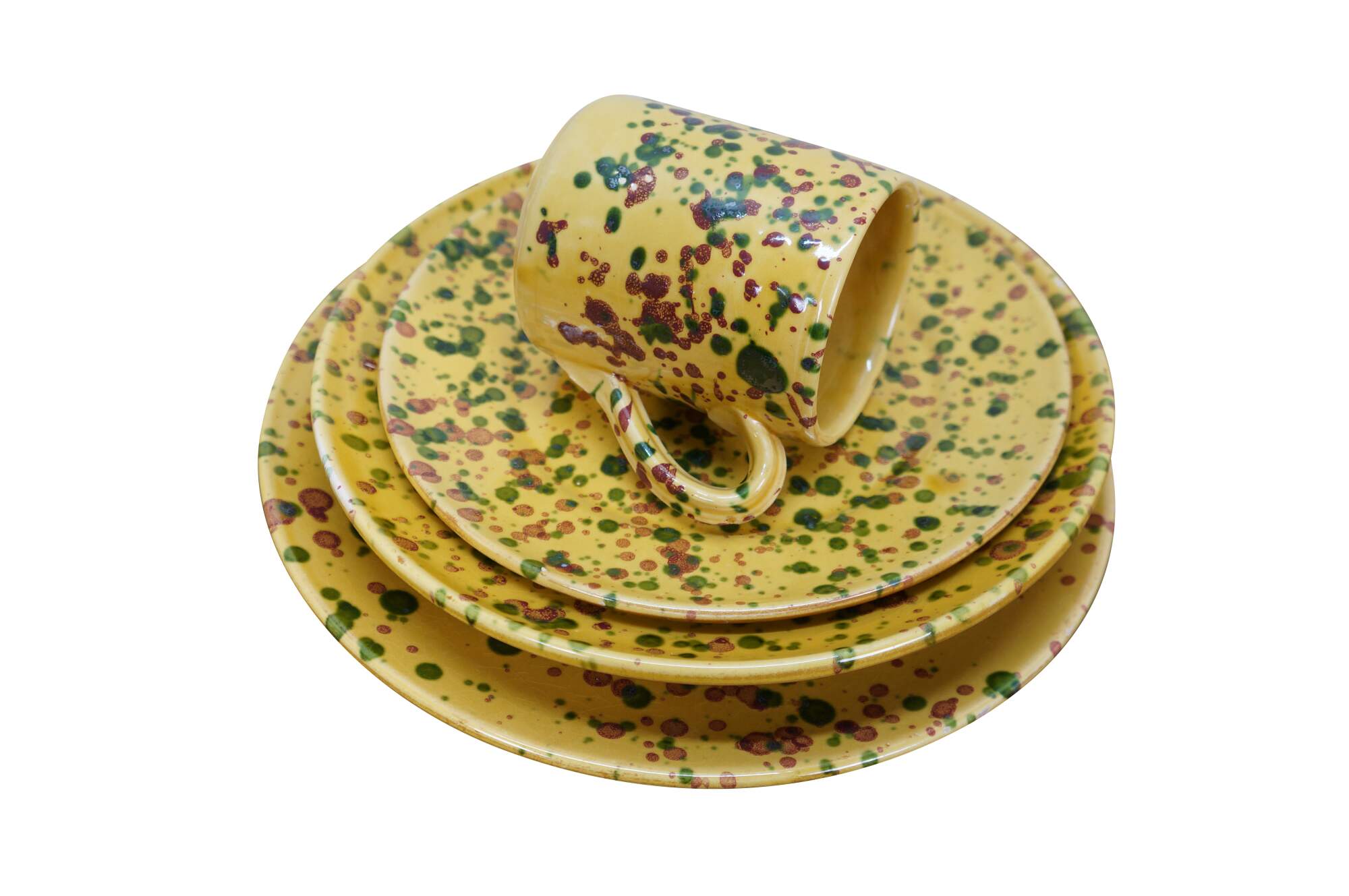 Vintage 45 piece set of Horchow Italian earthenware pottery dinnerware. Glazed in yellow and speckled with red and green spots. Set includes: 8 Dinner Plates, 13 Bread Plates, 11 Soup Bowls, 13 Mugs / Cups. Made in Italy.
