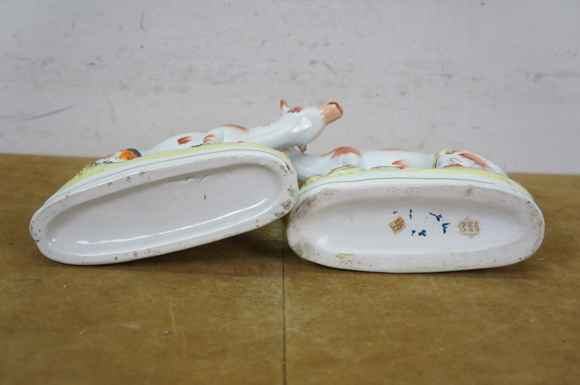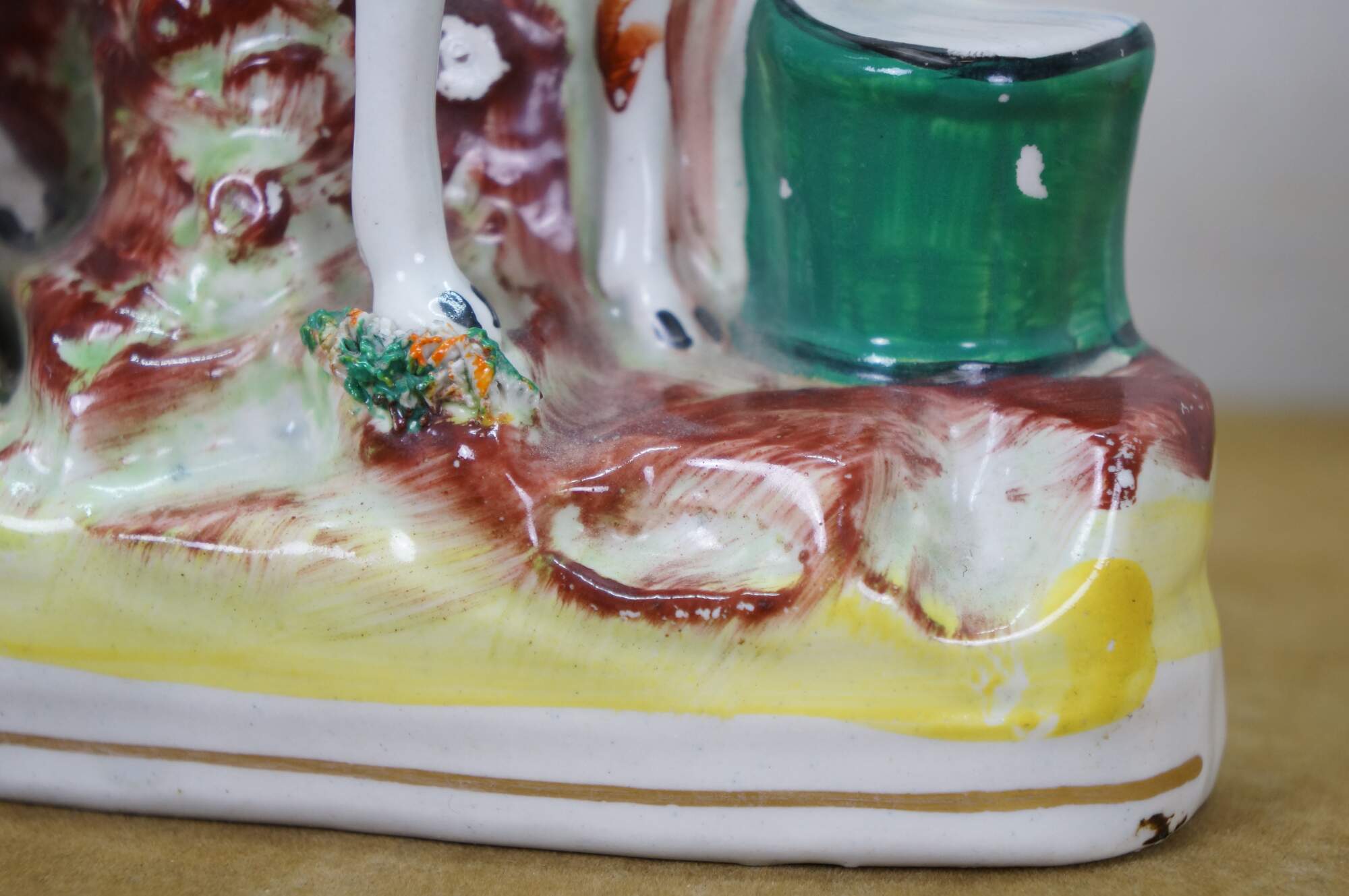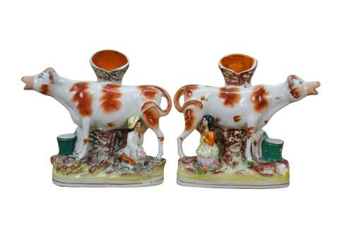 Pair of late 19th century Staffordshire porcelain flatback spill vase figurines depicting red and white cows, standing by a tree triunk and being milked by milkmaids with green buckets.