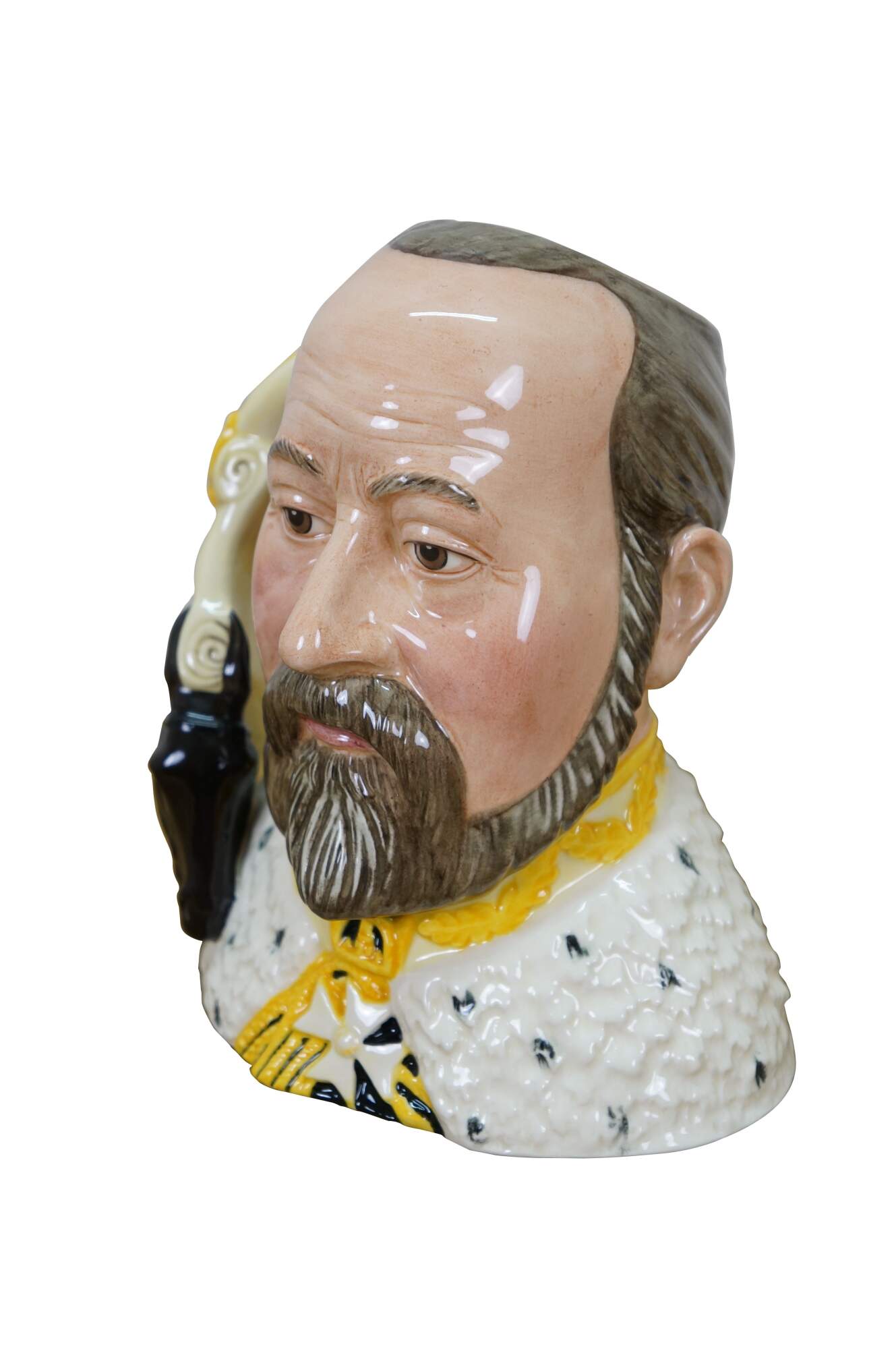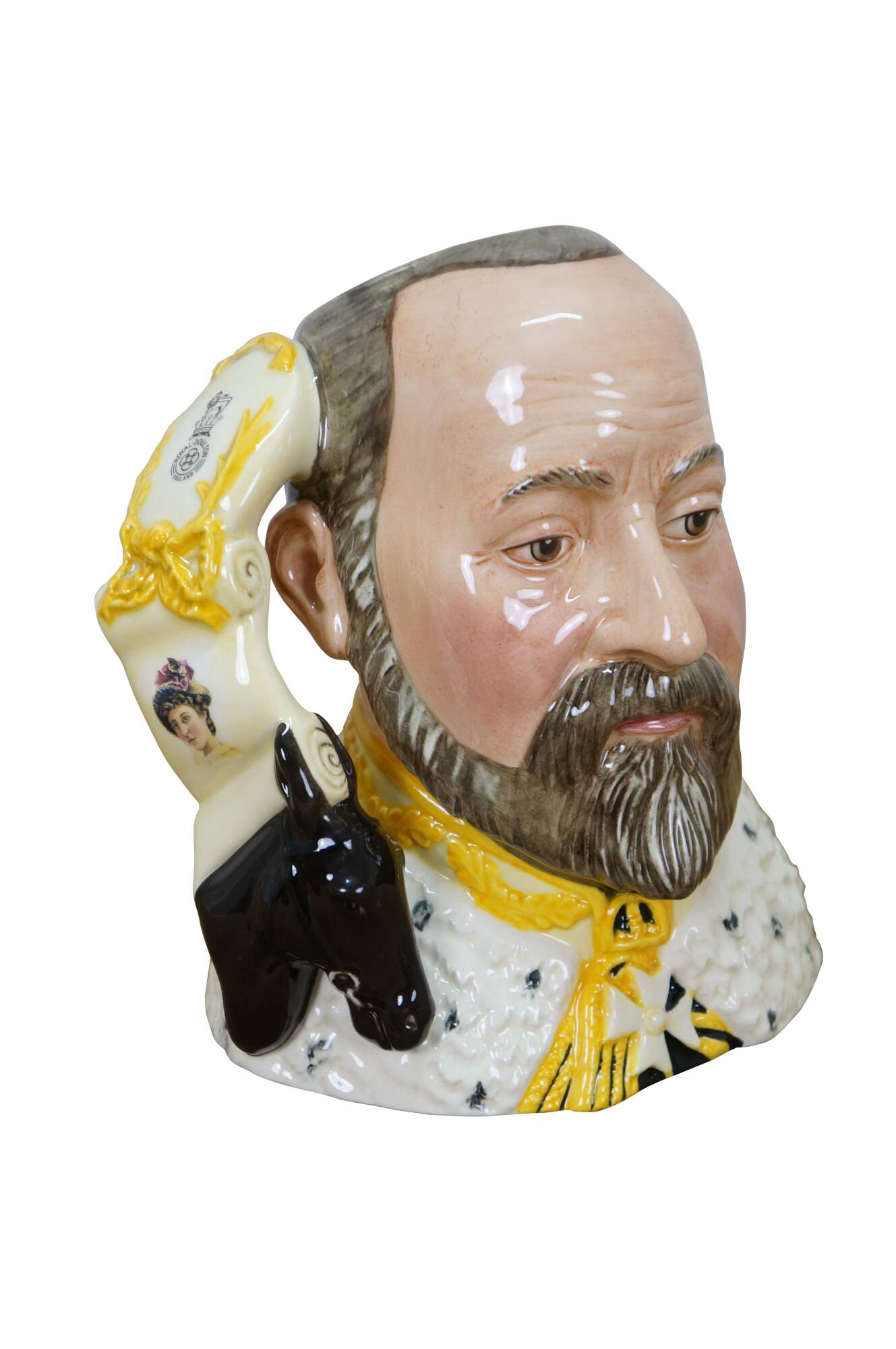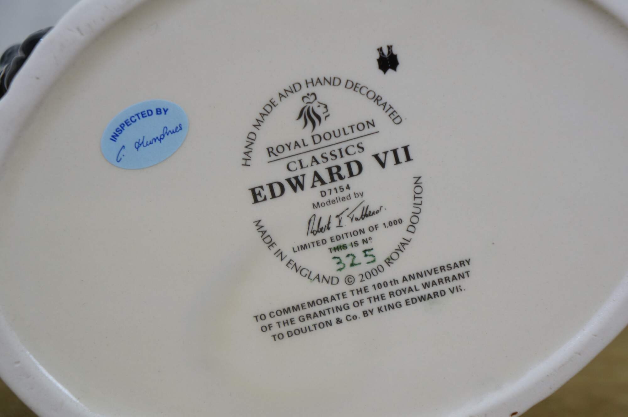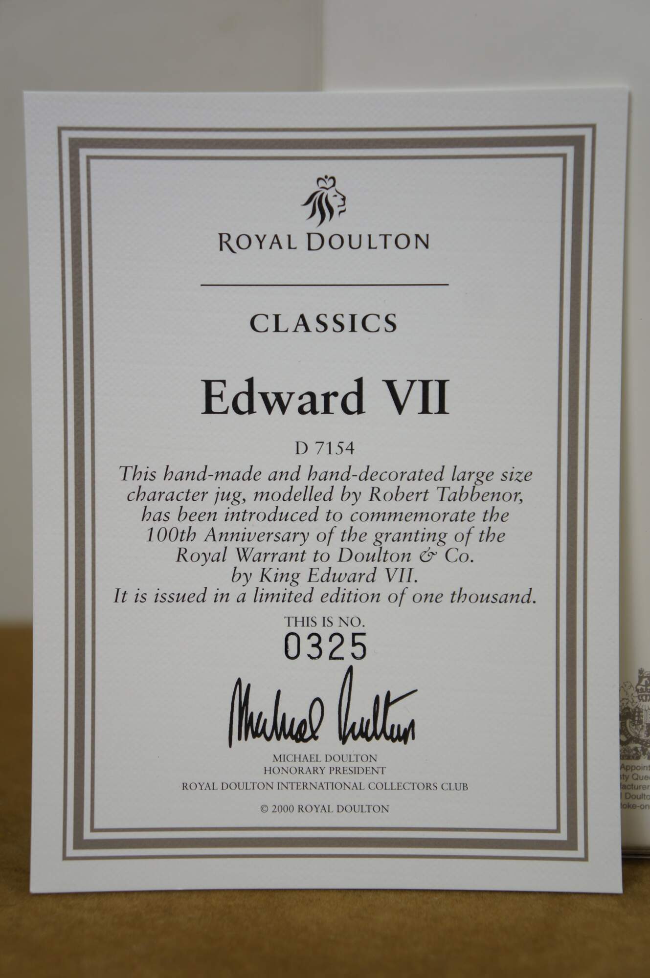 Vintage 2000 Royal Doulton Classics porcelain character jug number D7154, "Edward VII." Modelled by Robert Tabbenor. Limited Edition number 325/1000. Made in England. To Commemorate the 100th Anniversary of the Granting of the Royal Warrant to Doulton & Co. by King Edward VII. Includes original box and Certificate of Authenticity.