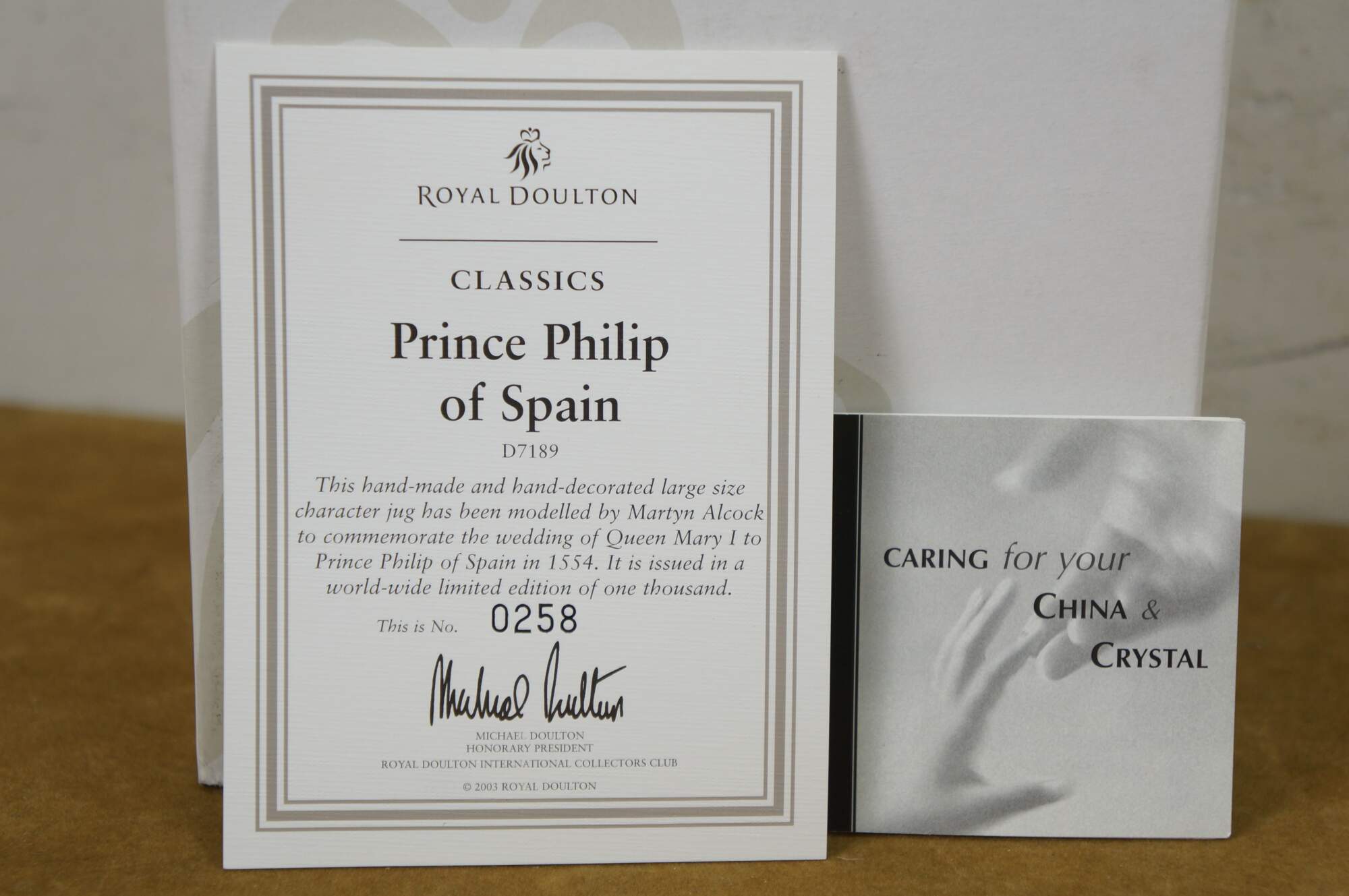 2003 Royal Doulton Classics porcelain character jug number D7189, "Prince Philip of Spain." Modelled by Martyn C.R. Alcock. Limited Edition number 258/1000. Made in England. To Commemorate the Wedding of Queen Mary I to Prince Philip of Spain 1554. Includes original box and Certificate of Authenticity.