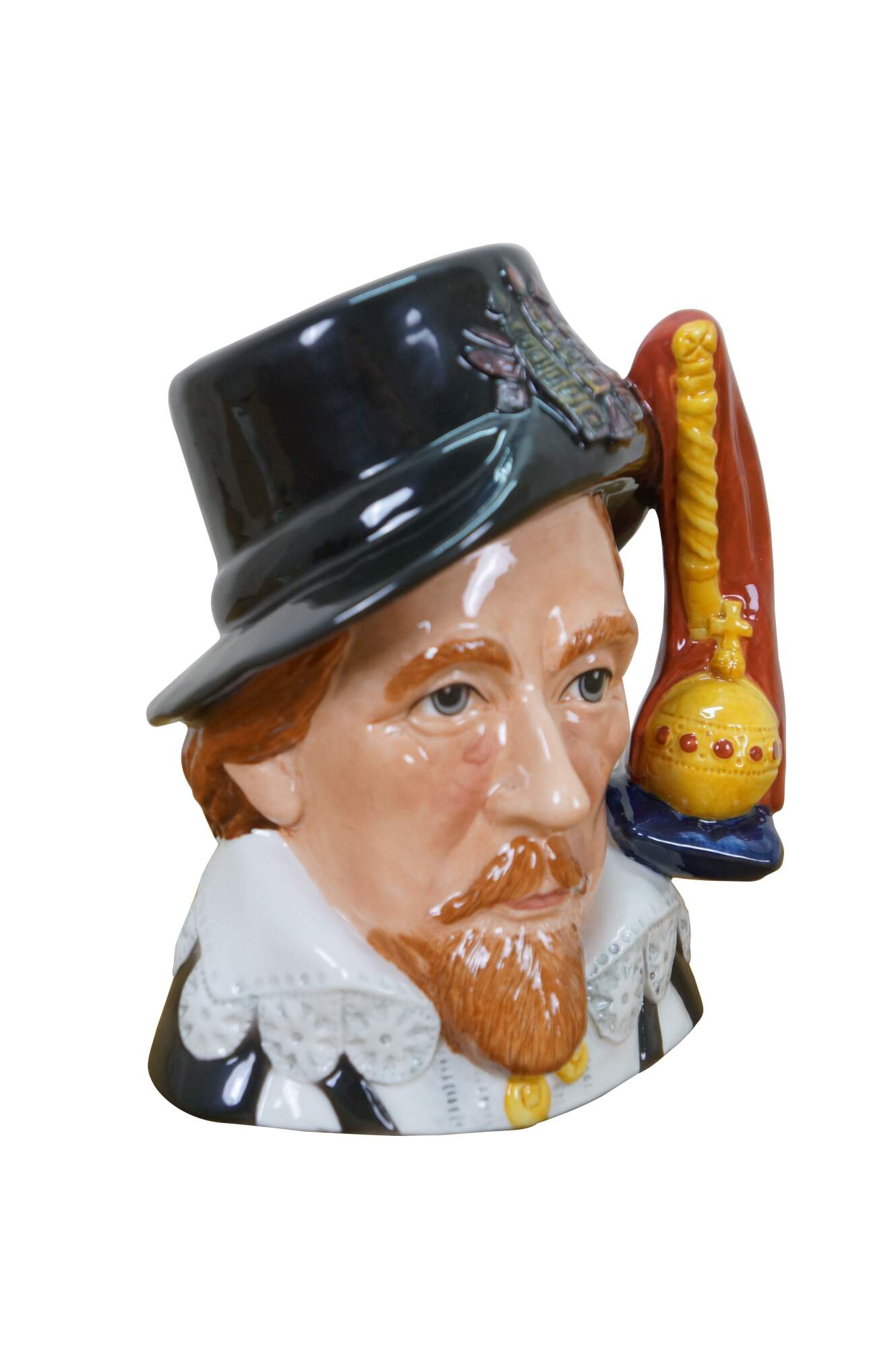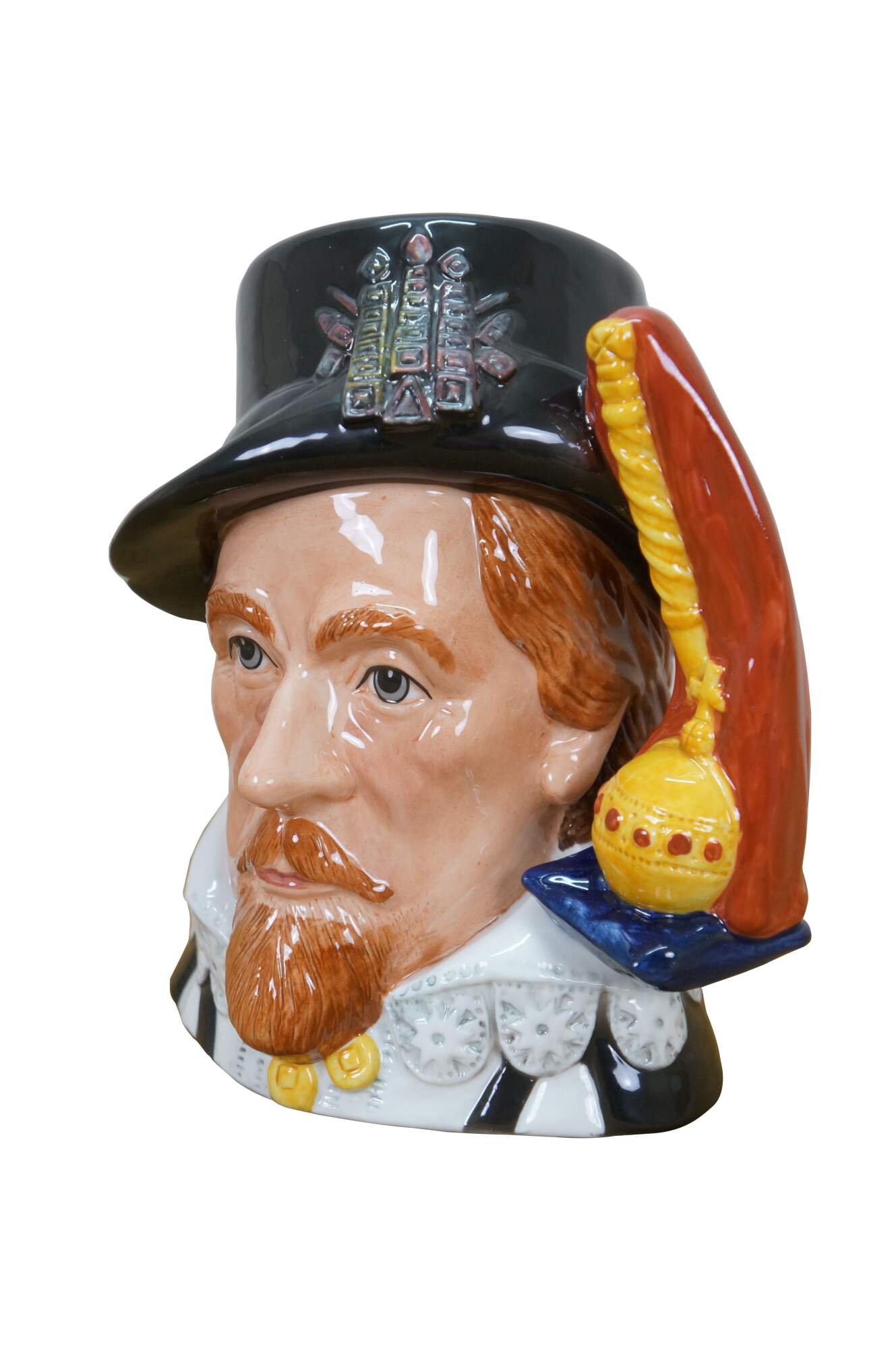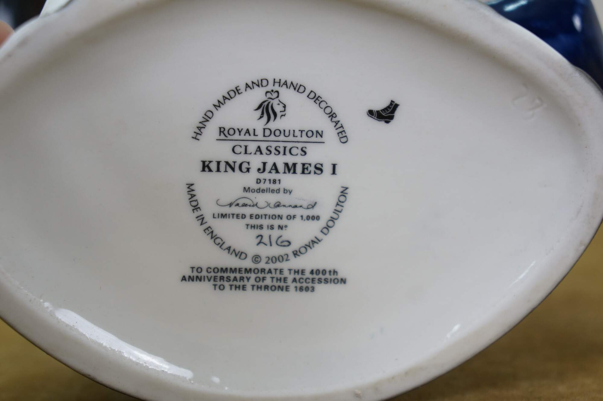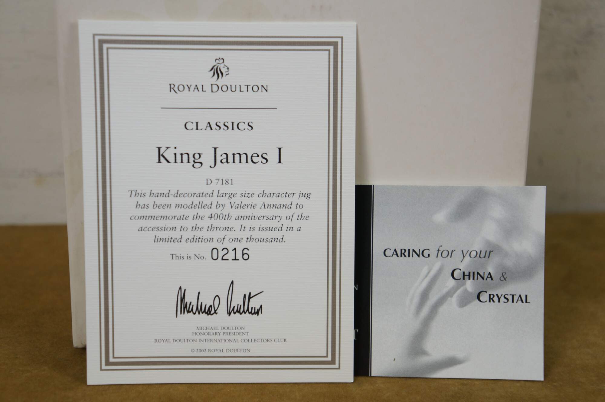 Vintage 2002 Royal Doulton Classics porcelain character jug number D7181, "King James I." Modelled by Valerie Annand. Limited Edition number 216/1000. Made in England. To Commemorate the 400th Anniversary of the Accession to the Throne 1603. Includes original box and Certificate of Authenticity.
