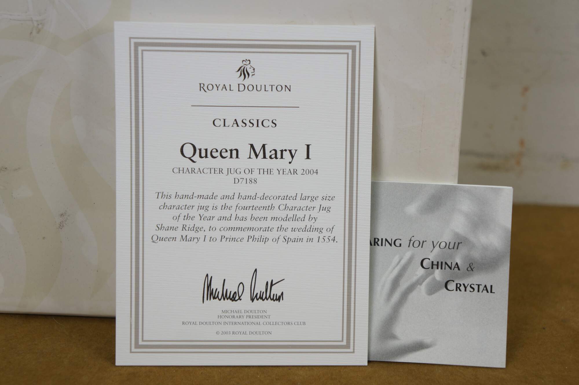 2003 Royal Doulton Classics porcelain Character Jug of the Year 2004 number D7188, "Queen Mary I." Modelled by Shane Ridge. Made in England. To Commemorate the Wedding of Queen Mary I to Prince Philip of Spain 1554. Includes original box and Certificate of Authenticity.