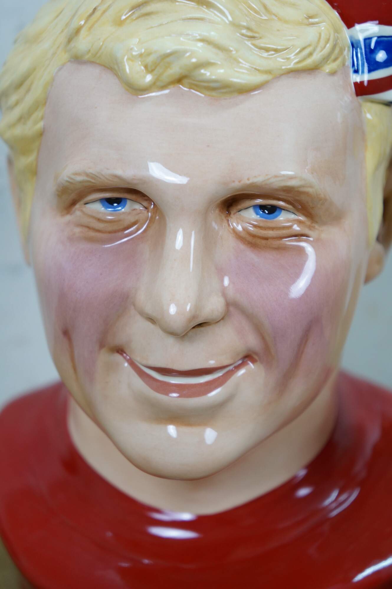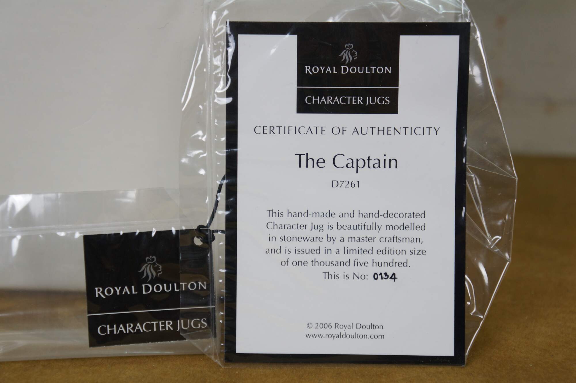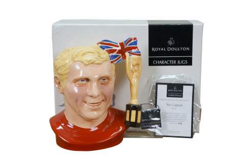 2006 Royal Doulton porcelain character jug number D7261, "The Captain" depicting Bobby Moore. Modelled by Timothy Patby(?). Limited Edition number 134/1500. Made in Thailand. Includes original box and Certificate of Authenticity.