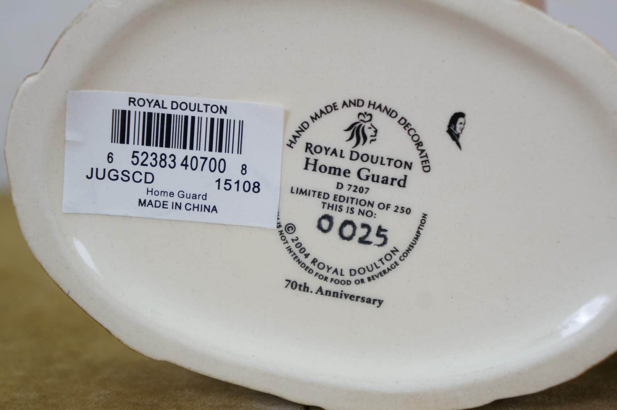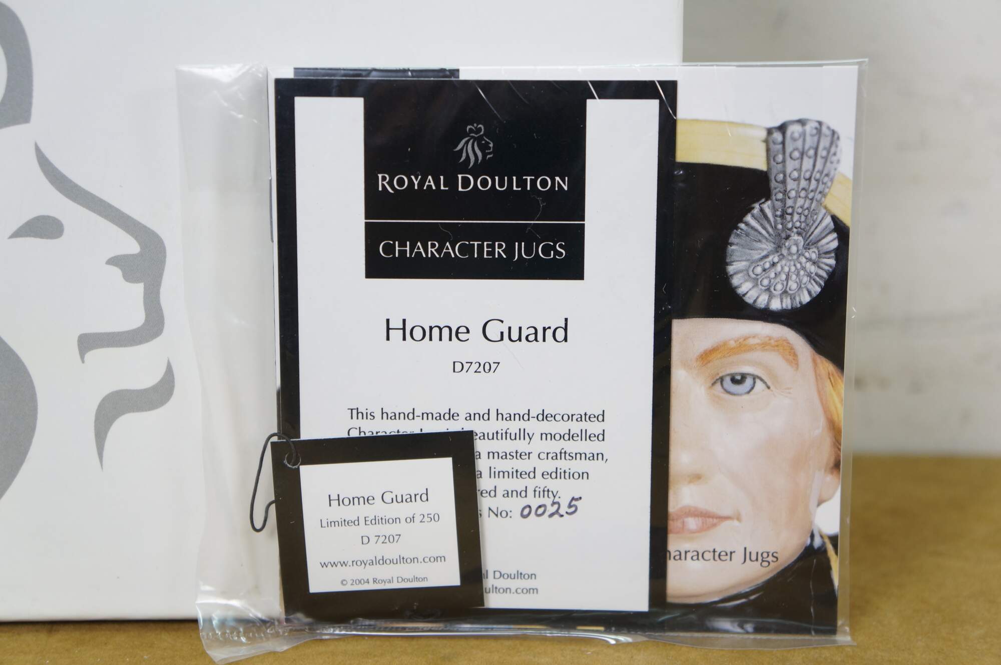 Vintage 2004 Royal Doulton 70th Anniversary porcelain character jug number D7207, "Home Guard." Limited Edition number 25/250. Made in China. Includes original box and Certificate of Authenticity.