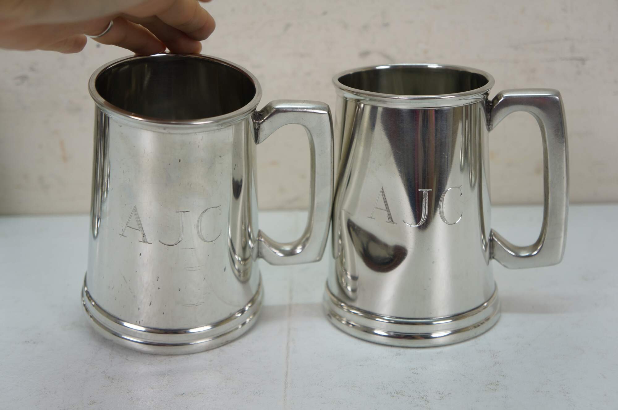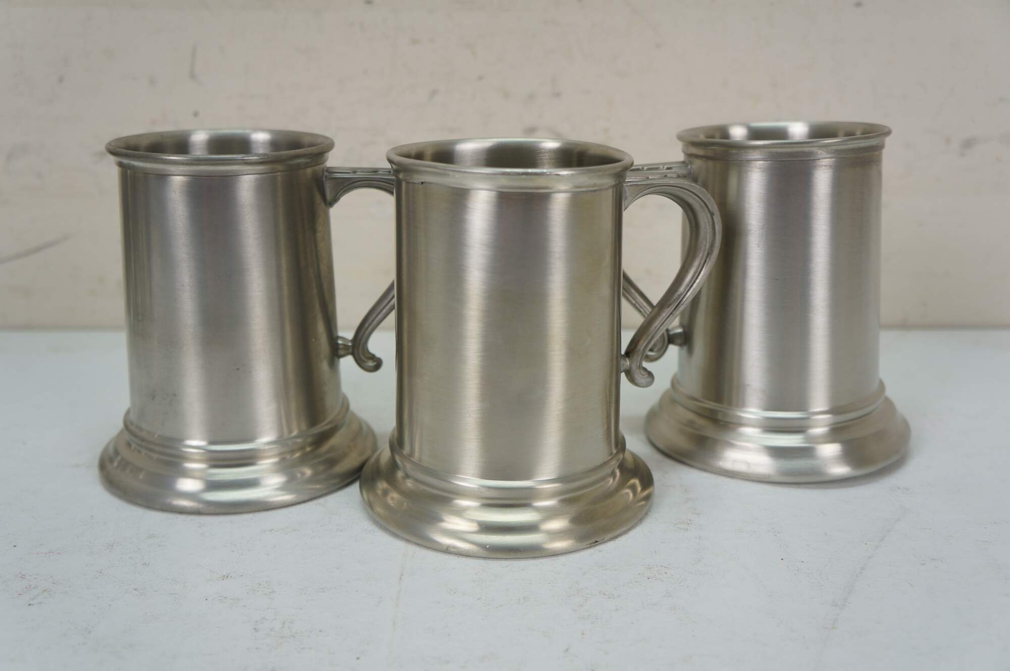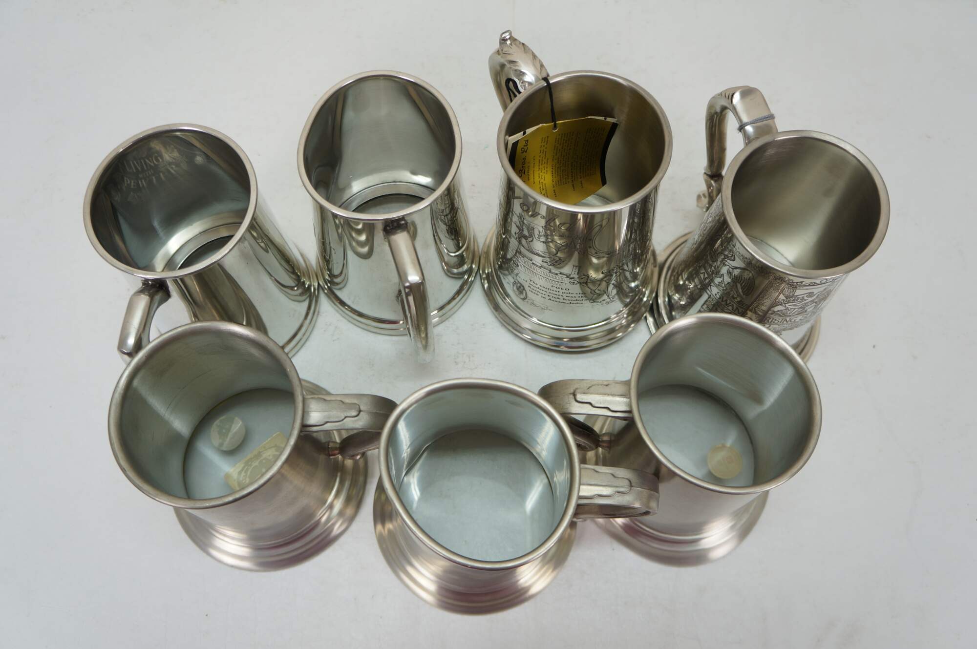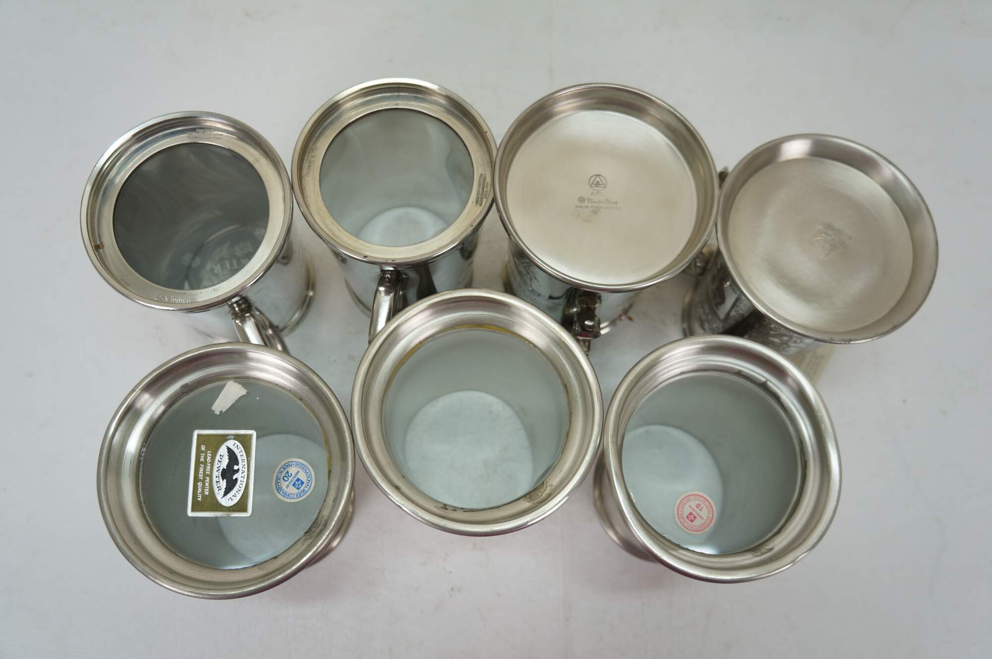Lot of seven circa 1970's pewter drinking mugs. Two by International Pewter, two by Hahne & Company, one by Pinder Bros, and one by Arcadia Pewter