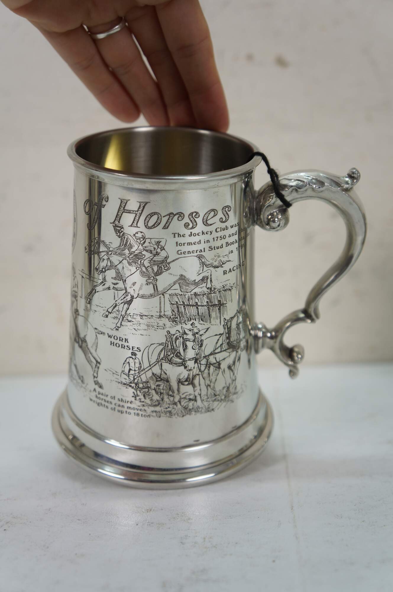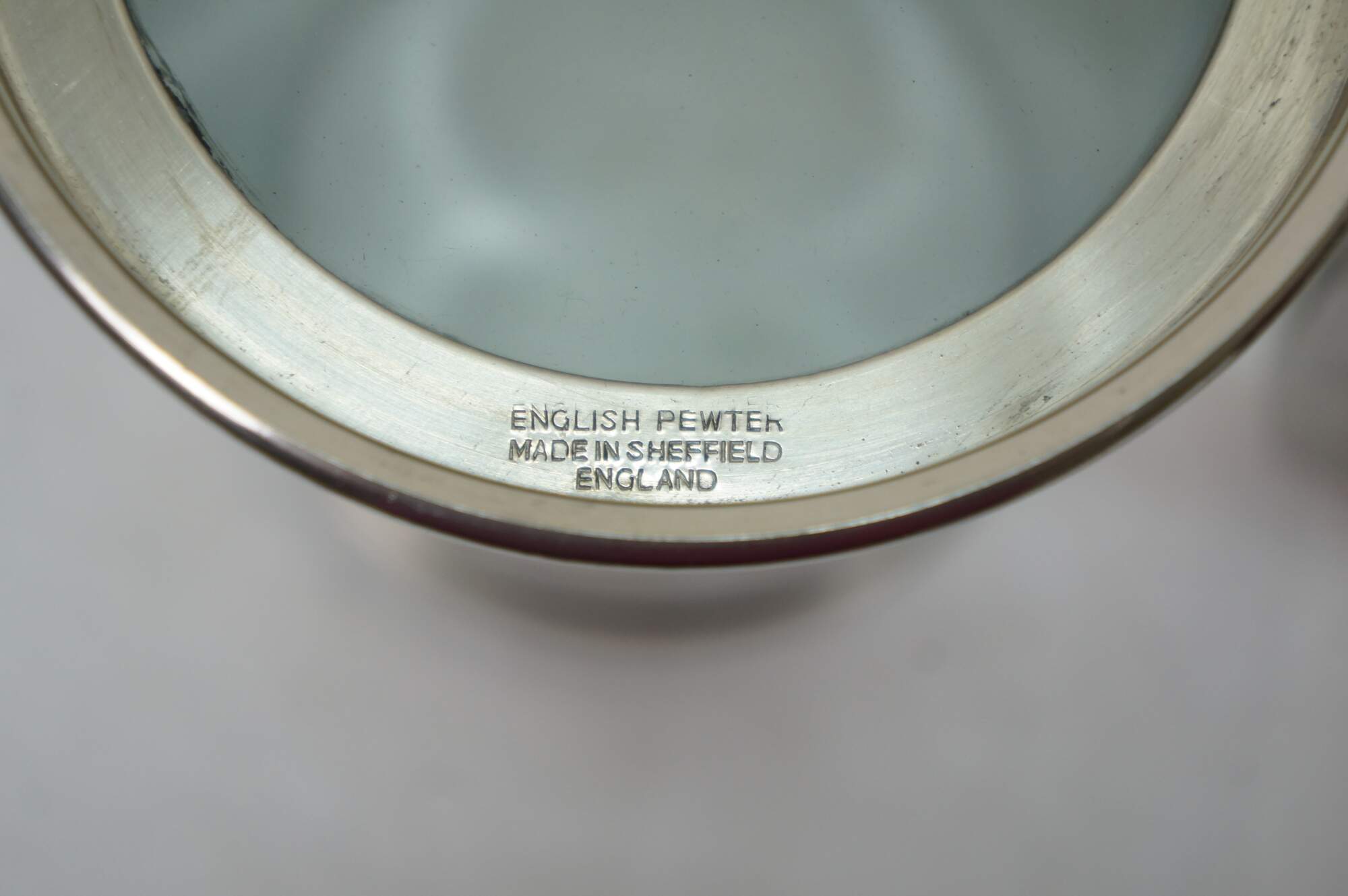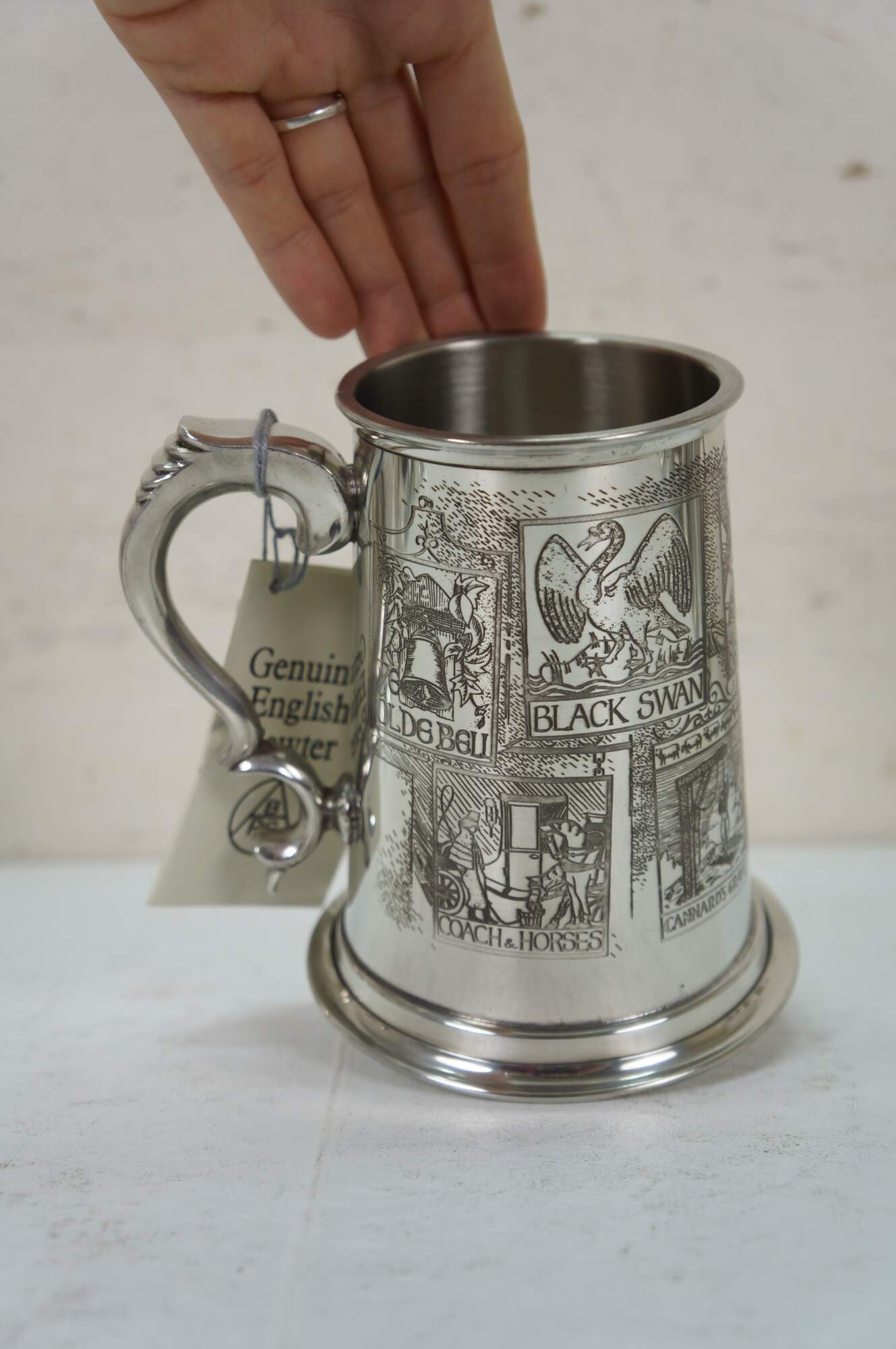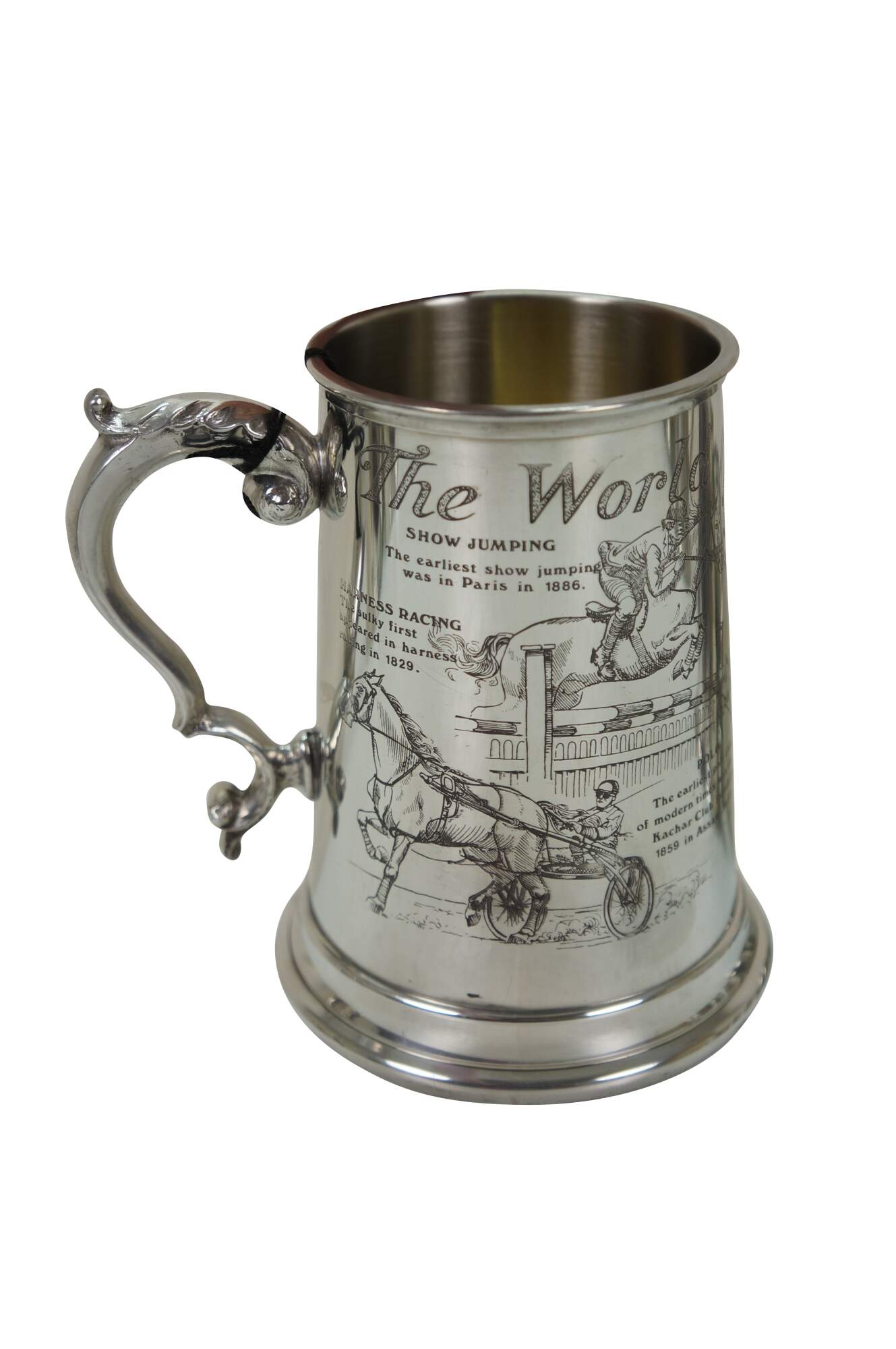 Lot of seven circa 1970's pewter drinking mugs. Two by International Pewter, two by Hahne & Company, one by Pinder Bros, and one by Arcadia Pewter