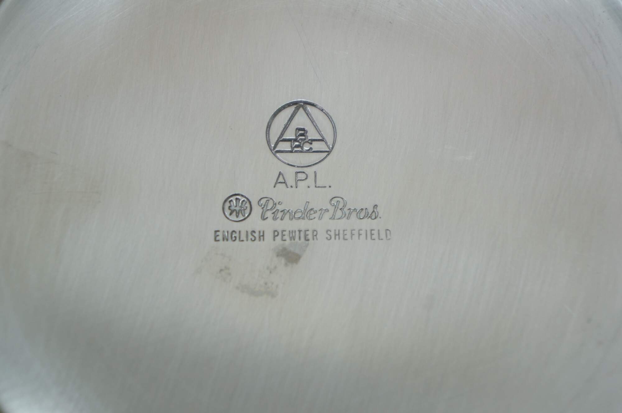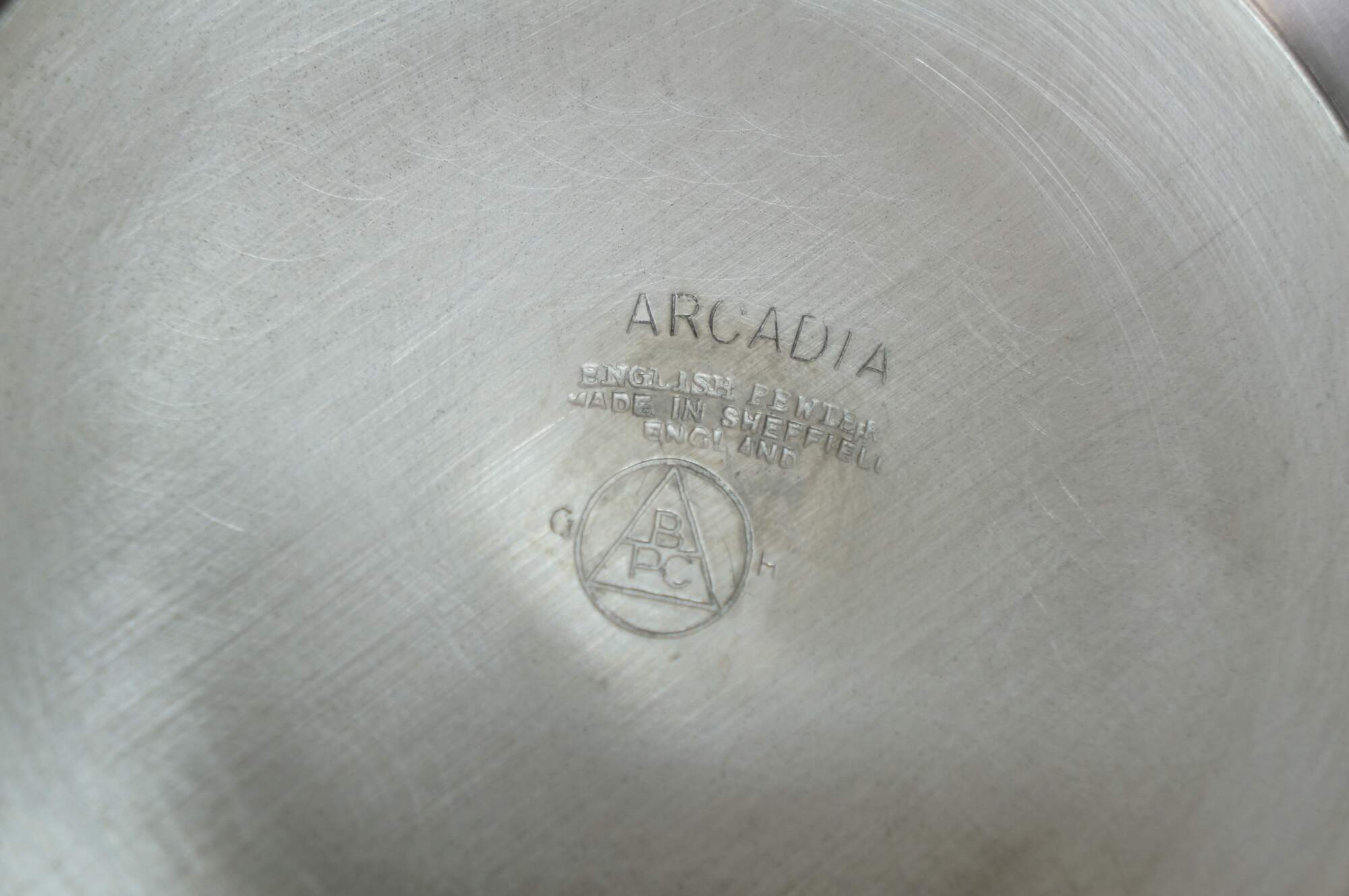 "Pinder Brothers Pewter, Sheffield, England. Produced pewter wares since 1963. / Arcadia Pewter. Trademark first used by George Lee & Company, Sheffield, England from 1929 to 1967. Taken over by Julius Isaacs & Company in 1967 who continued to use this mark. / Association of British Pewter Craftsmen, founded in 1970. Supported by the Worshipful Company of Pewterers who used the seahorse mark from 1980." (Pewter Society)