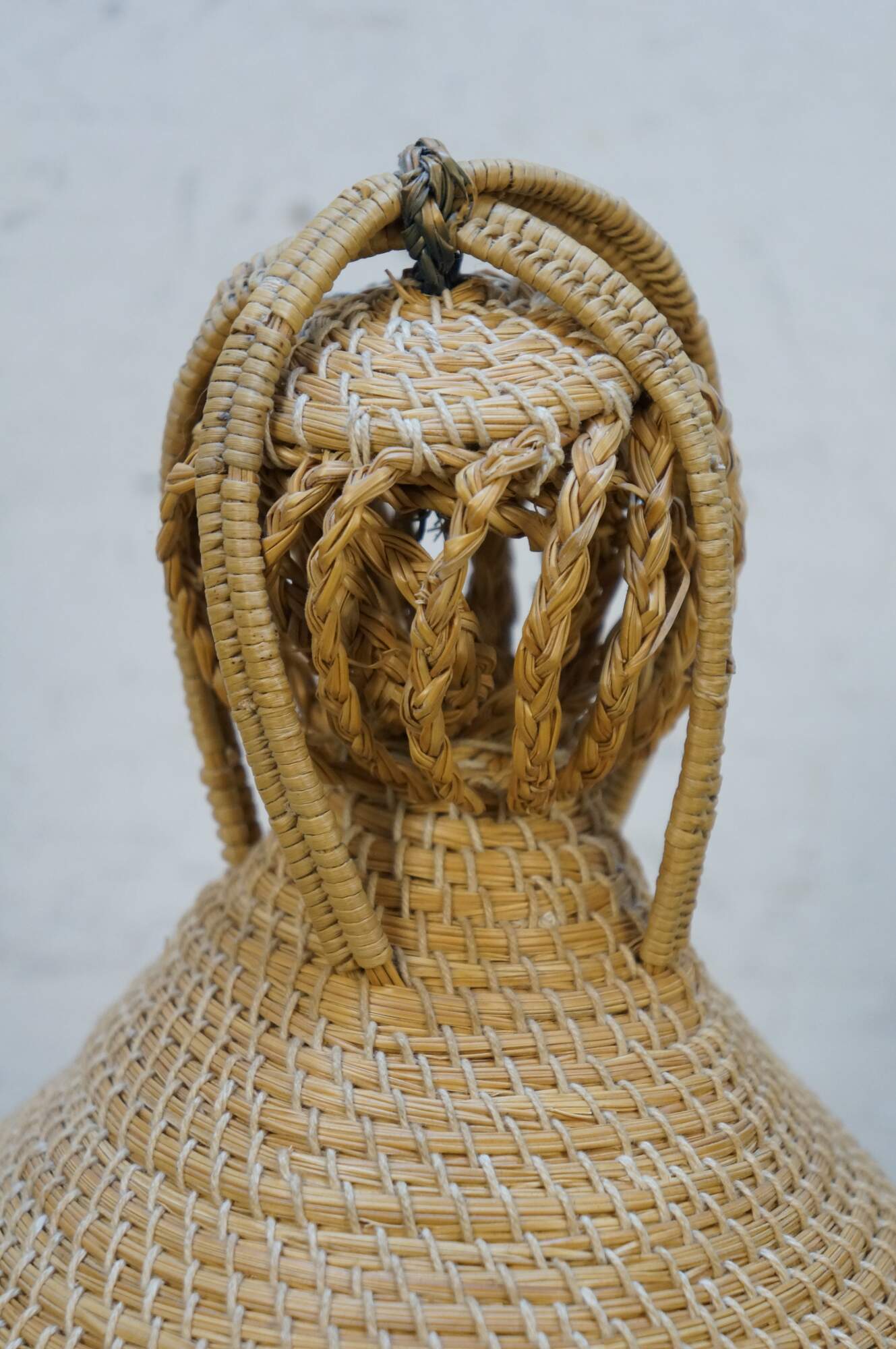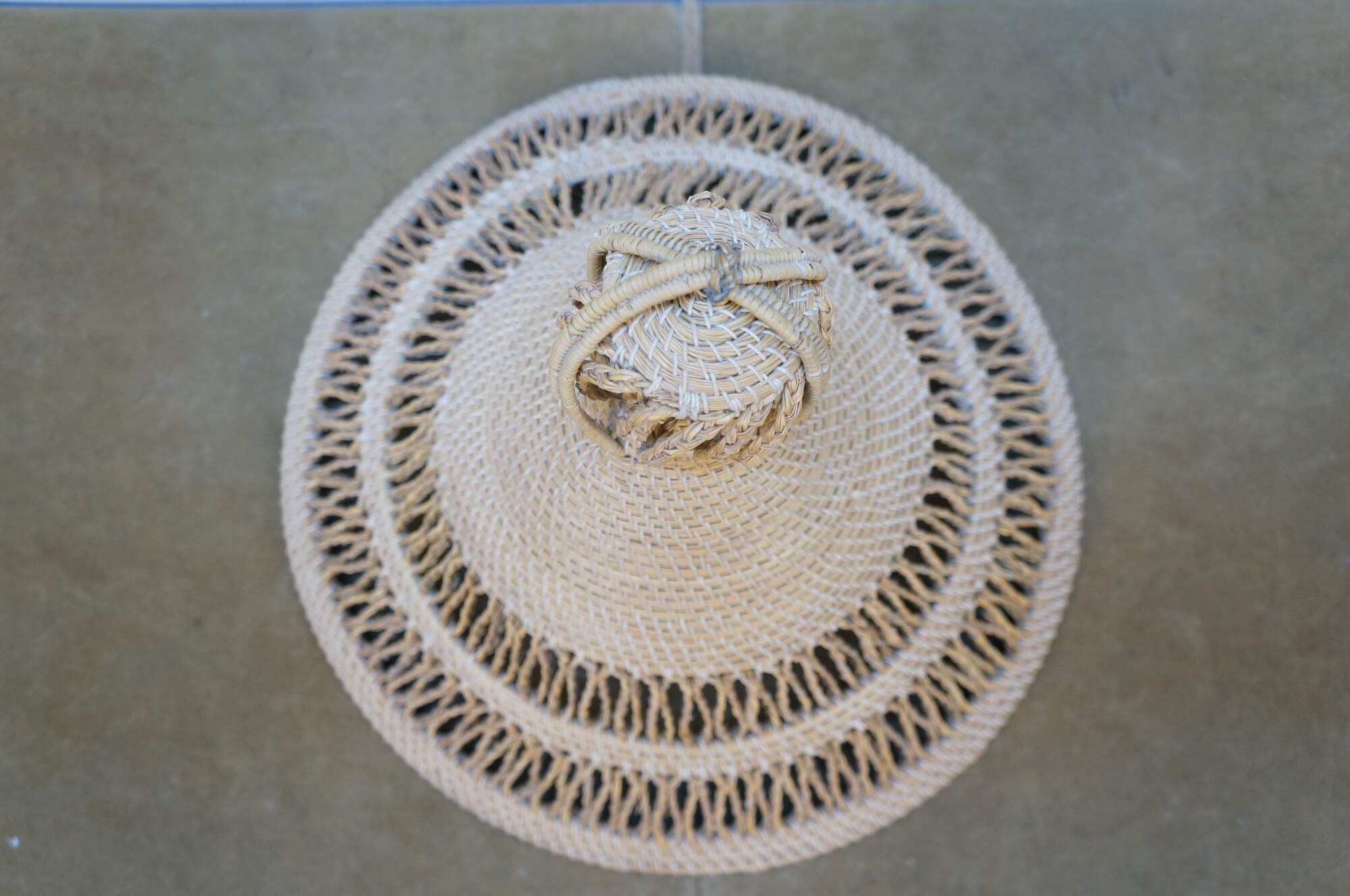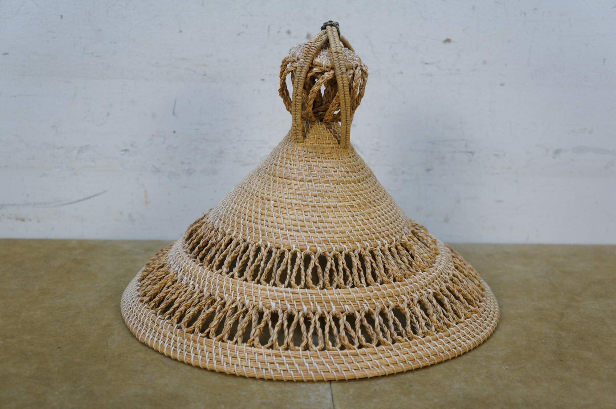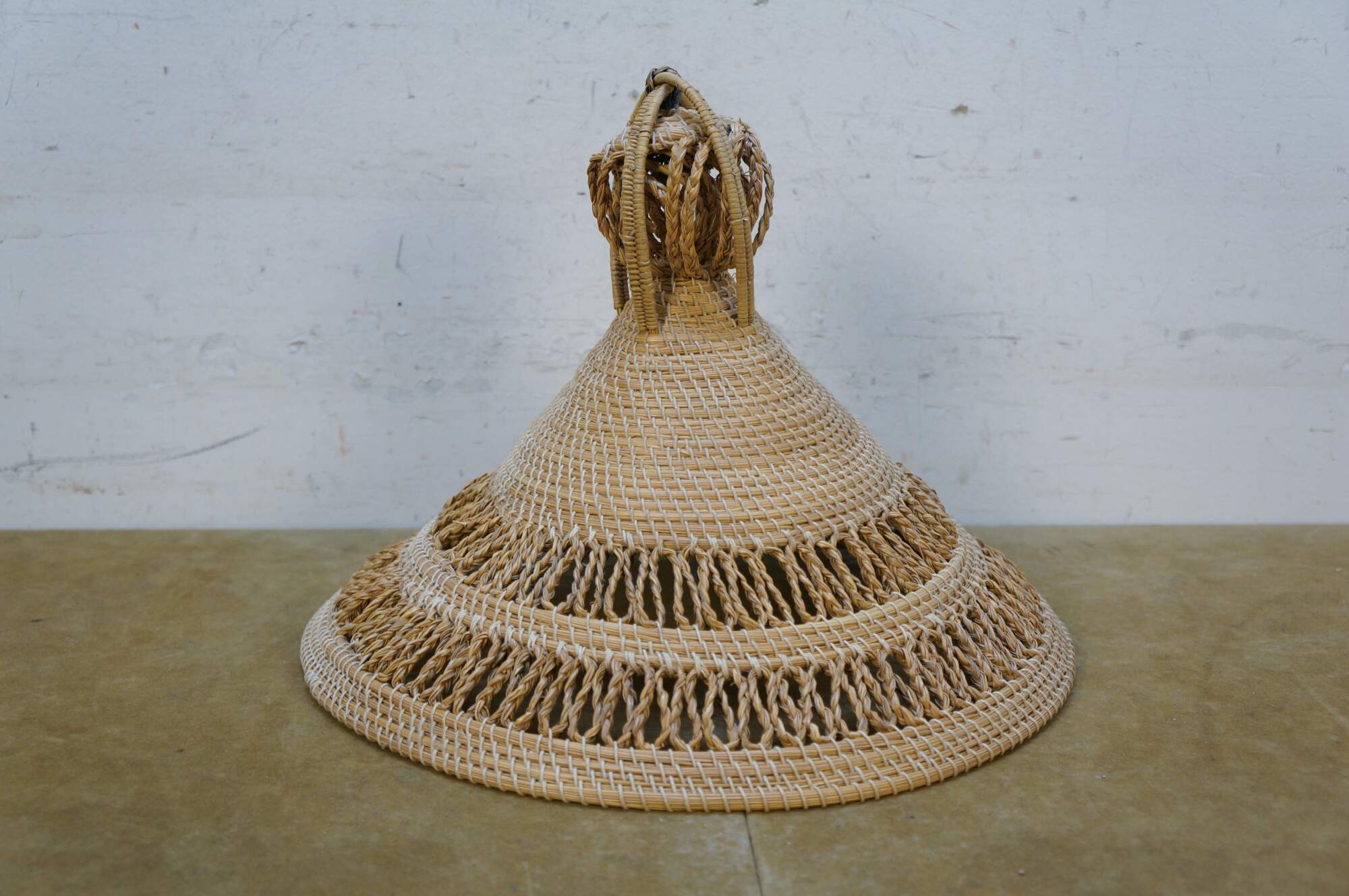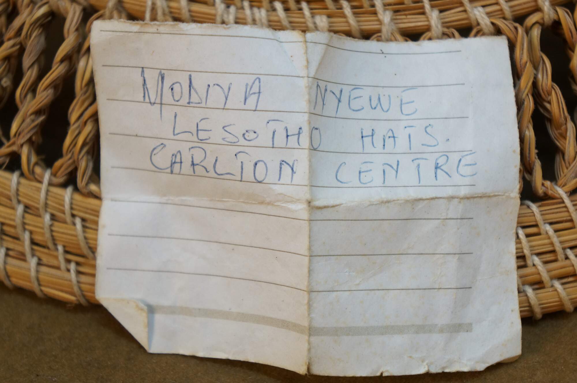 Late 20th century traditional Lesotho / Basotho mokorotlo hat. A conical hat of woven grass with knob on top.