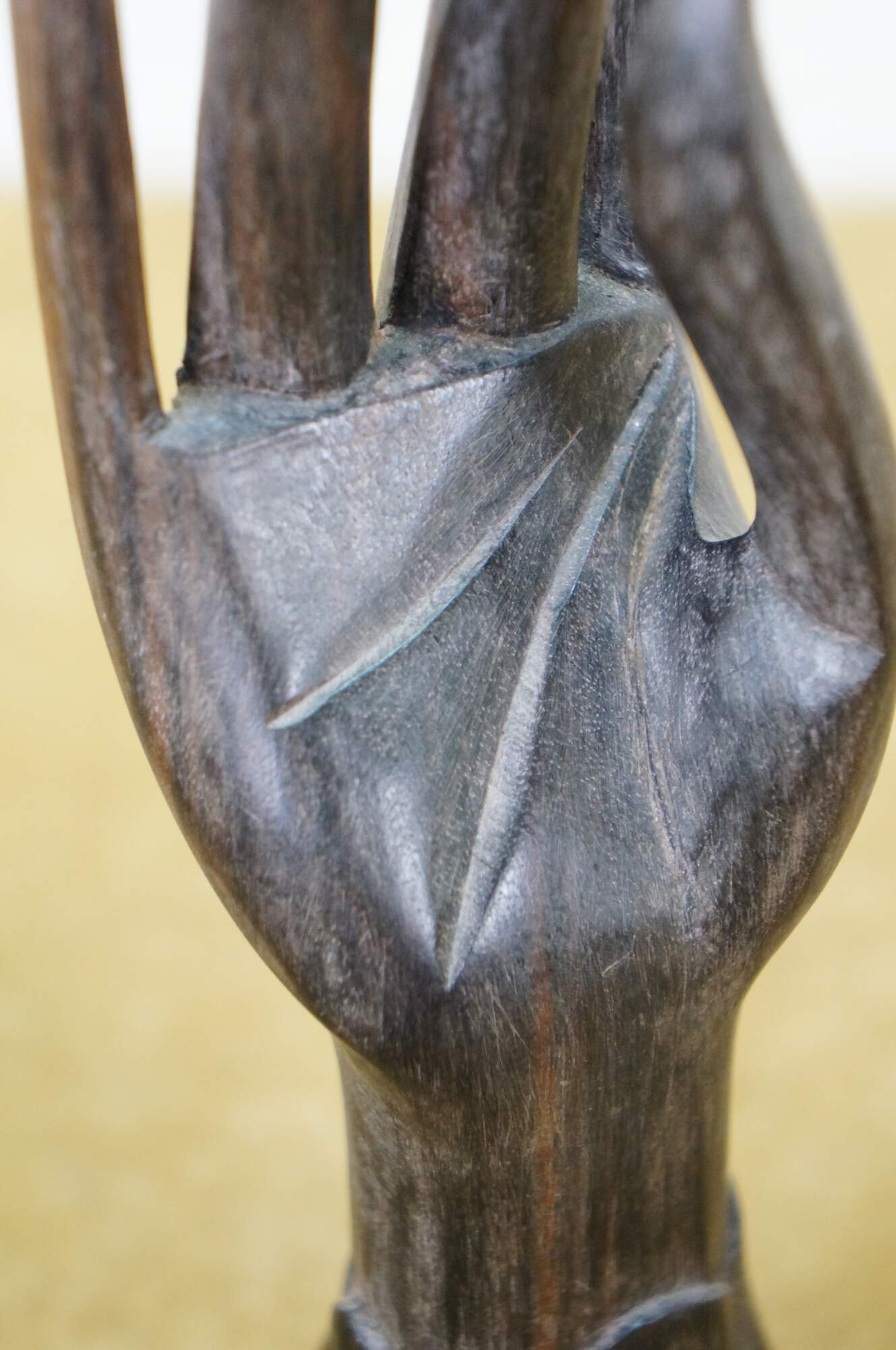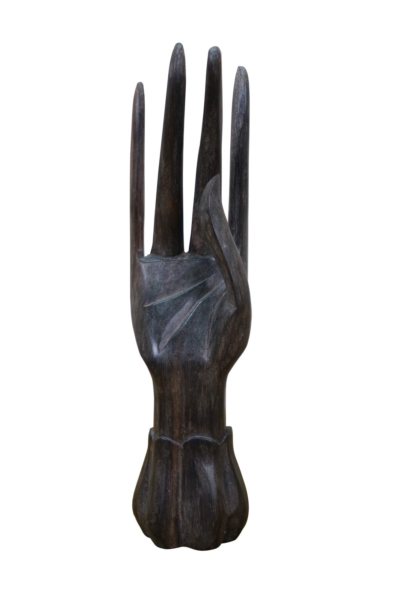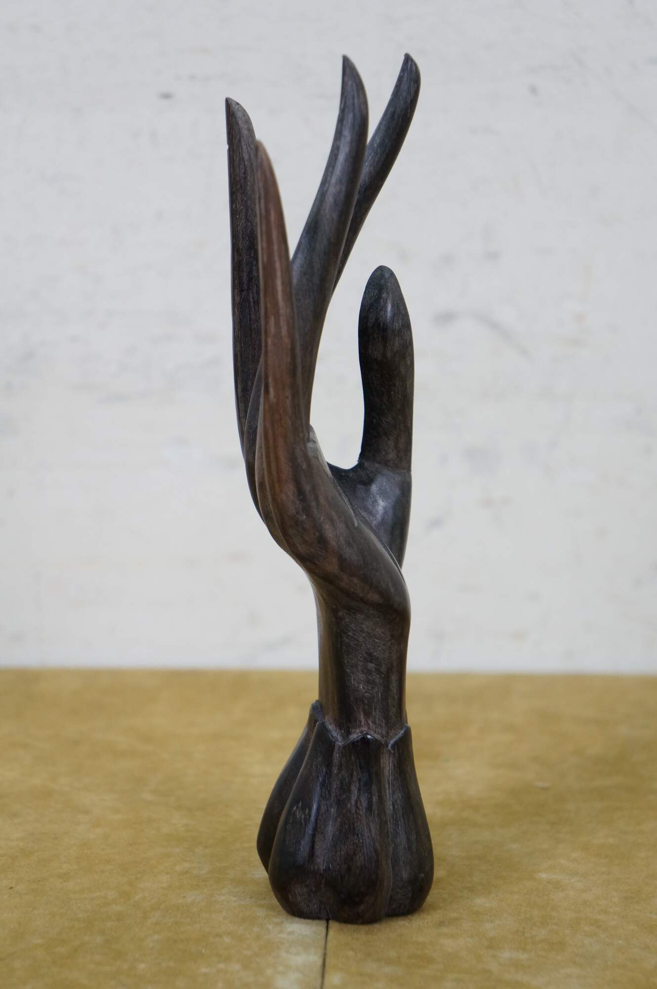 Vintage 20th century hand carved ebony wood sculpture in the shape of a stylized human hand with long fingers and a lobed, flower shaped base. Made in Moorea (French Polynesia).