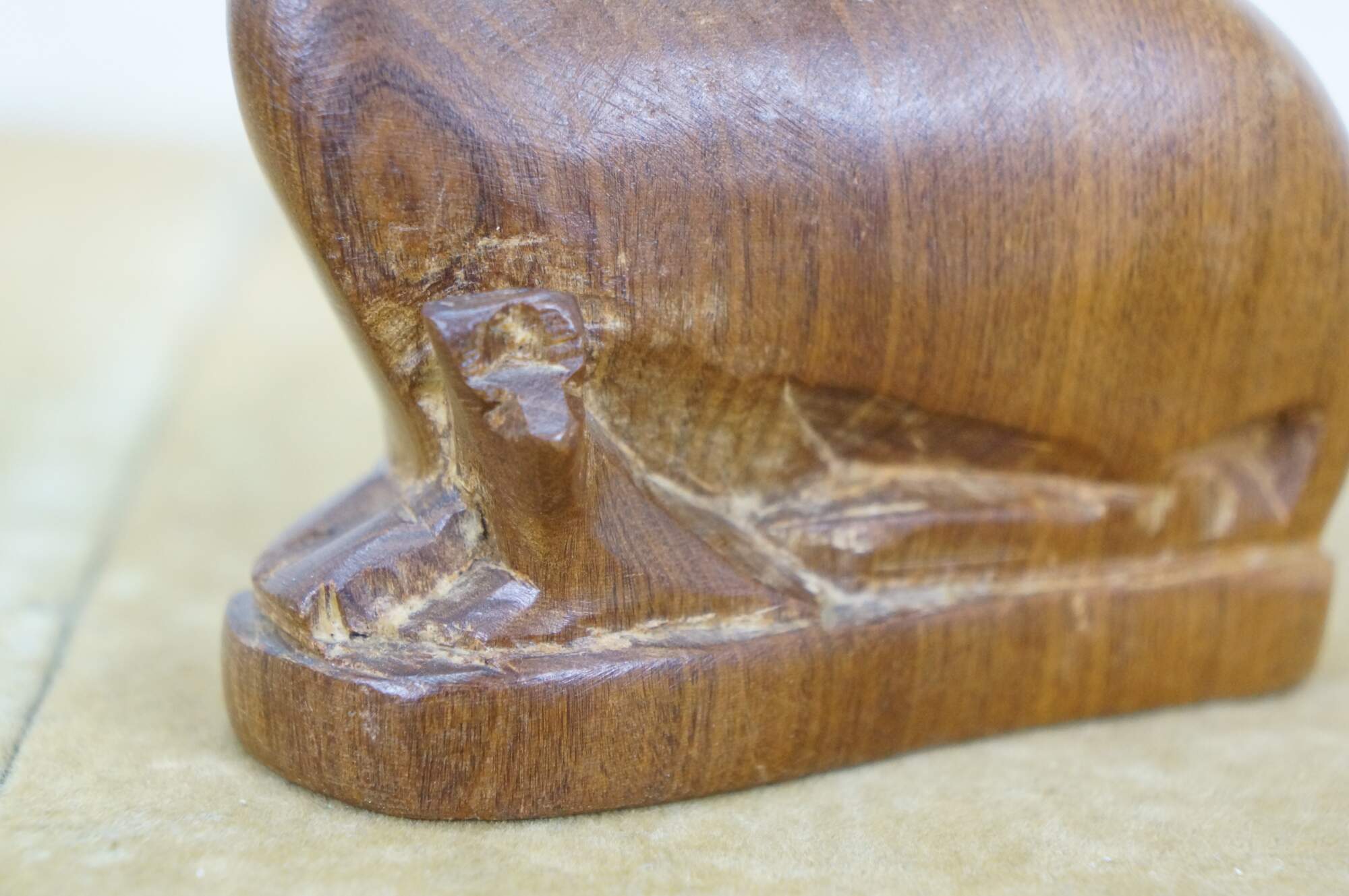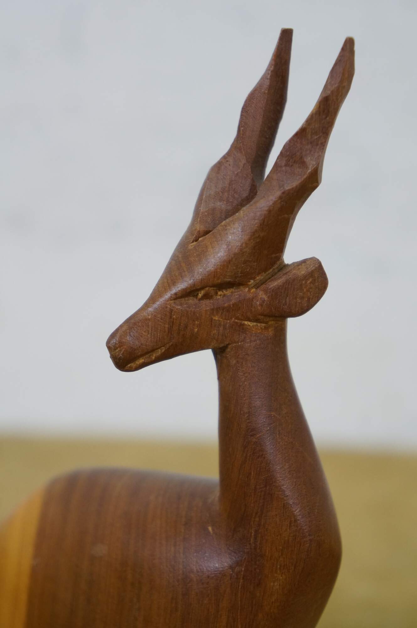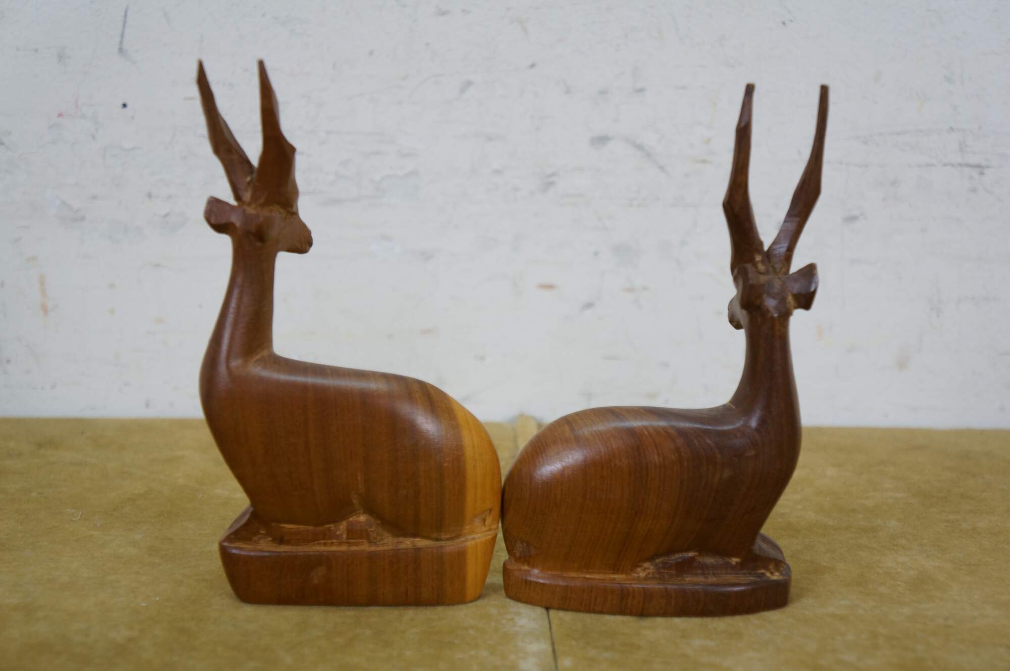 Pair of mid to late 20th century hand-carved mahogany wood figurines depicting a family of gazelles, impalas, or antelopes lying on the ground, one alone and one with a calf.
