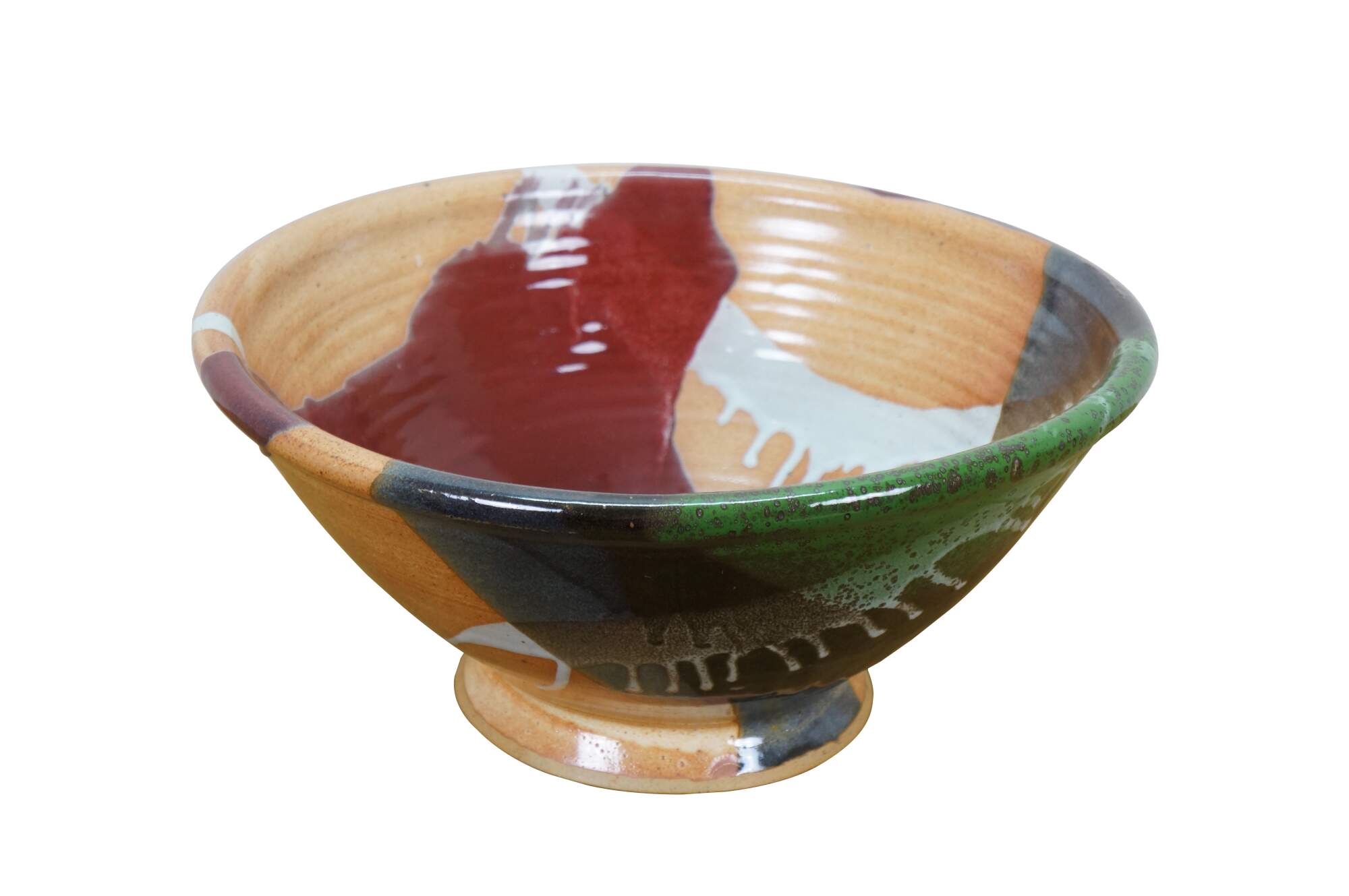 A very large and impressive late 20th century stoneware studio art pottery fruit centerpiece / footed serving bowl, featuring an abstract multicolored dripped and spattered glazed design.