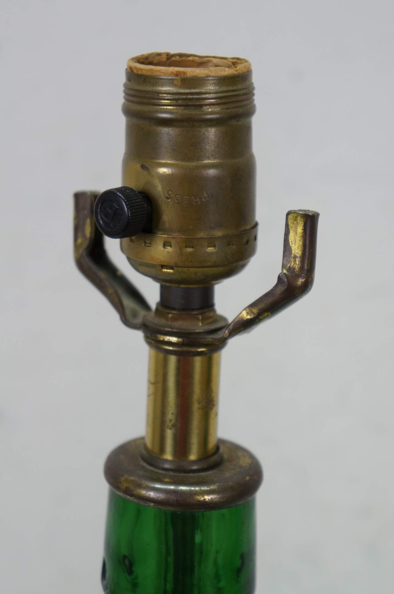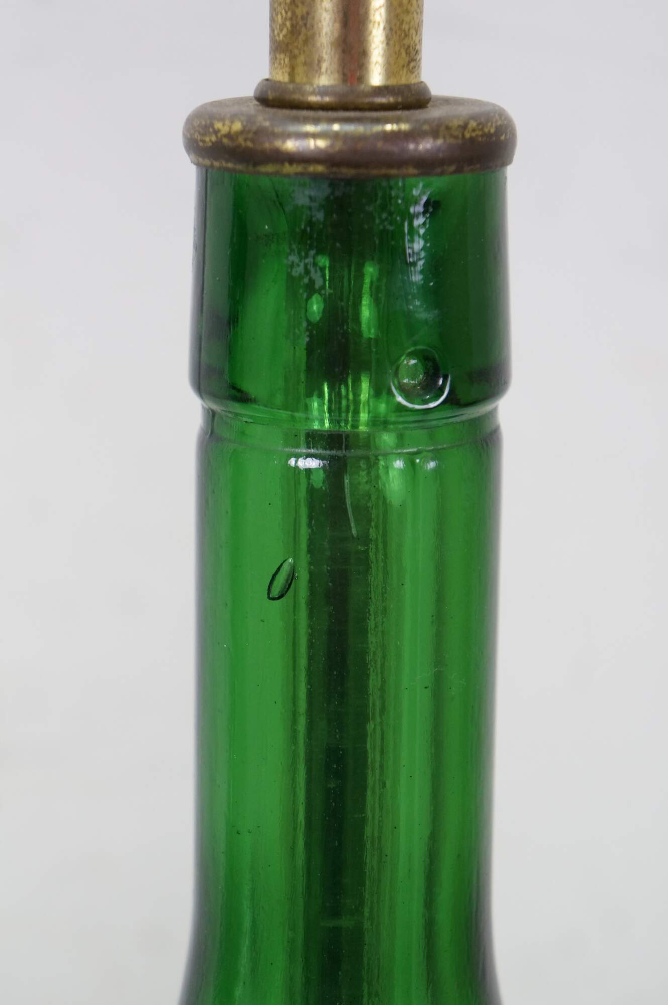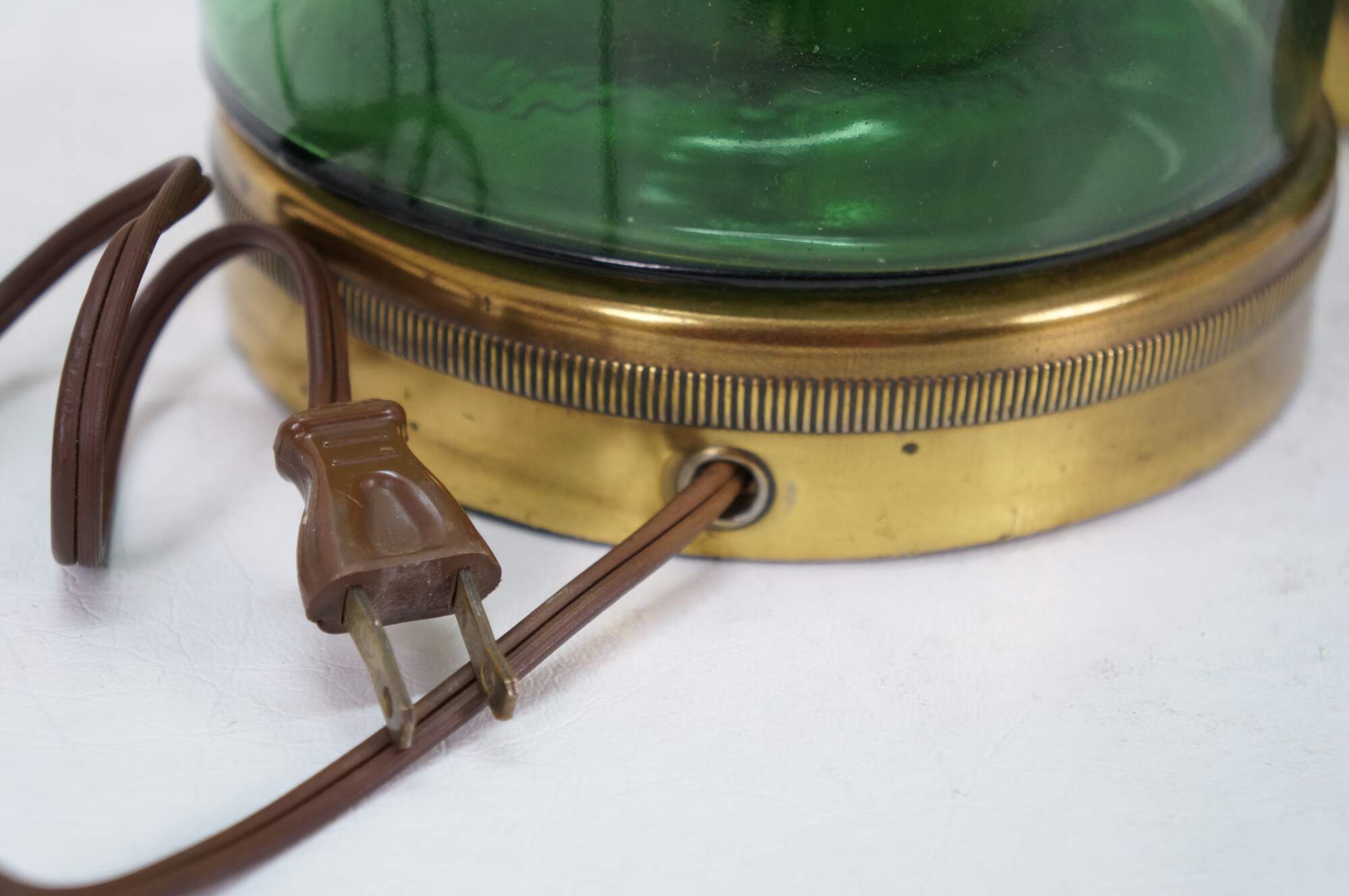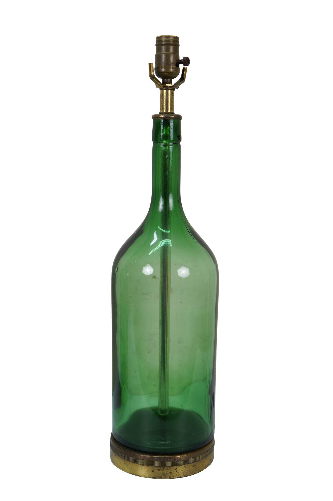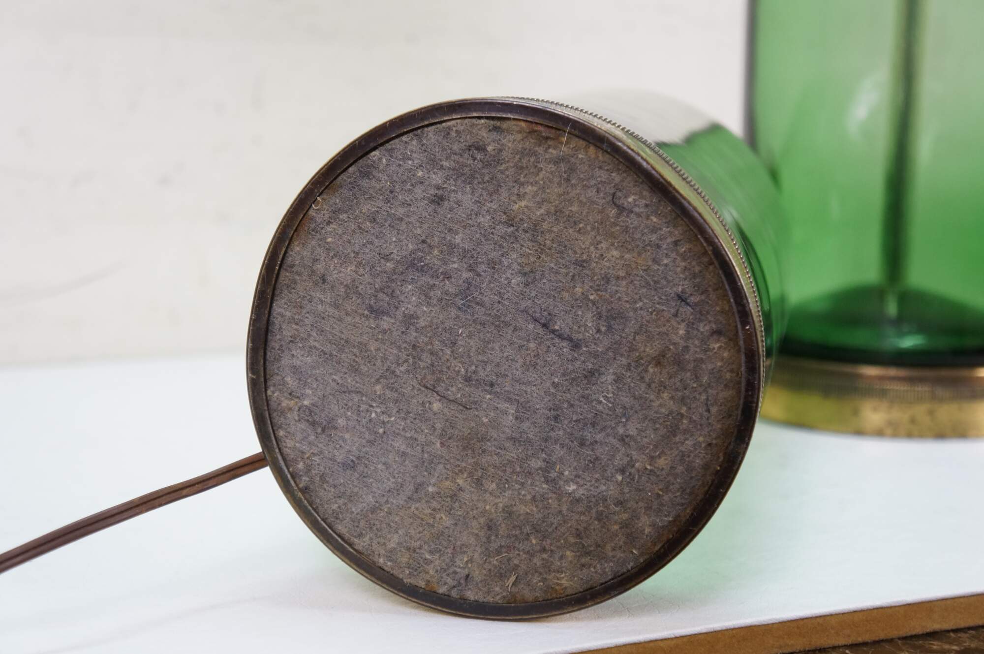 Pair of vintage 20th century tall dark green glass bottles converted into table lamps with round brass bases.