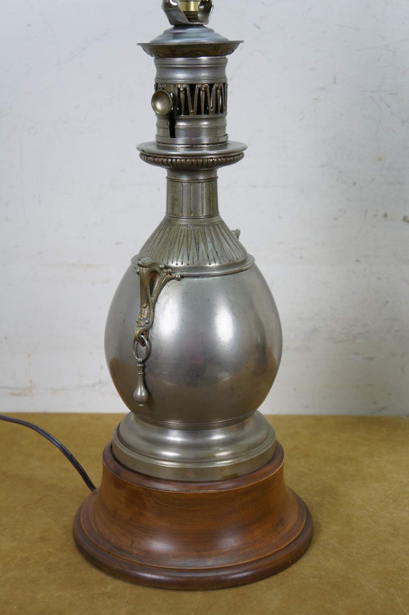 Pair of vintage 20th century brushed silver converted oil table lamps. Urn shaped bodies with neoclassical details and serpent shaped handles; round painted wood grain base. Includes harps, urn shaped finials and white fabric shades.