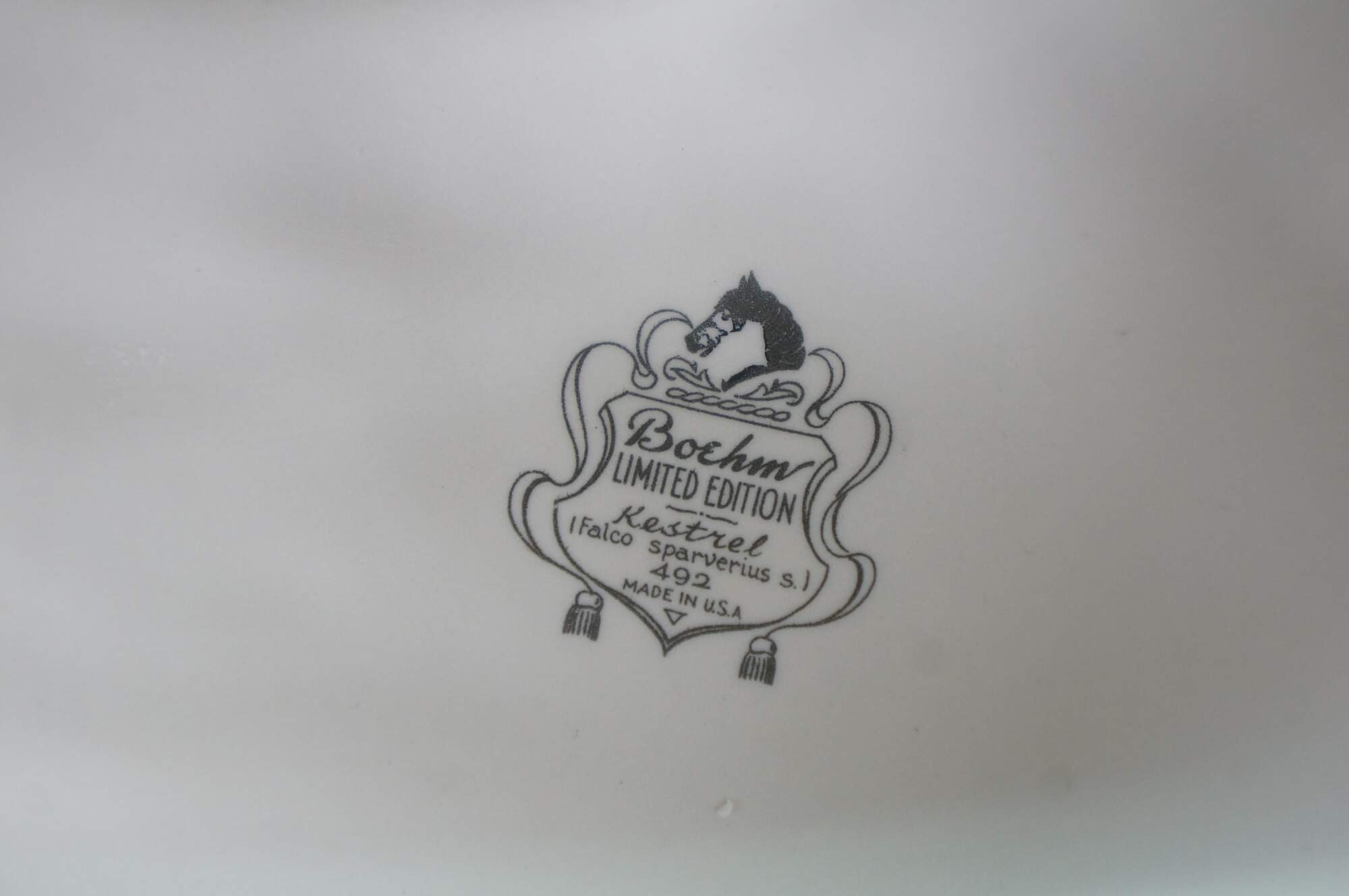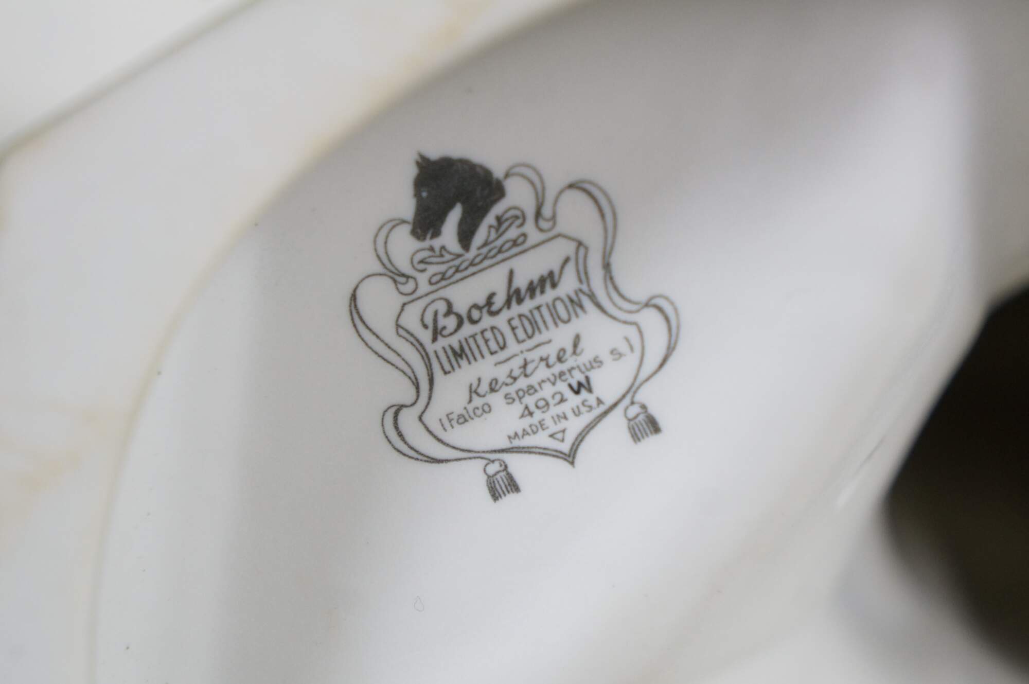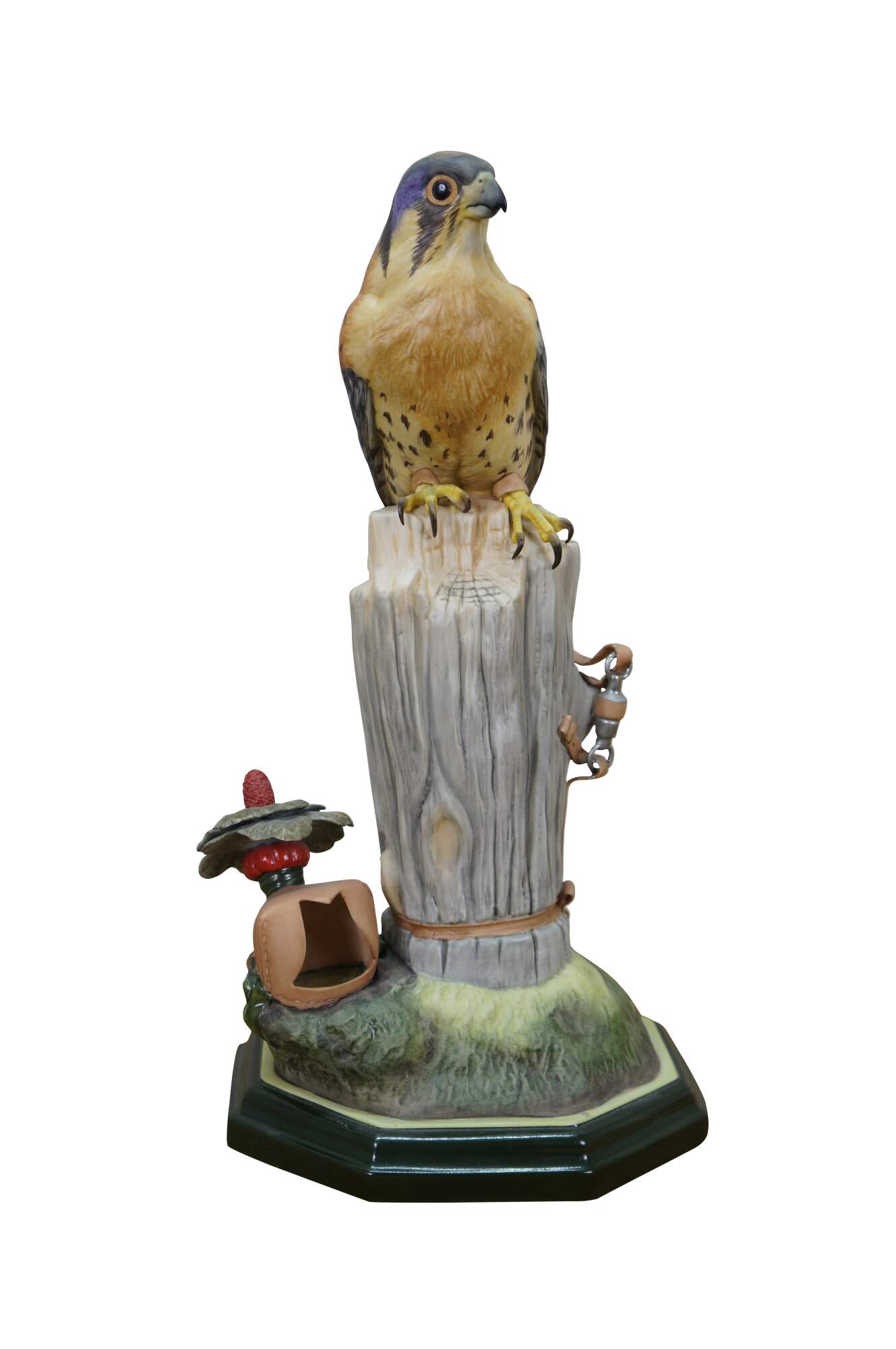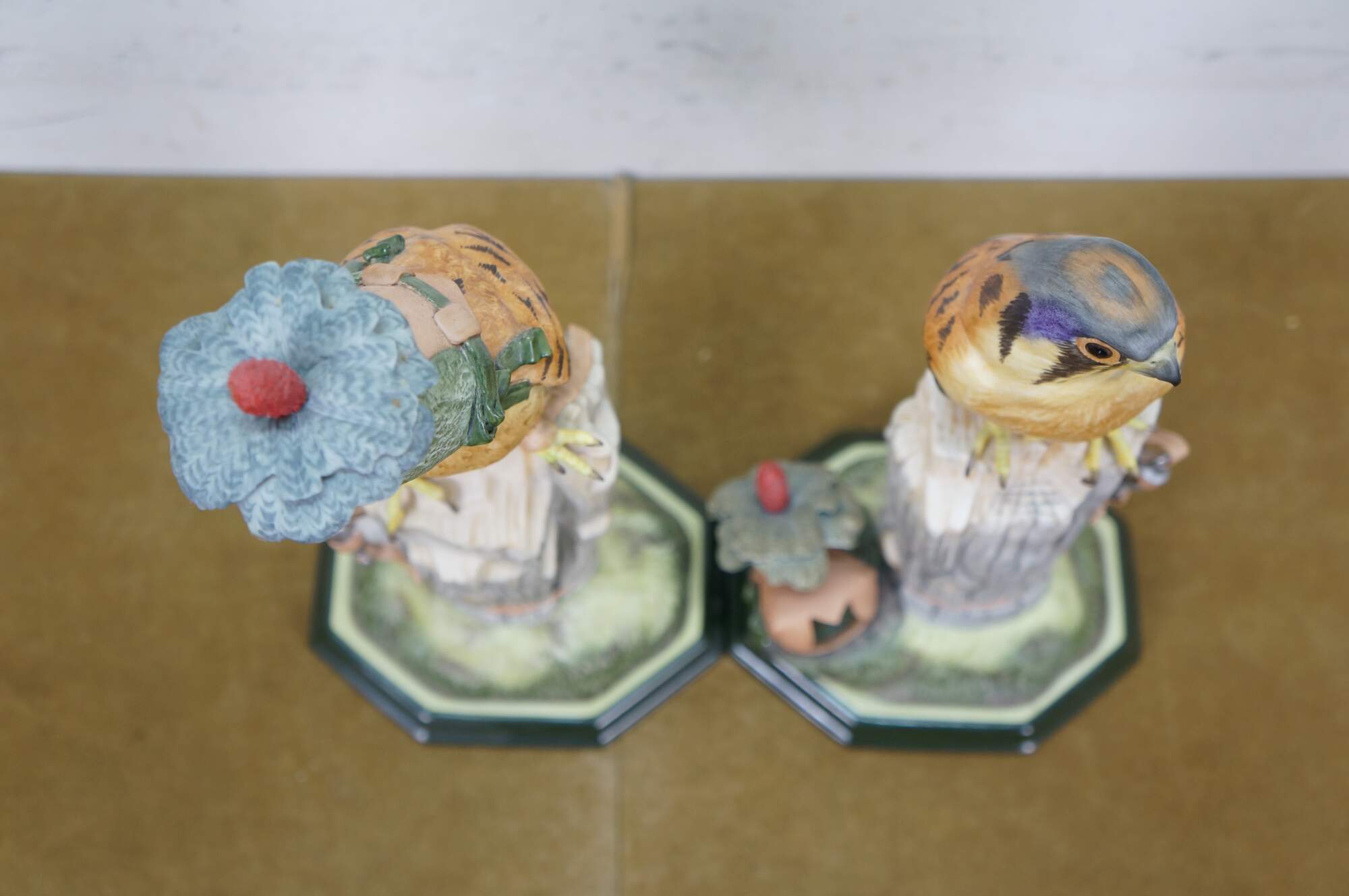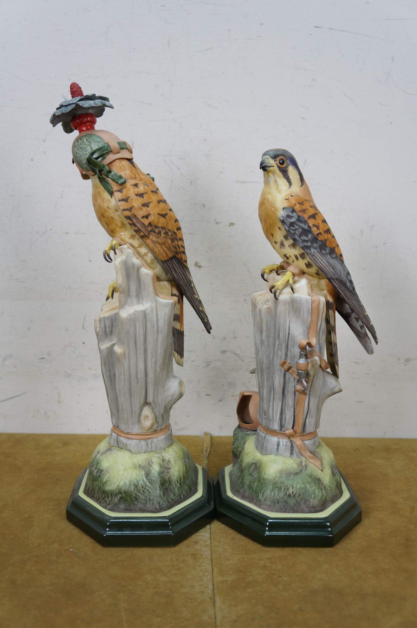 Circa mid 20th century Boehm Limited Edition porcelain Kestrel Falcons (Falco sparverius s.) number 492 and 492W figurines / sculptures. Depicts a pair of kestrels tethered to tree stumps, decked out for hunting with plumed leather hoods. Made in USA.